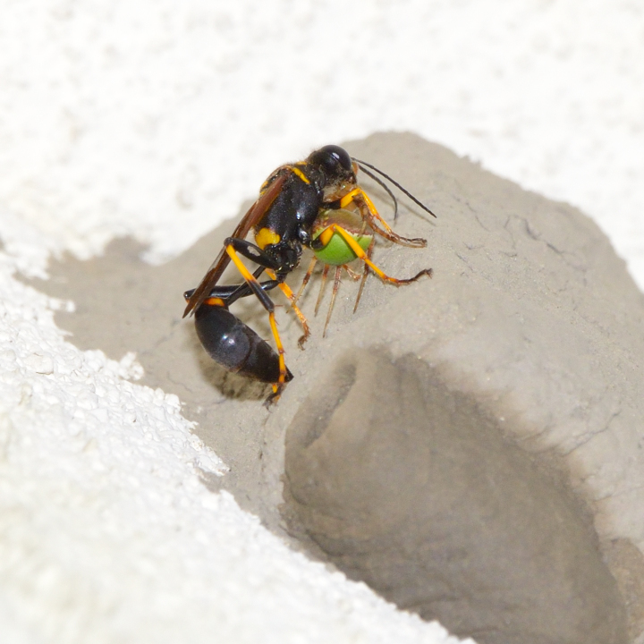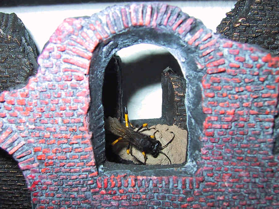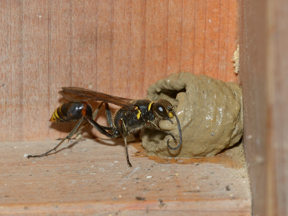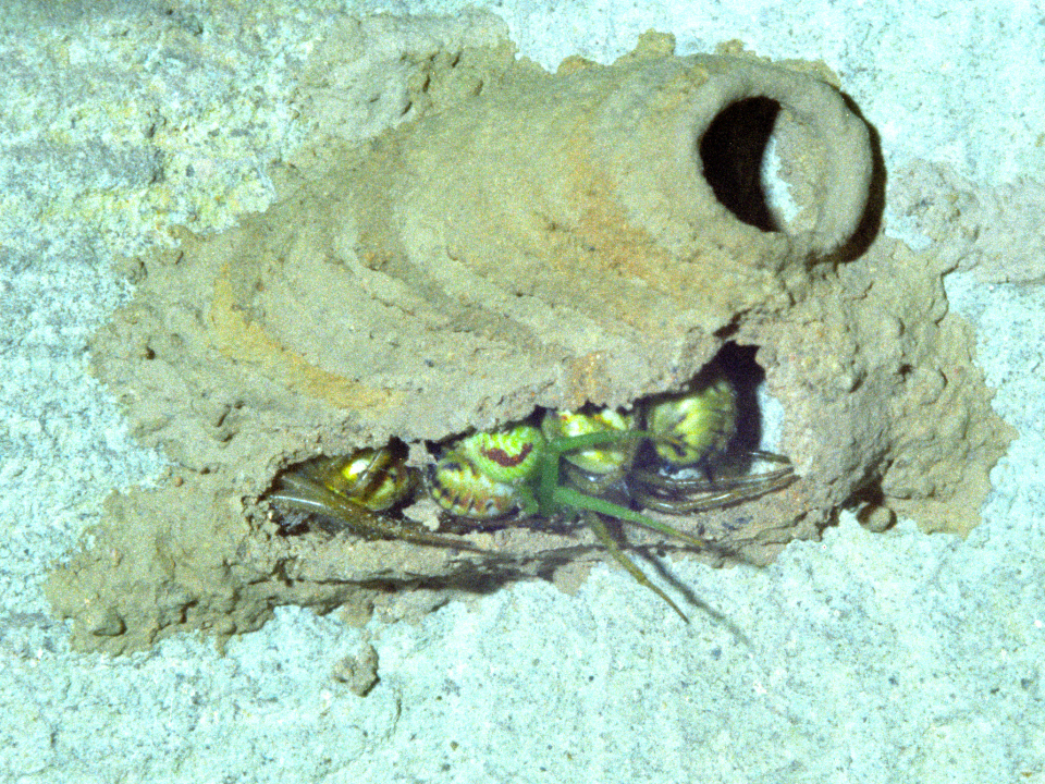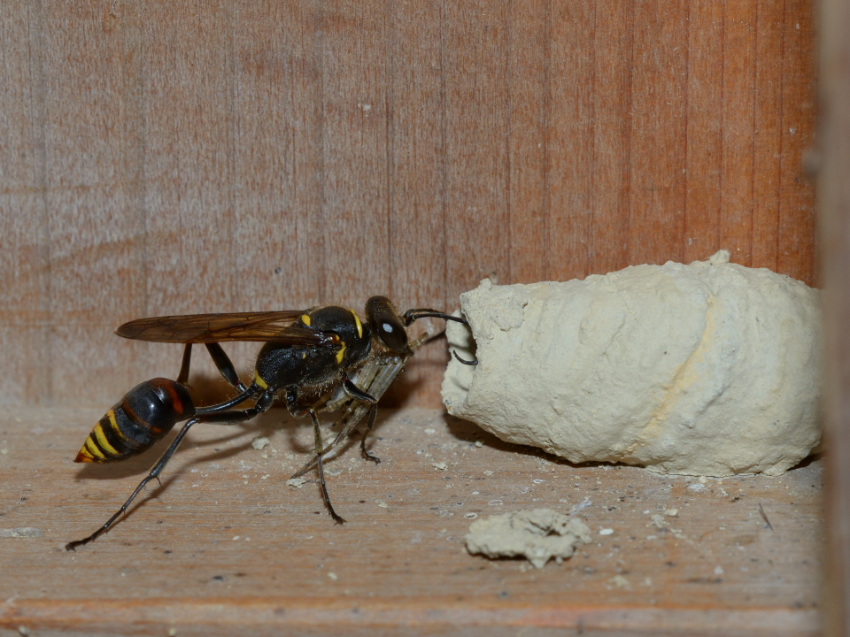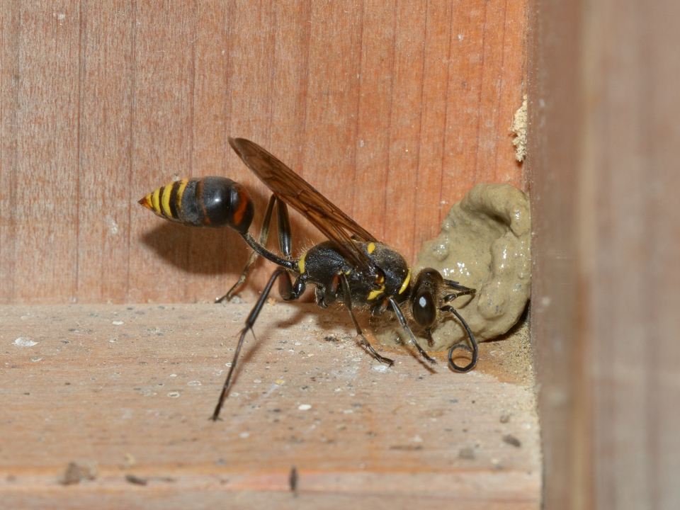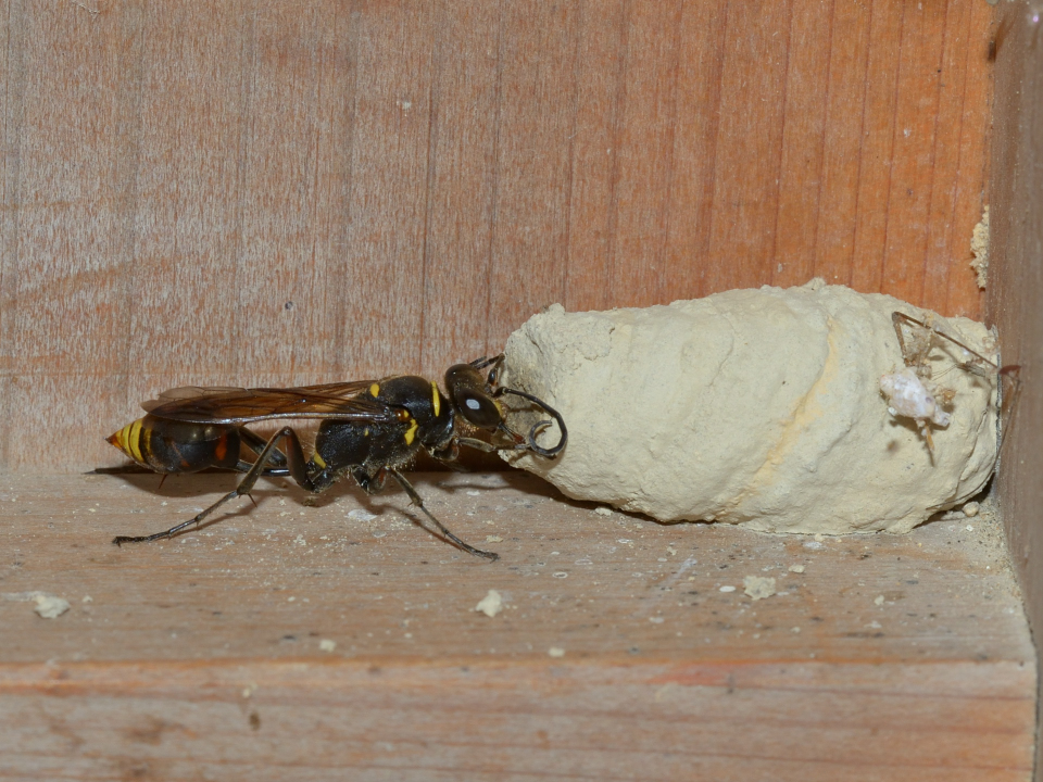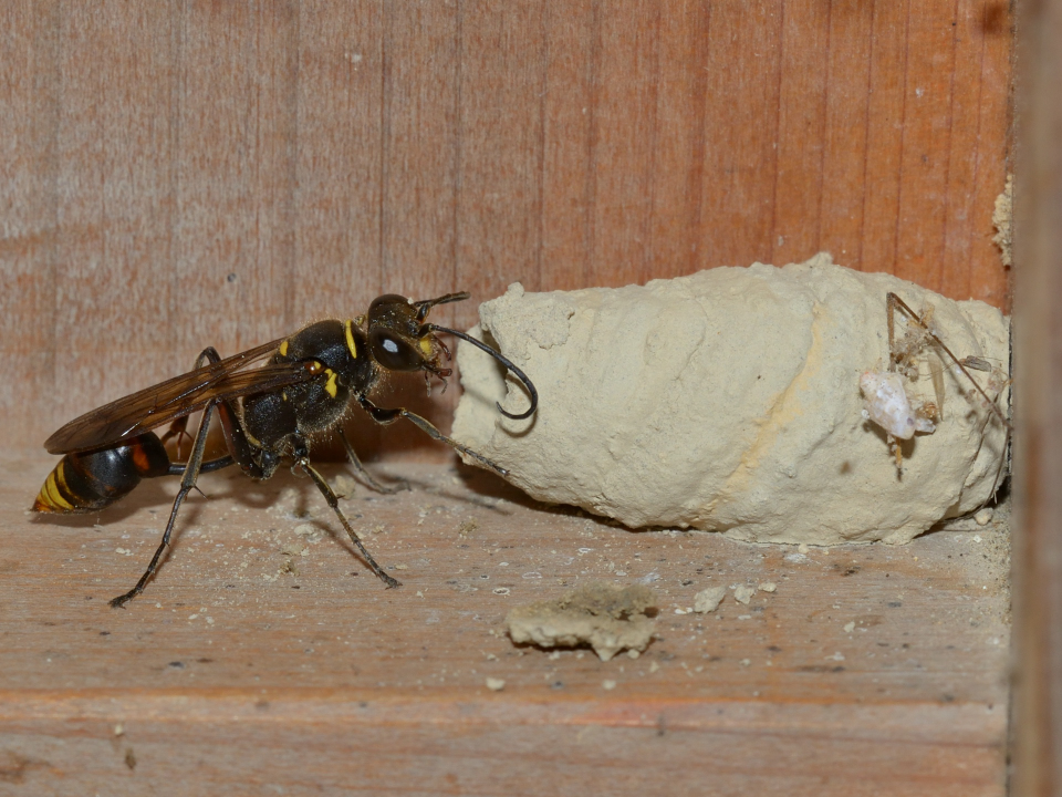 高い建物の軒下や、祠・石材等の半閉鎖空間等に、土で長い蛸壺型の育房を複数作り、蜘蛛を搬入して産卵する。