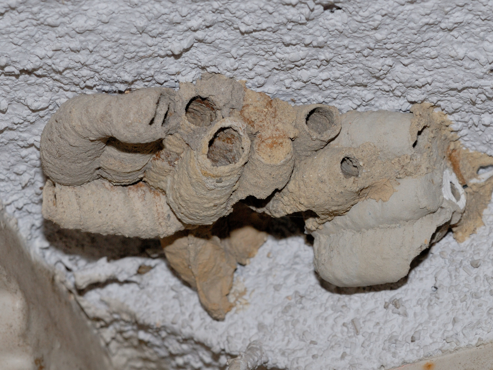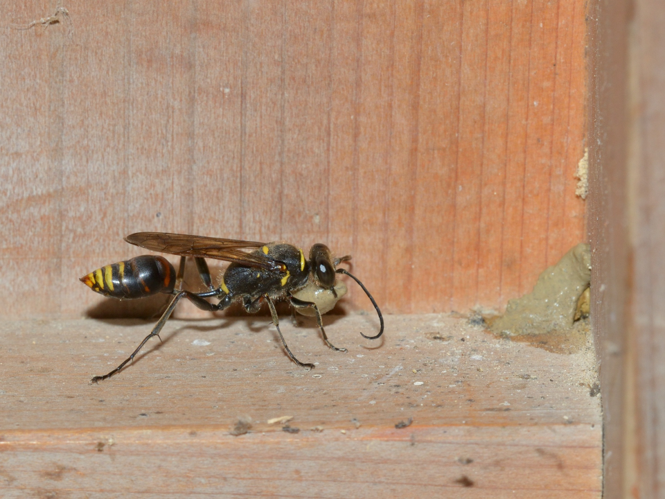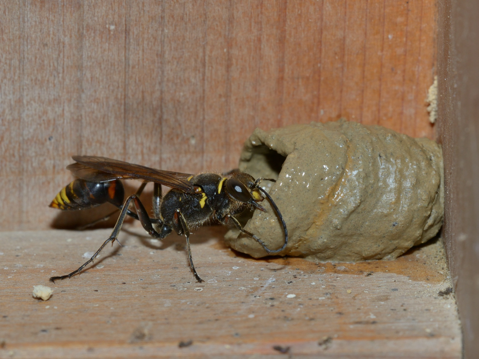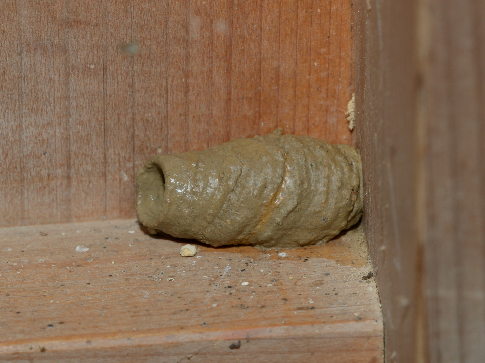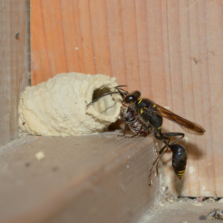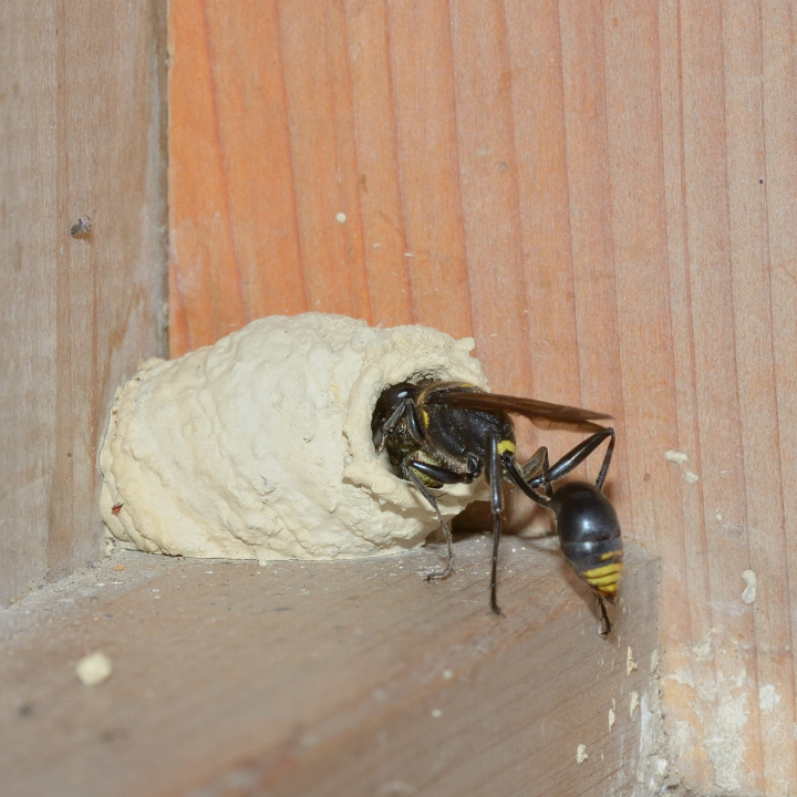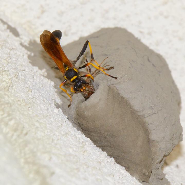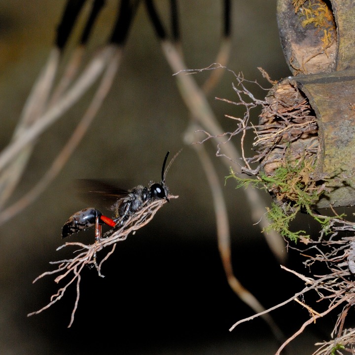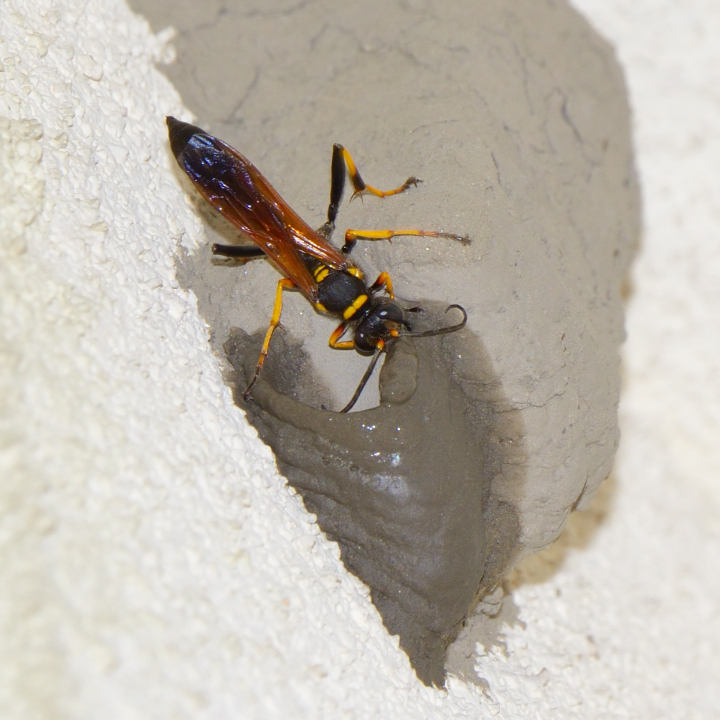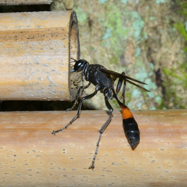 高い建物の軒下や、祠・石材等の半閉鎖空間等に、土で長い蛸壺型の育房を複数作り、蜘蛛を搬入して産卵する。