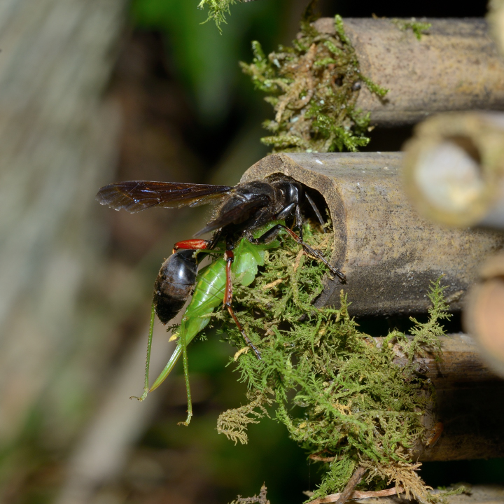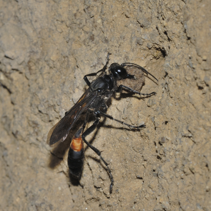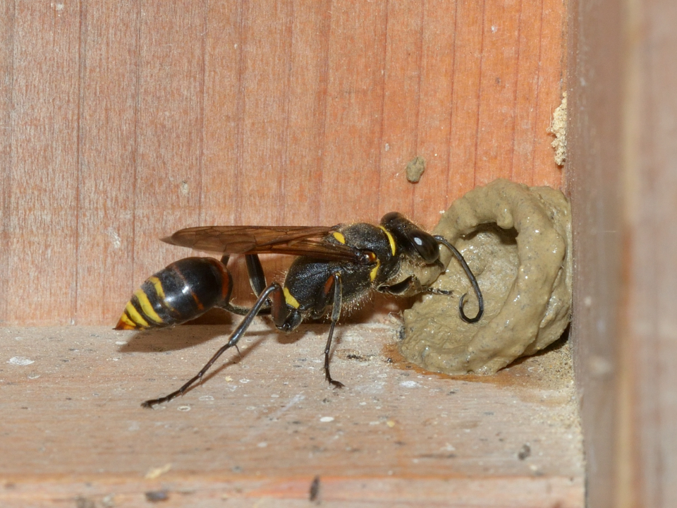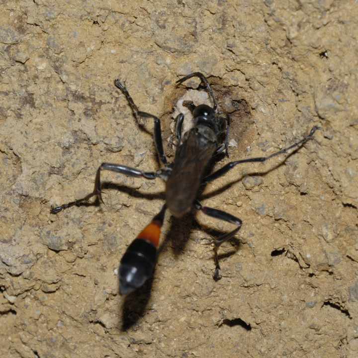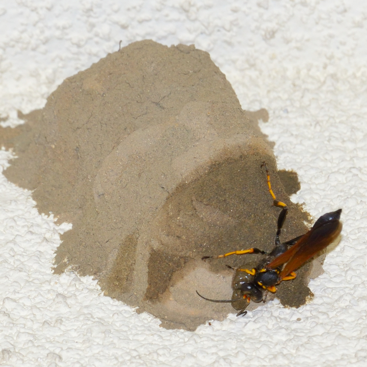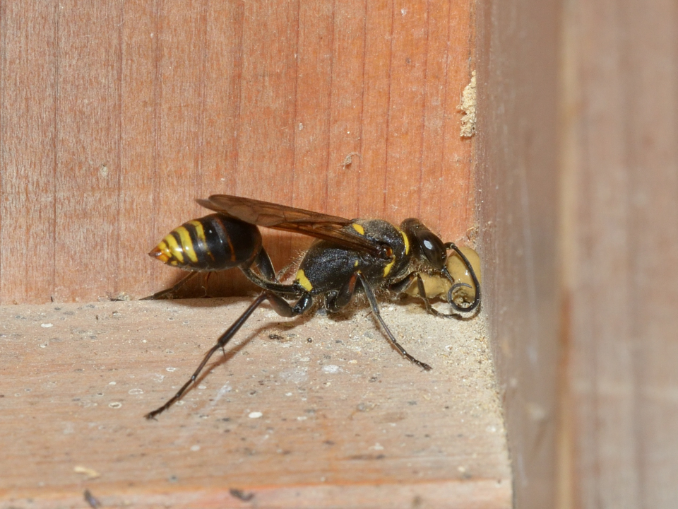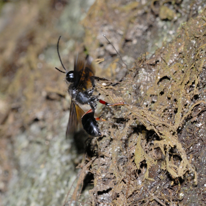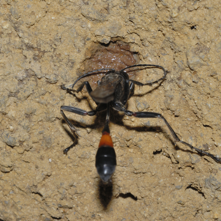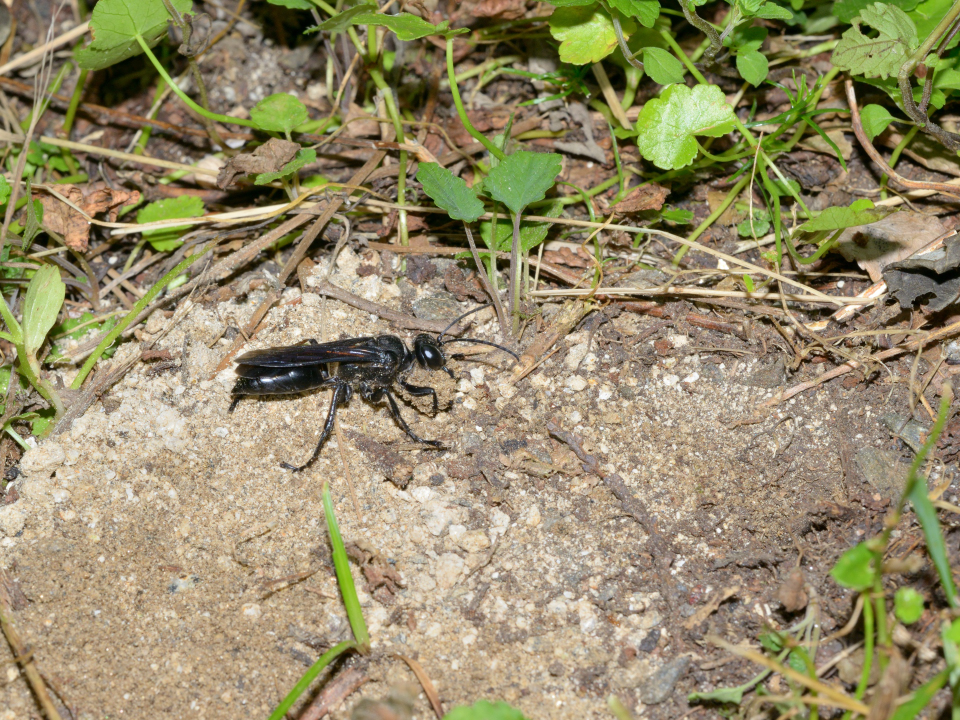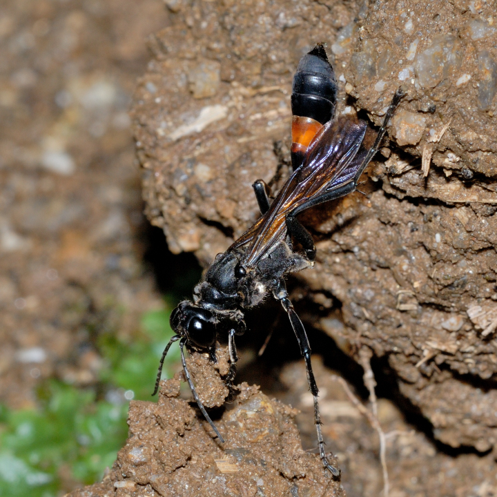 高い建物の軒下や、祠・石材等の半閉鎖空間等に、土で長い蛸壺型の育房を複数作り、蜘蛛を搬入して産卵する。