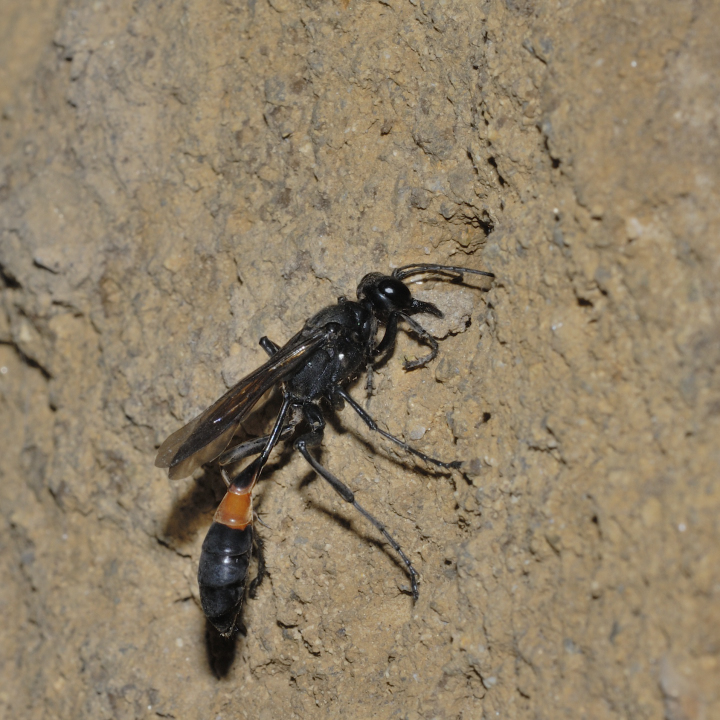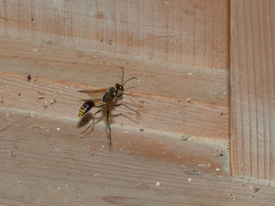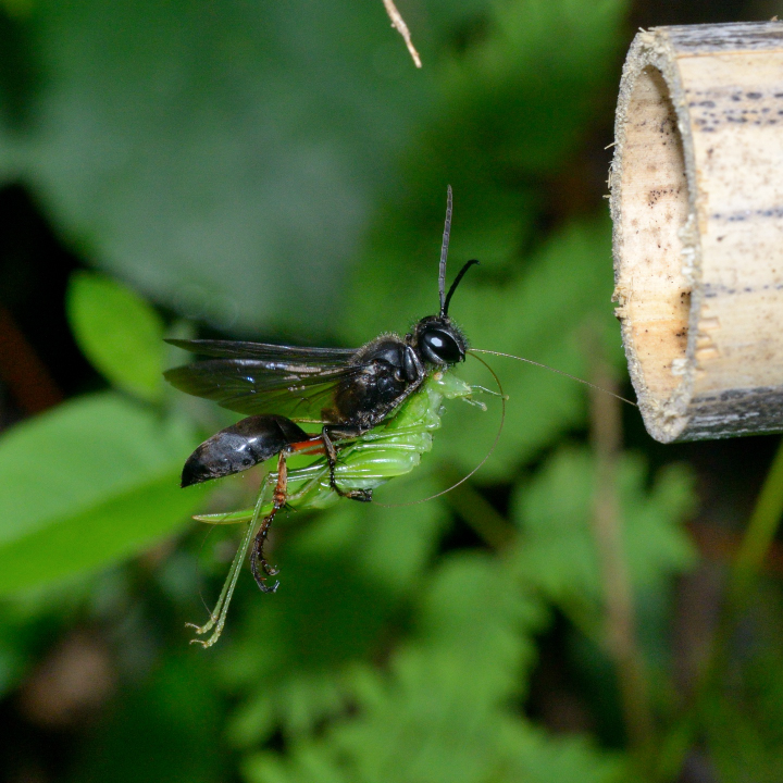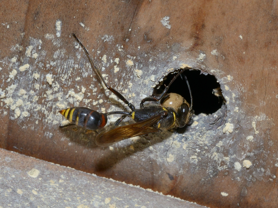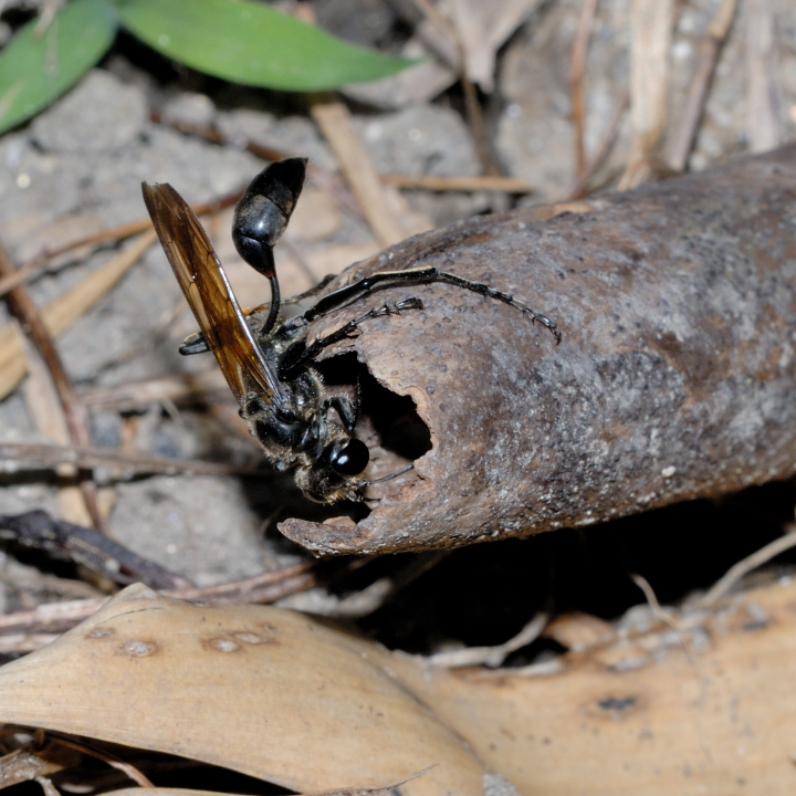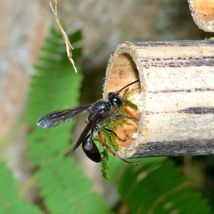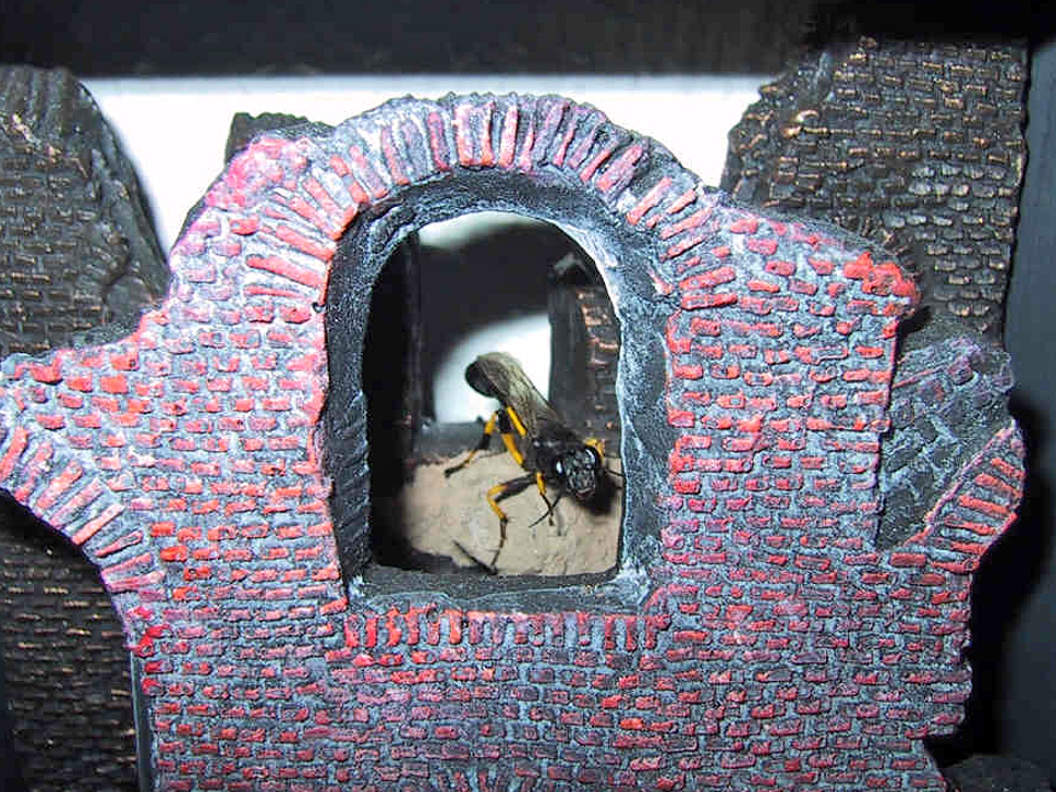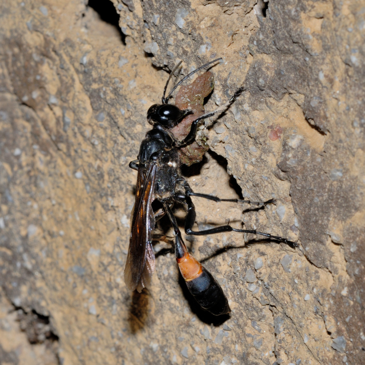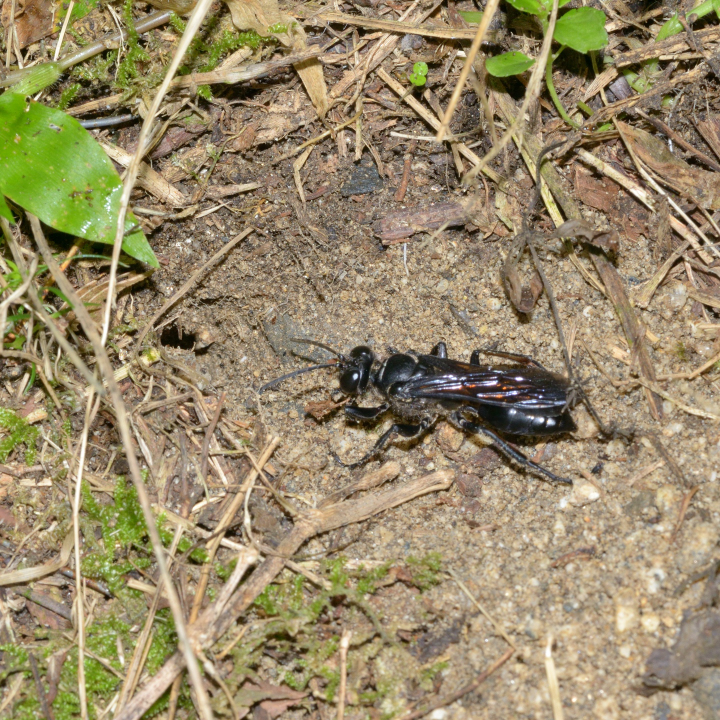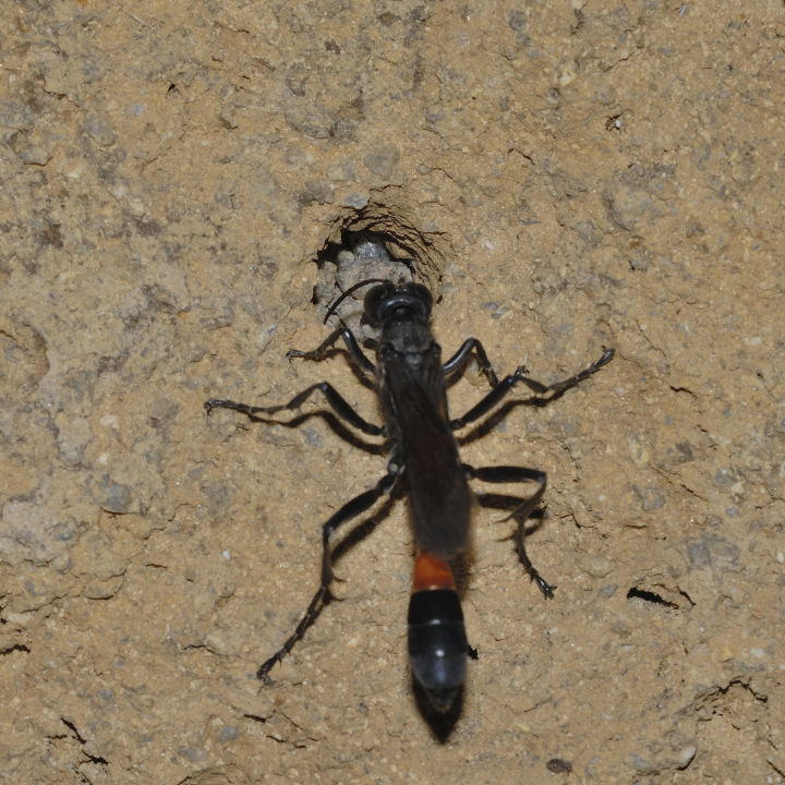 高い建物の軒下や、祠・石材等の半閉鎖空間等に、土で長い蛸壺型の育房を複数作り、蜘蛛を搬入して産卵する。