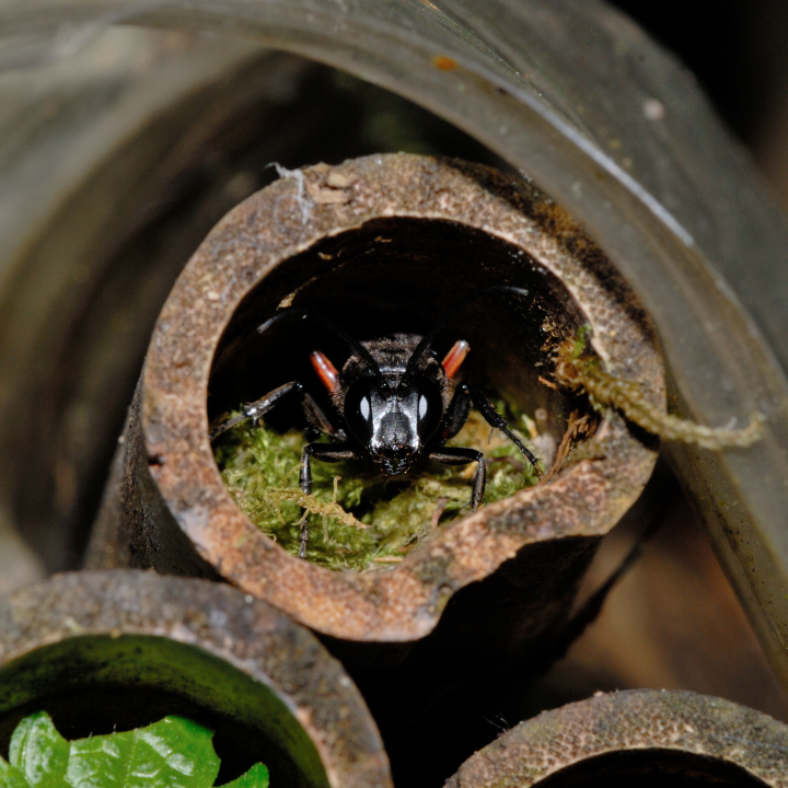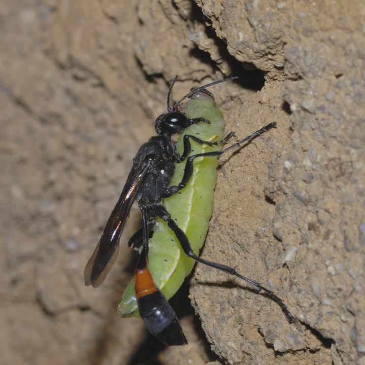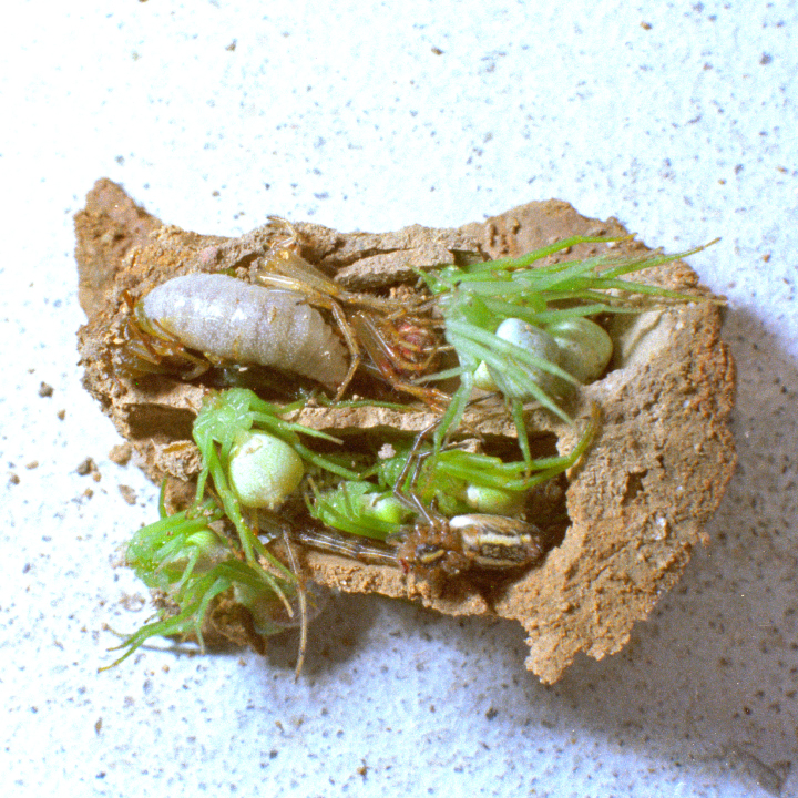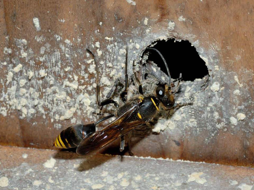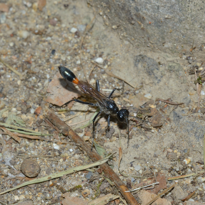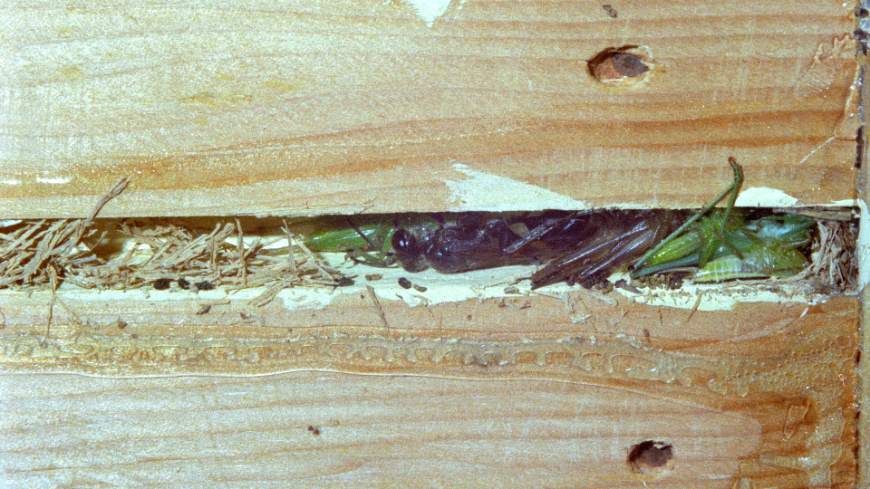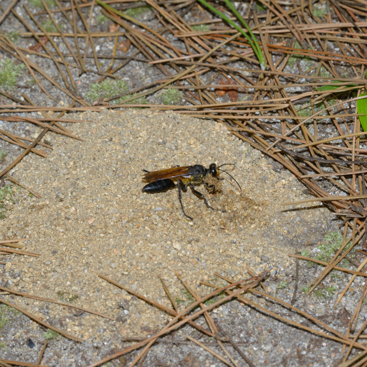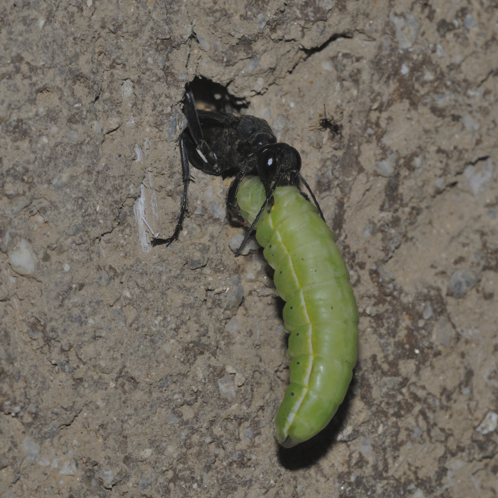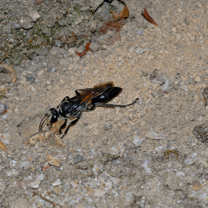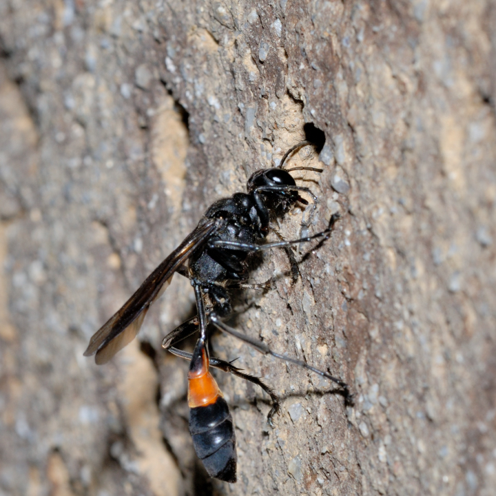 高い建物の軒下や、祠・石材等の半閉鎖空間等に、土で長い蛸壺型の育房を複数作り、蜘蛛を搬入して産卵する。