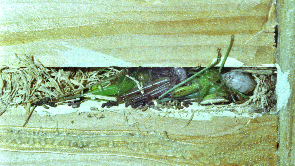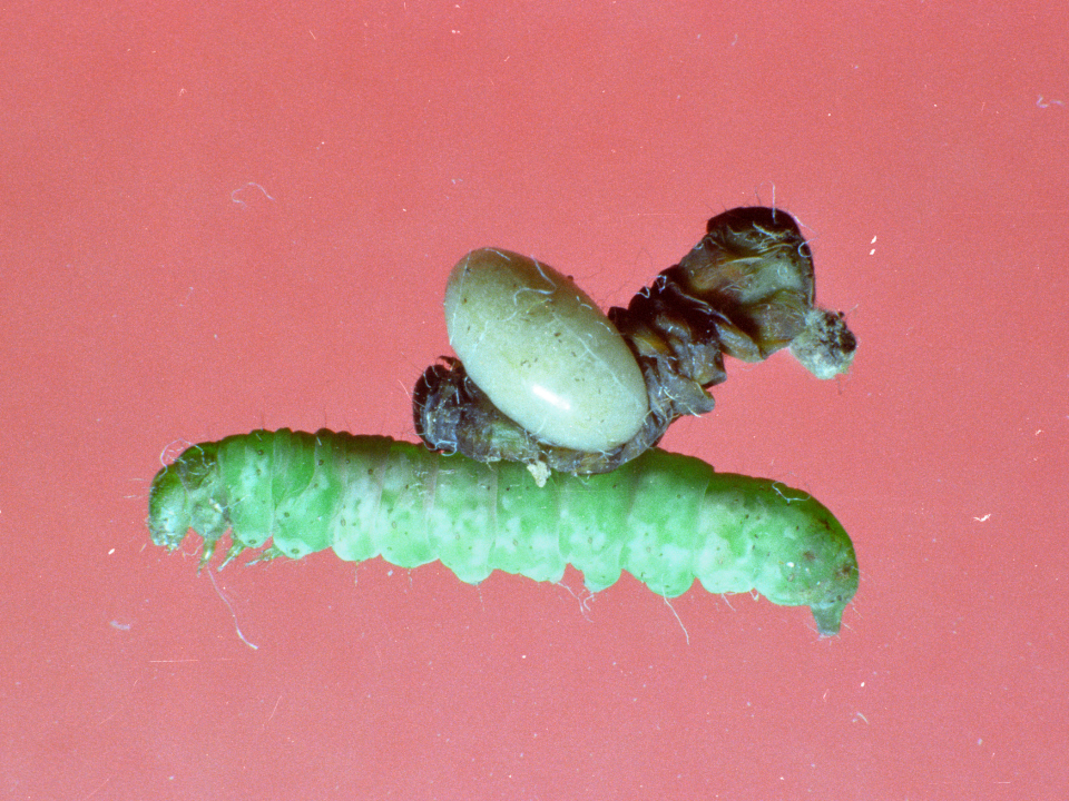 育房内の繭。中に前蛹が透けて見える。