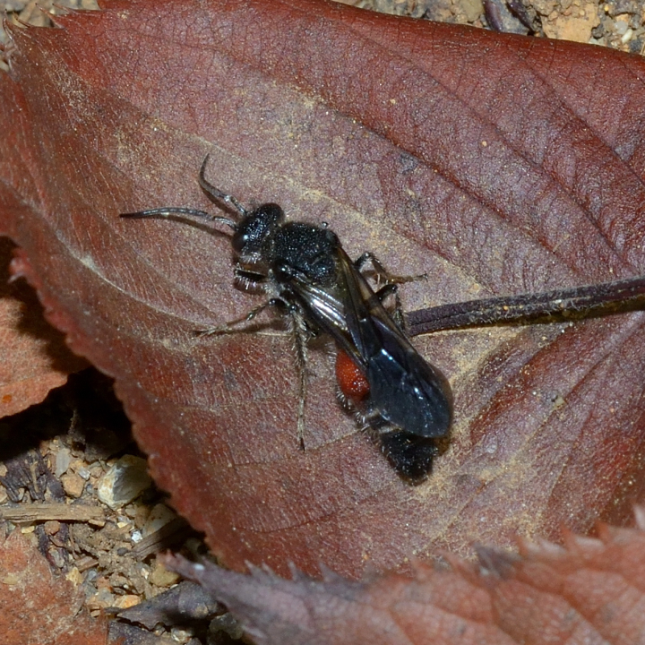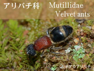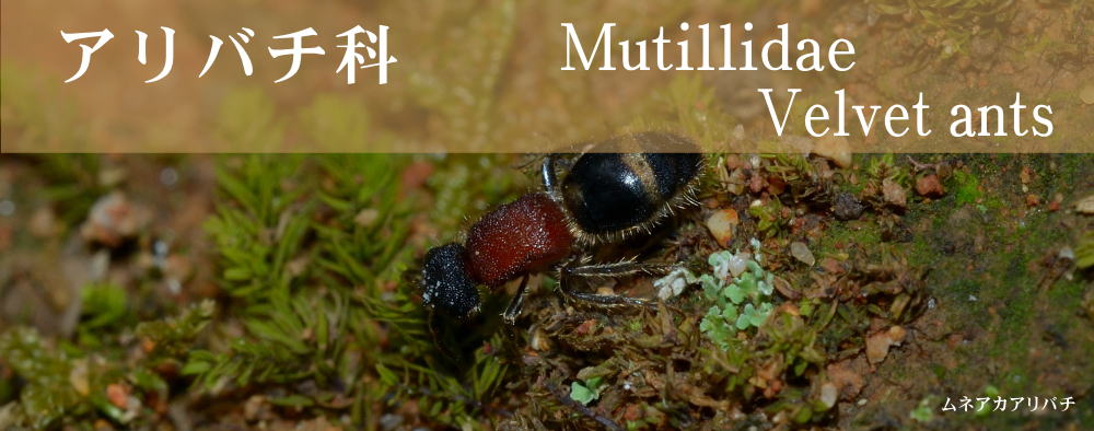 フタホシアリバチ Neotrogaspidia pustulata (Smith,1873) 【体長】メス5-9mm。オス8-14mm。 【発生期】秋季に確認したが詳細は不明。 【分布】本州、四国、九州、対馬、口之三島(硫黄島)、大隈諸島、伊豆諸島(八丈島)、琉球列島、小笠原諸島;朝鮮半島、台湾、中国。Mutilla insidiator、M. petulans、M. japonicaはシノニム。 寄主は不明。 地面を徘徊するメス。 2025年10月11日、兵庫県加古川市。 落ち葉の上で休むオス。 林縁の地面を低く飛びまわっていた。 2025年9月20日、兵庫県加古川市。