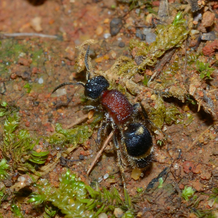 ムネアカアリバチ Bischoffitilla punges (Smith,1873) 【体長】メス7-9mm。オス7-10mm。 【発生期】夏季-秋季に活動すると思われるが、詳細は不明。 【分布】本州、四国、九州、大隈諸島、伊豆諸島(八丈島) 日本固有種。 ハトガユアリバチB. unidentataは本種のオスだった。 雌雄モザイクの個体も得られているという。 寄主としてホクダイコハナバチとエサキムカシハナバチが報告されている。 地面を徘徊するメス。 直前にアオスジハナバチの巣穴からあわてて出てきた。 寄生するかは不明。 2025年9月14日、兵庫県加古川市。