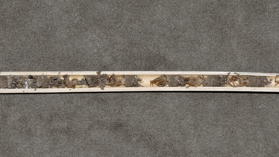 (写真24)竹筒のトラップに作られたヤマトルリジガバチの巣。坑道の長さは160mmあるのに2育房しか作られていない。玄関空室もない。