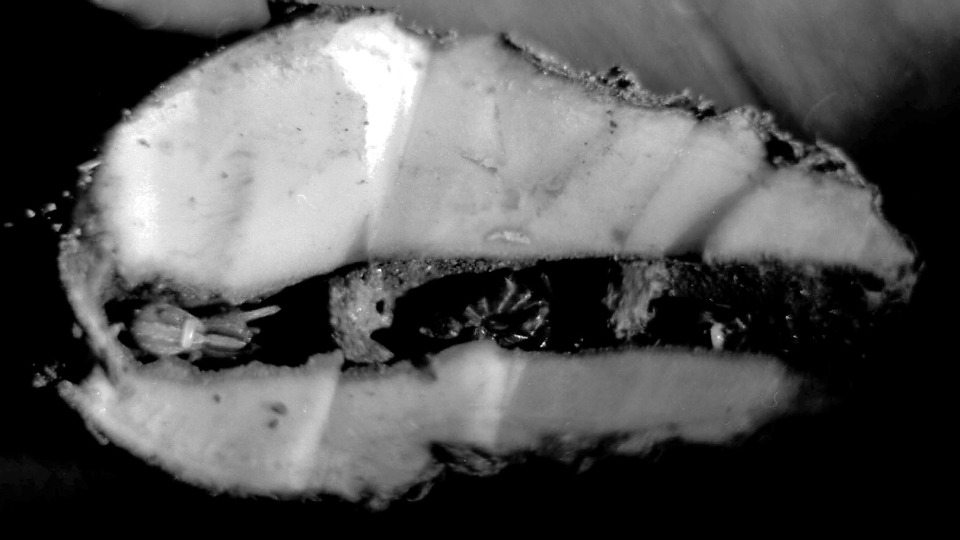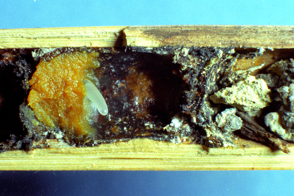 (写真2)竹筒に作られたオオフタオビドロバチの巣。蓄えられた餌(蛾の幼虫)や蜂の幼虫が見える。