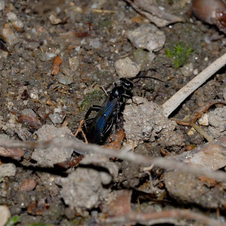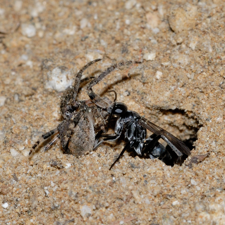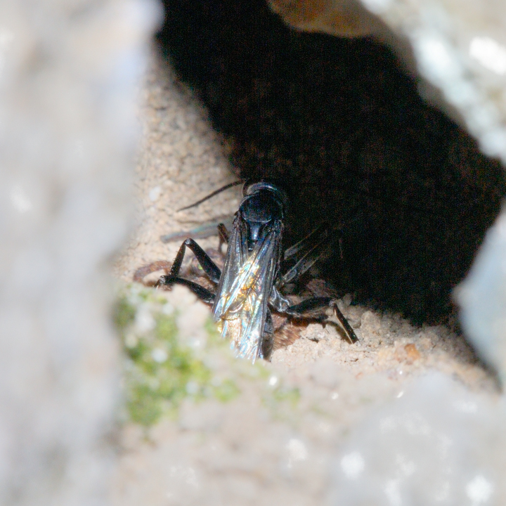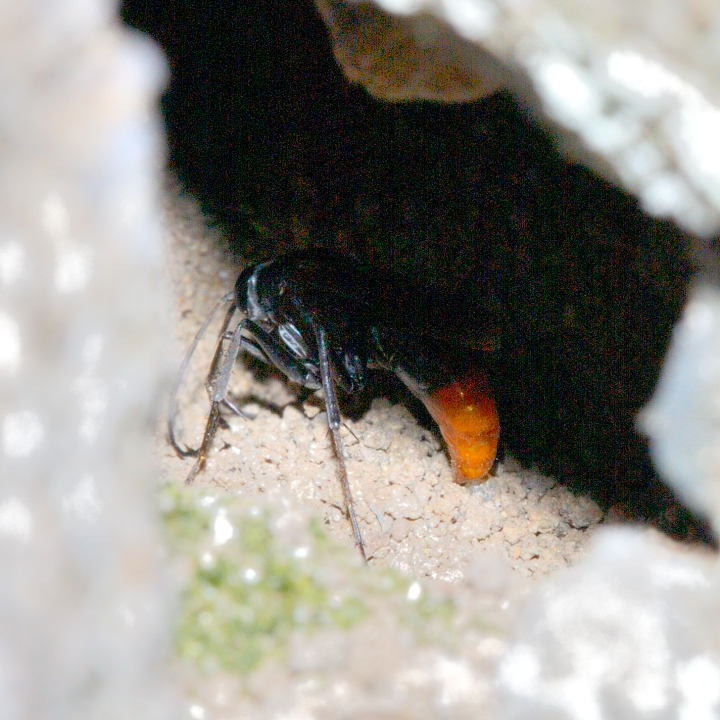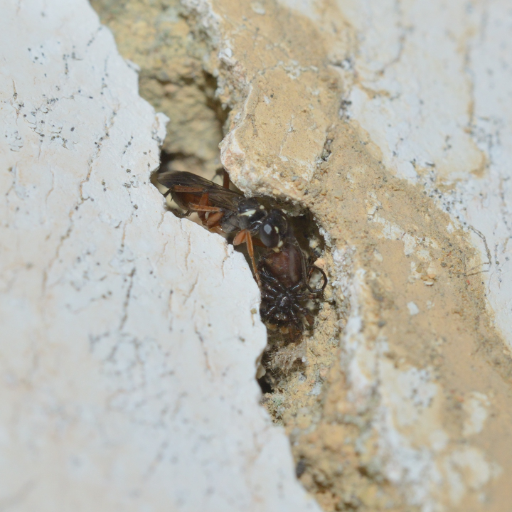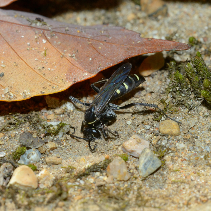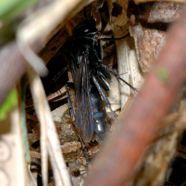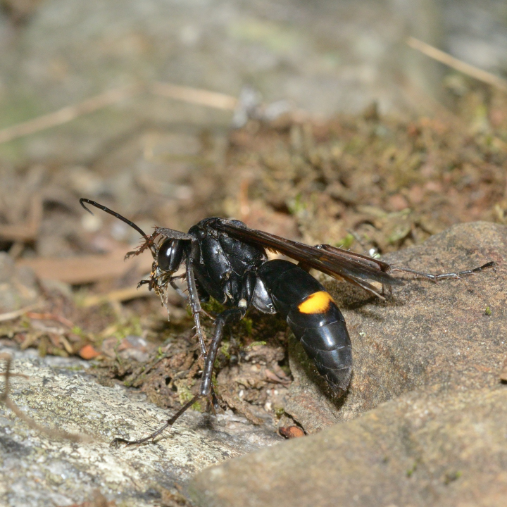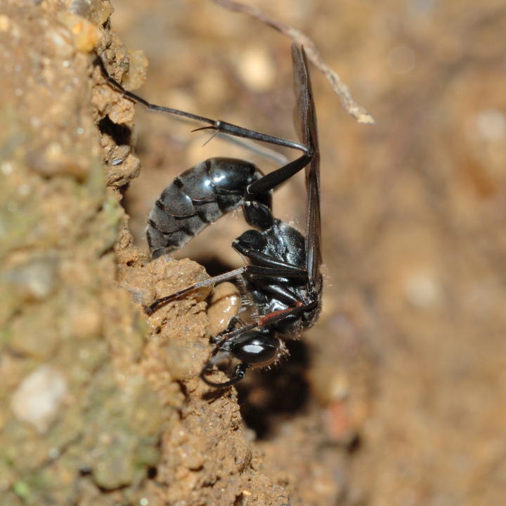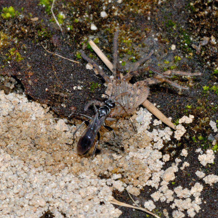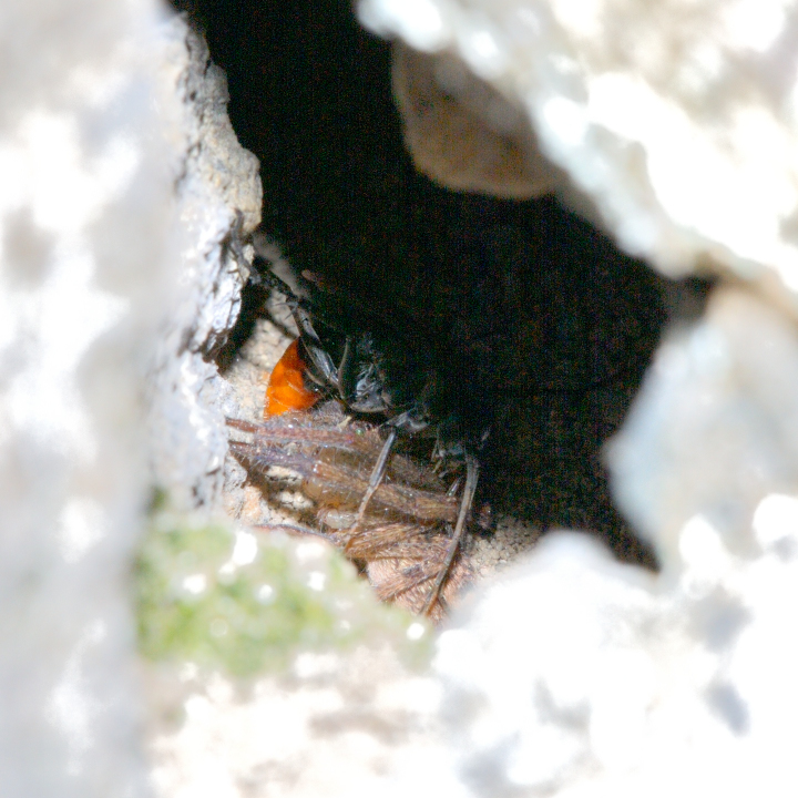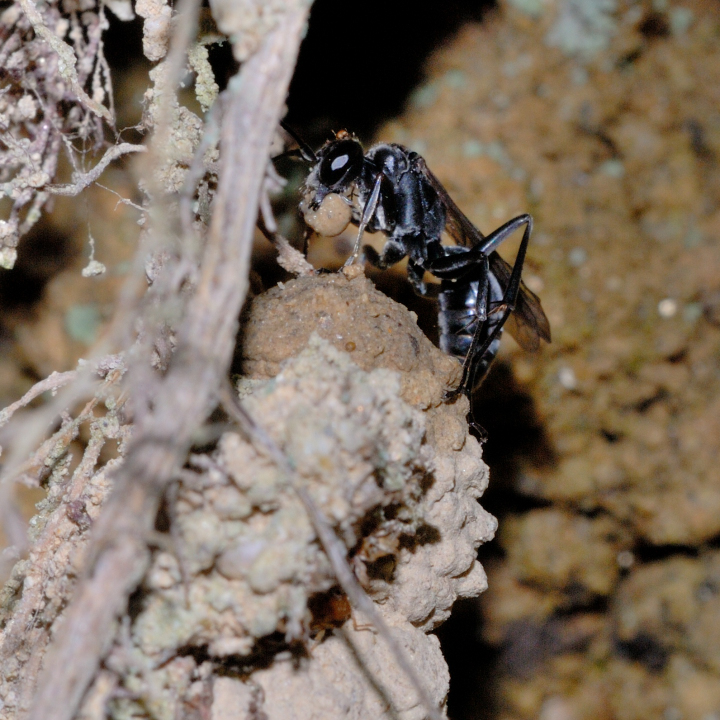 軟らかい土をすり鉢状に浅く掘って蜘蛛を搬入し、産卵して埋める行動を観察したが、もしかしたら少しの凹みを拡張して利用する様な習性の柔軟性を持つのかも知れない。