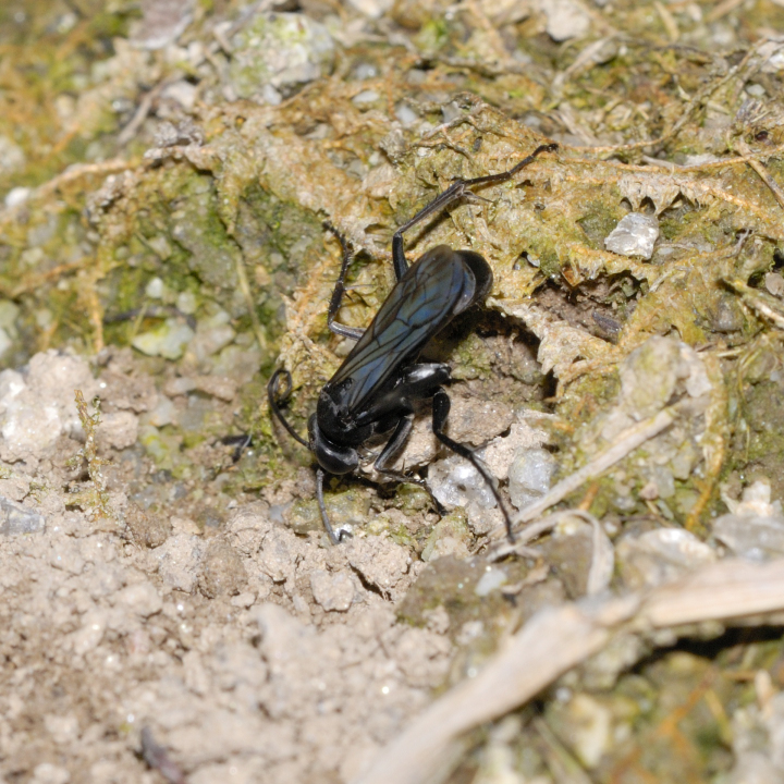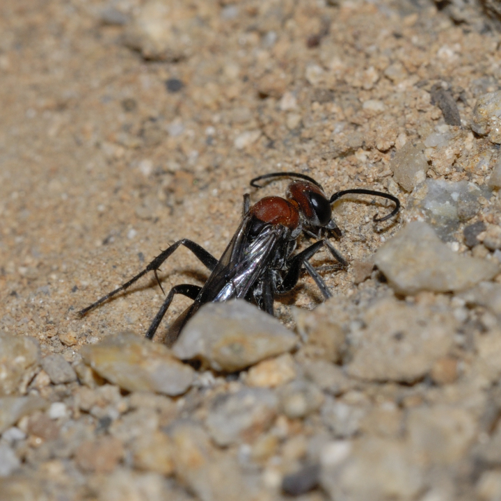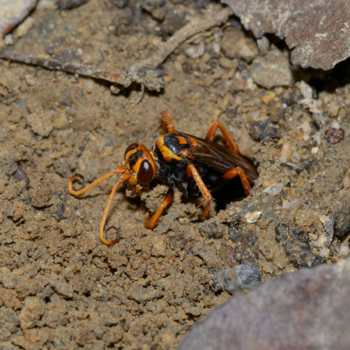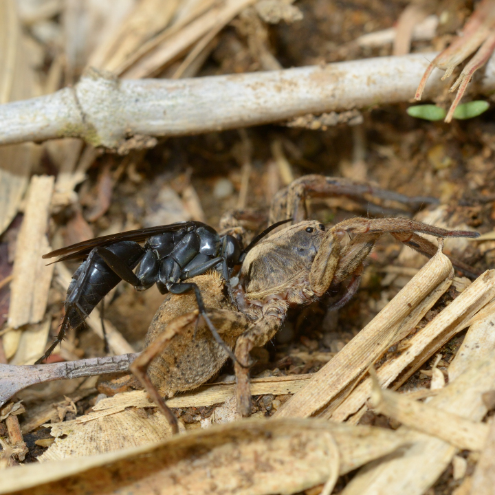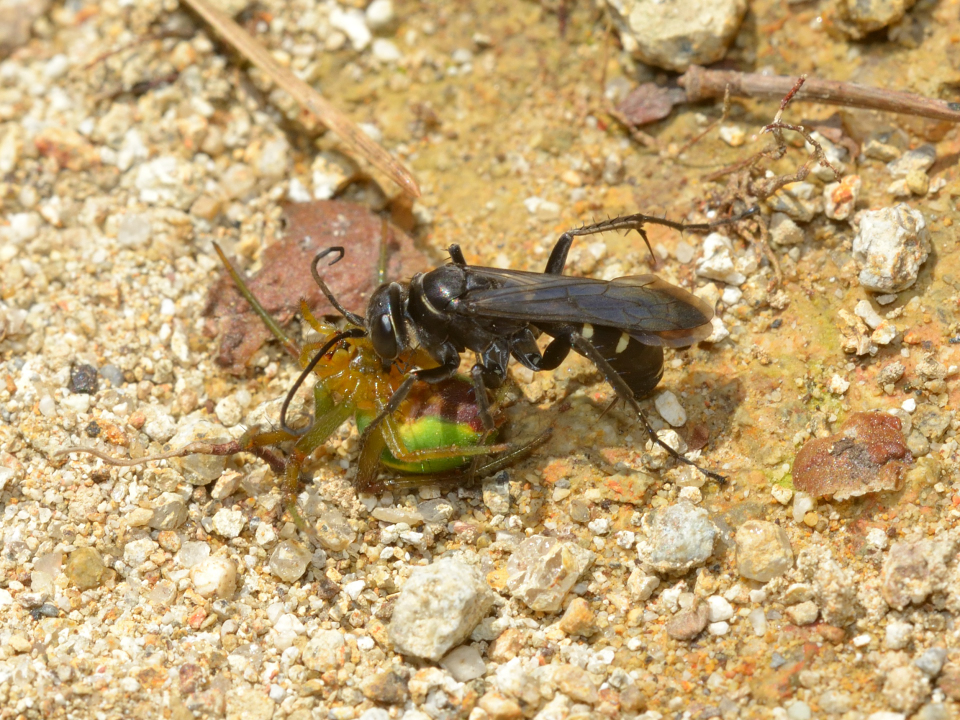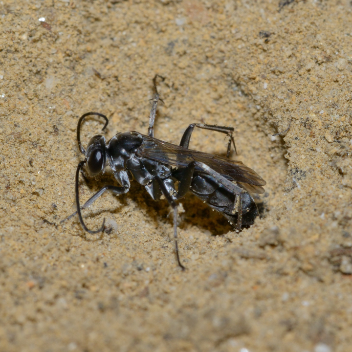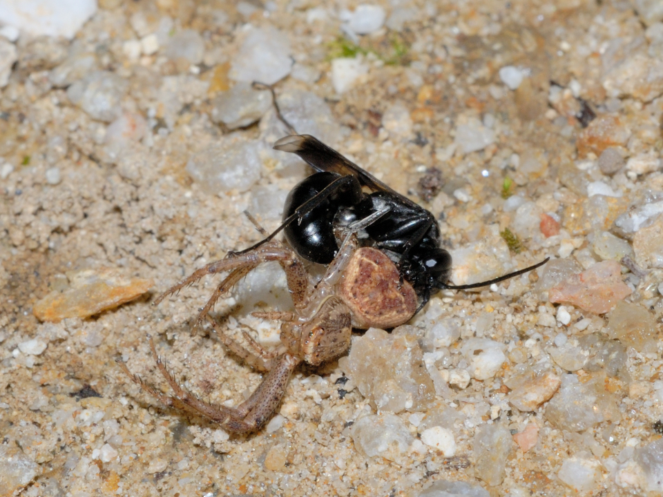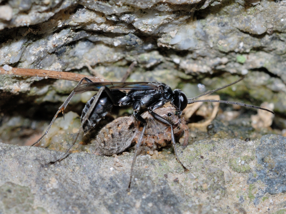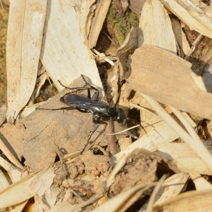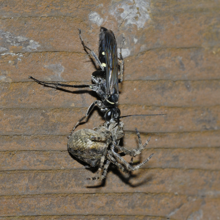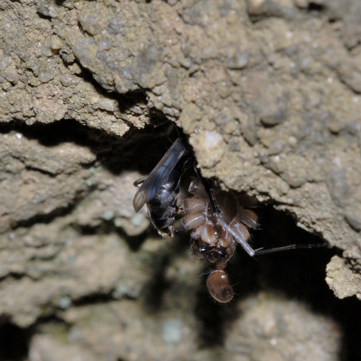 軟らかい土をすり鉢状に浅く掘って蜘蛛を搬入し、産卵して埋める行動を観察したが、もしかしたら少しの凹みを拡張して利用する様な習性の柔軟性を持つのかも知れない。