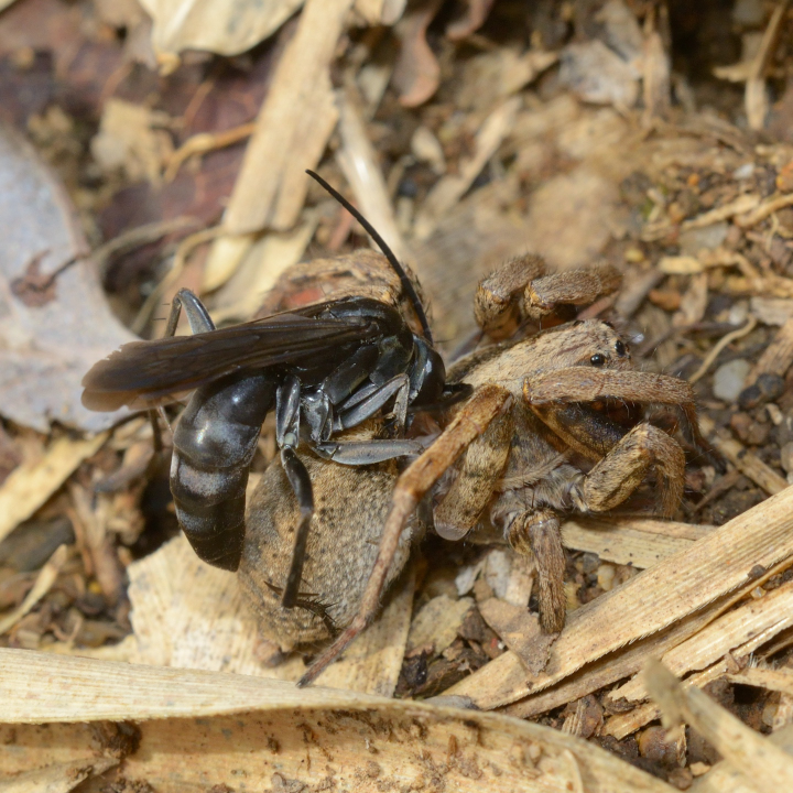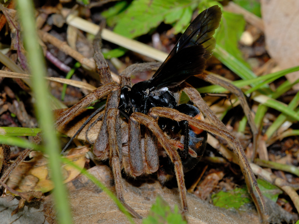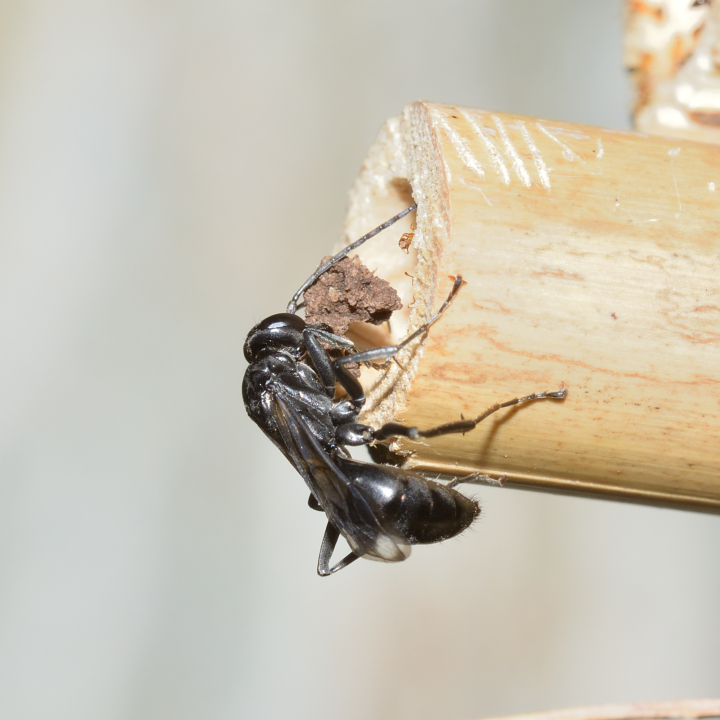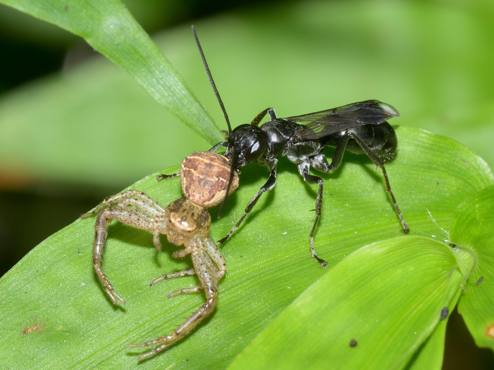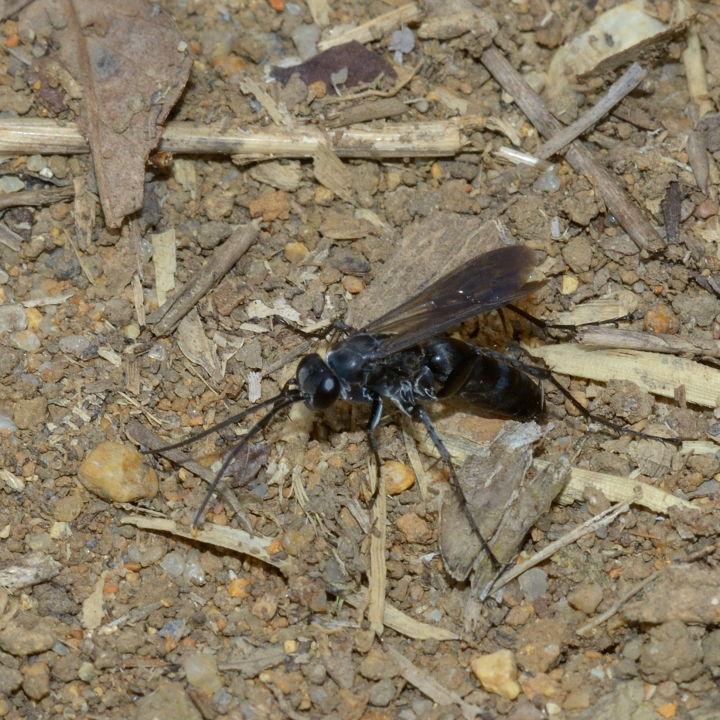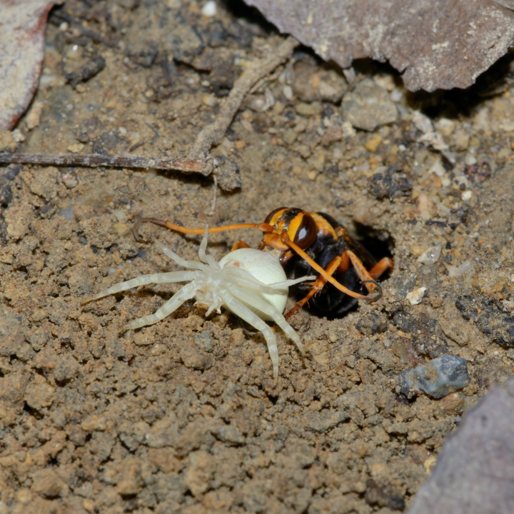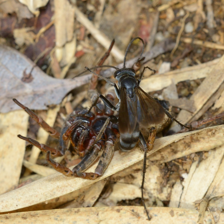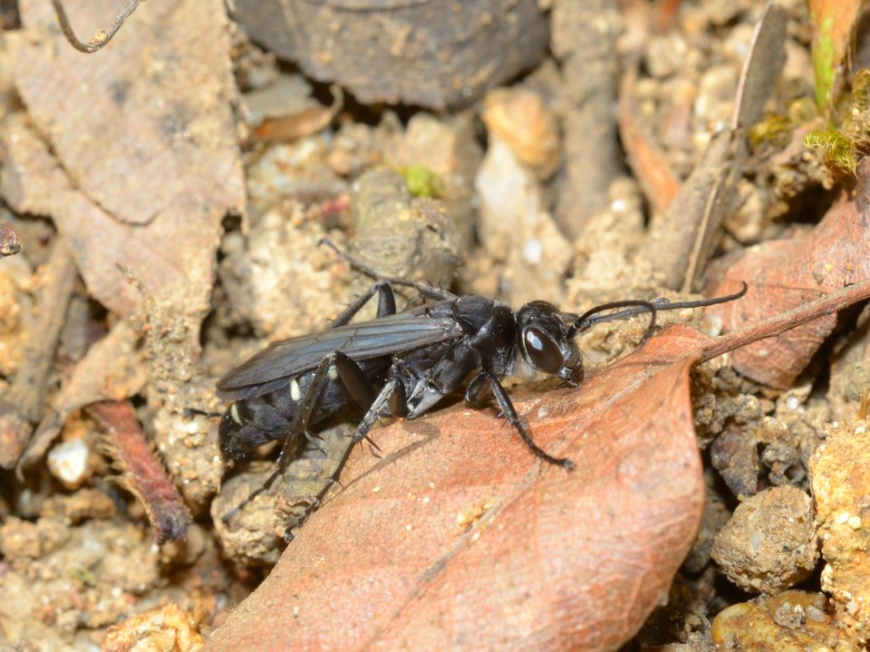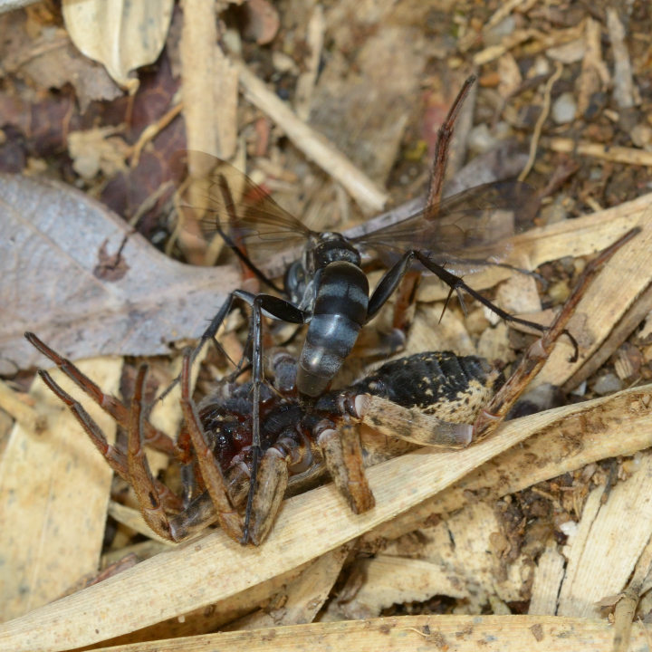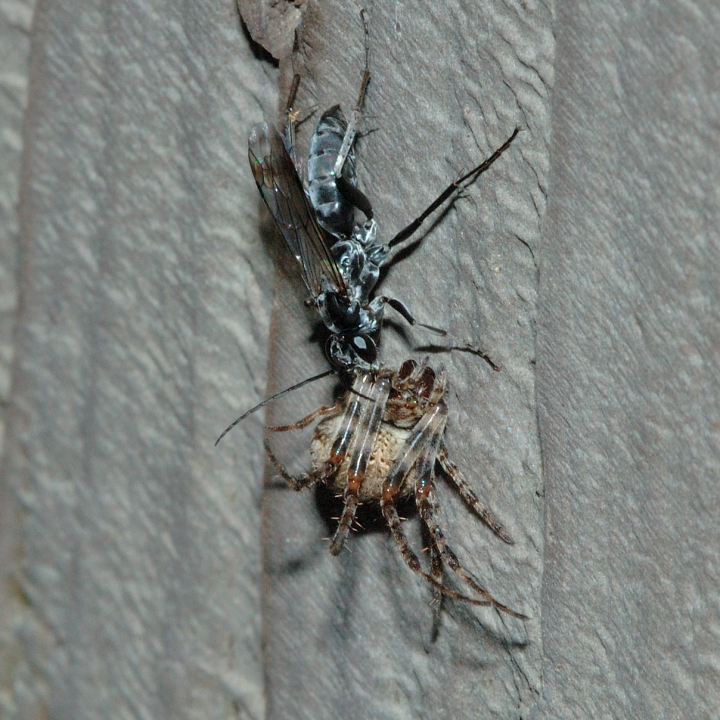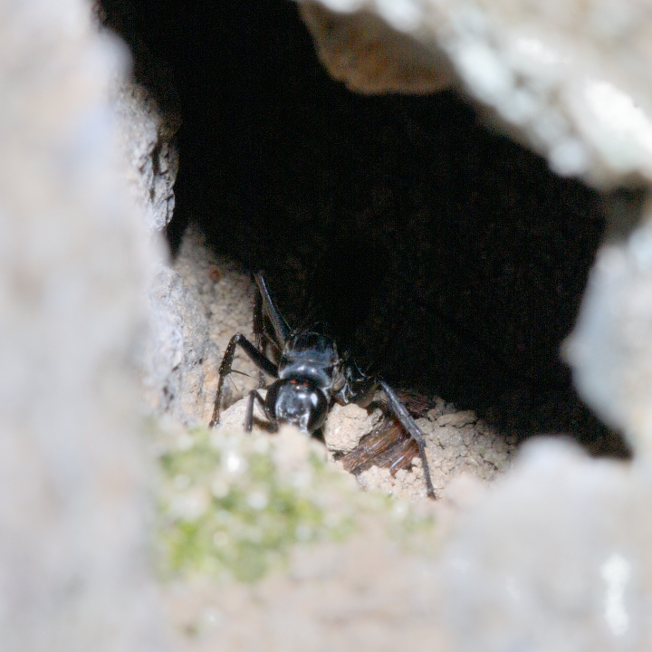軟らかい土をすり鉢状に浅く掘って蜘蛛を搬入し、産卵して埋める行動を観察したが、もしかしたら少しの凹みを拡張して利用する様な習性の柔軟性を持つのかも知れない。