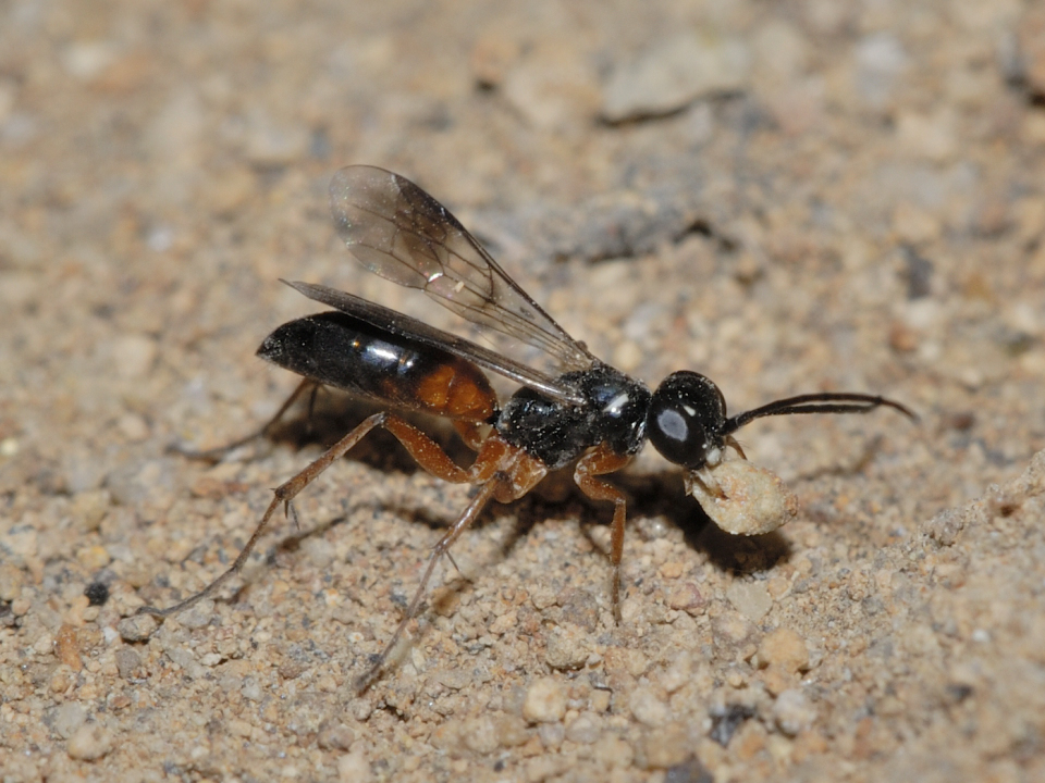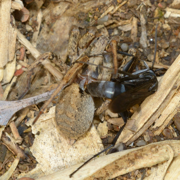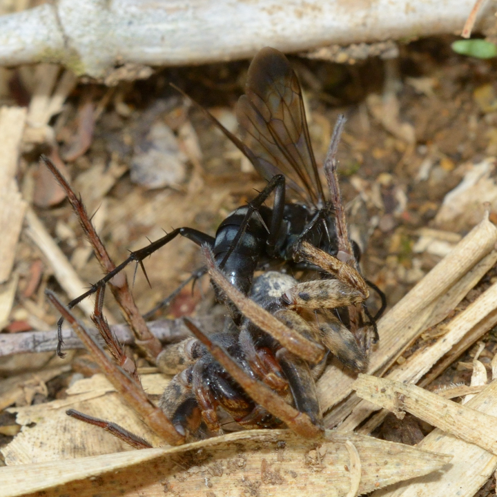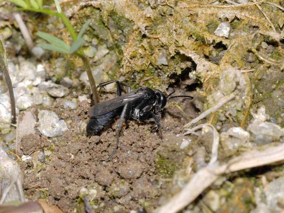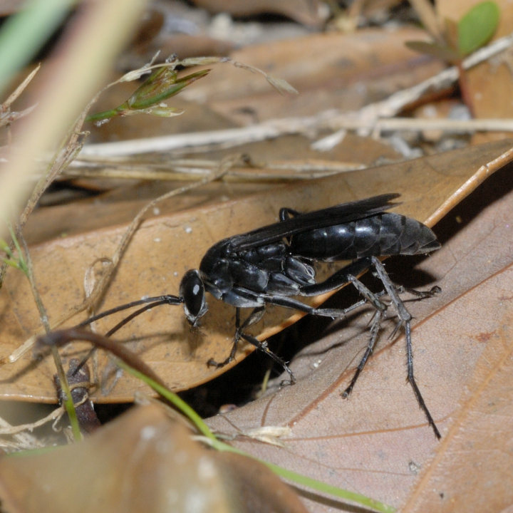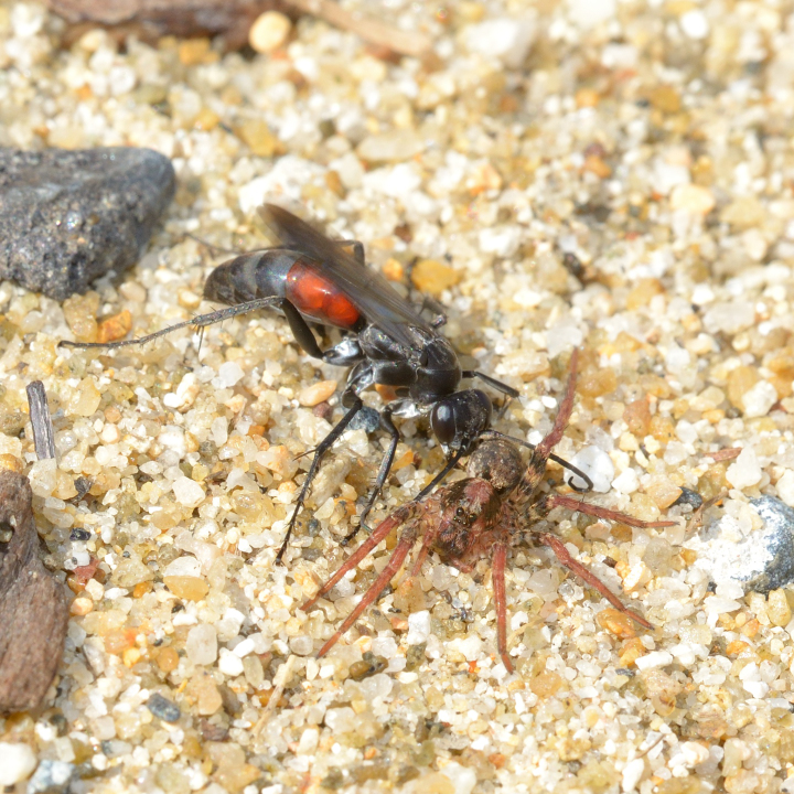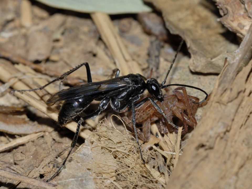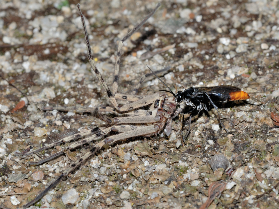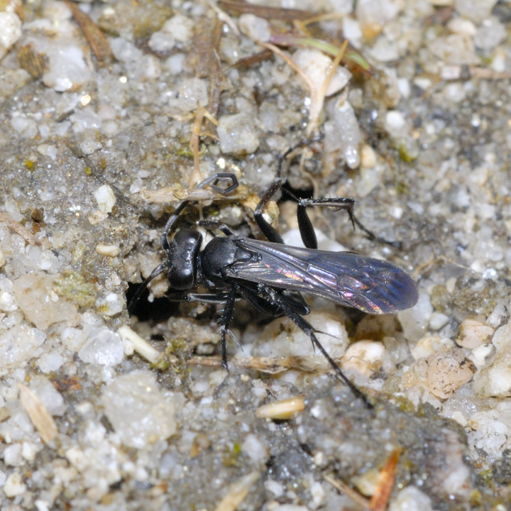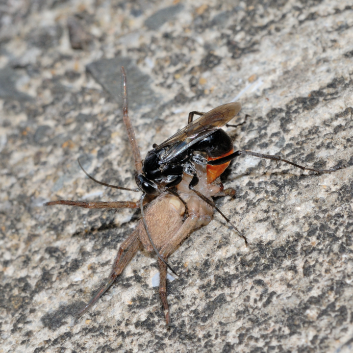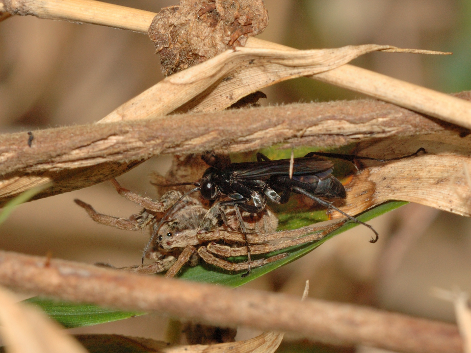 軟らかい土をすり鉢状に浅く掘って蜘蛛を搬入し、産卵して埋める行動を観察したが、もしかしたら少しの凹みを拡張して利用する様な習性の柔軟性を持つのかも知れない。