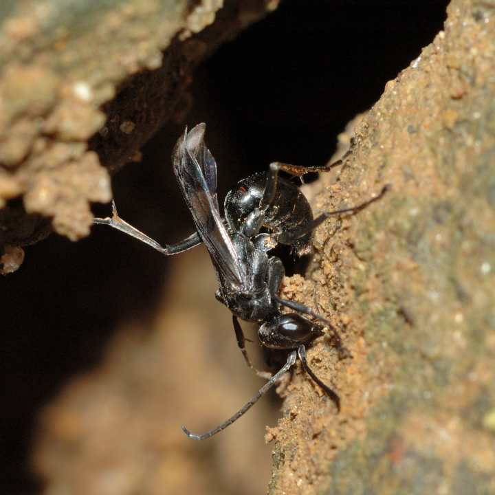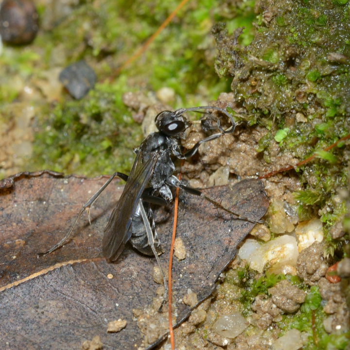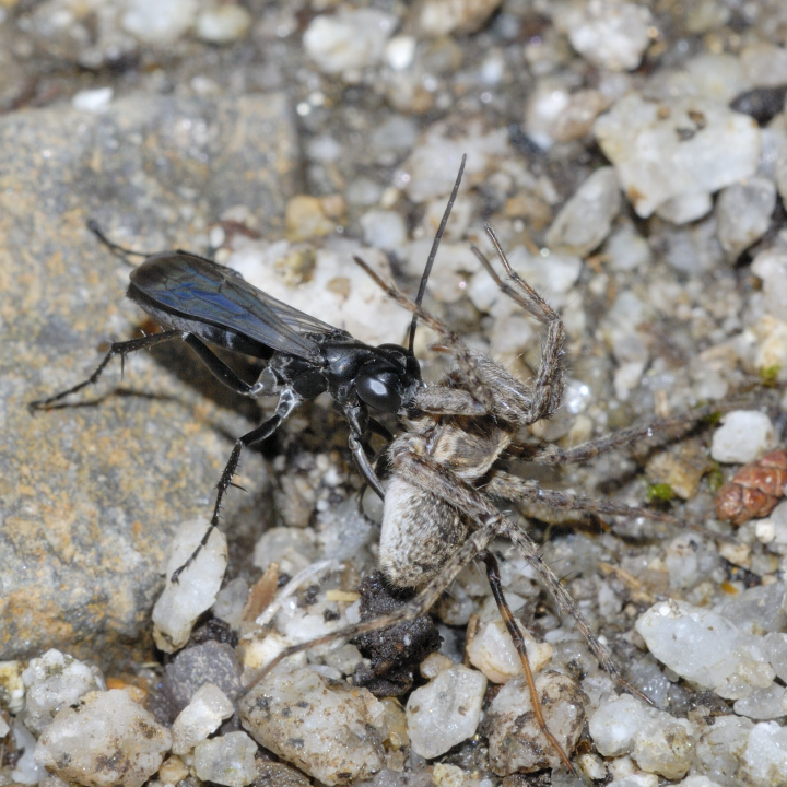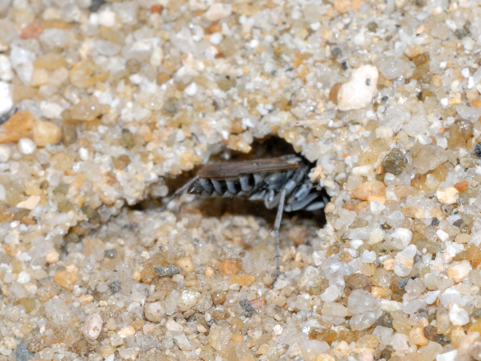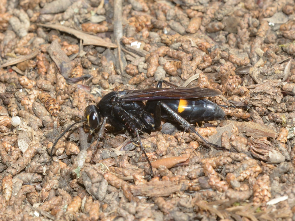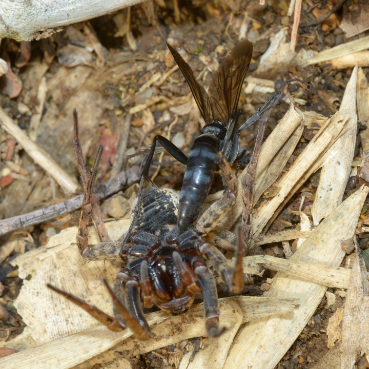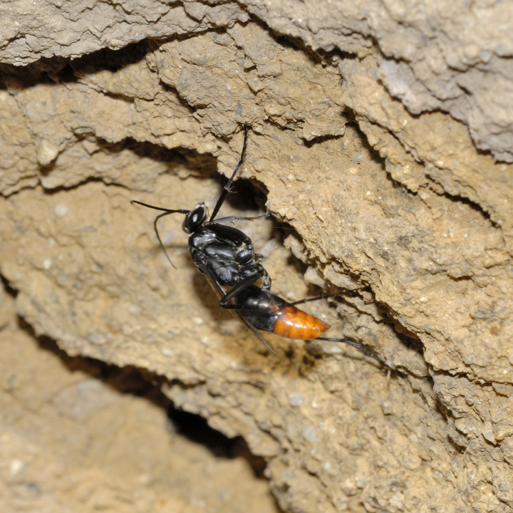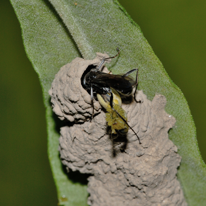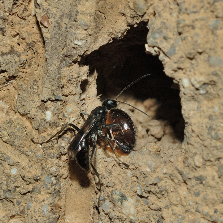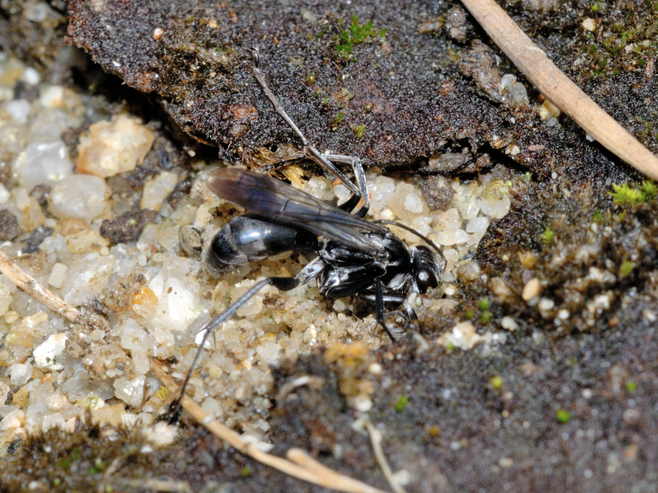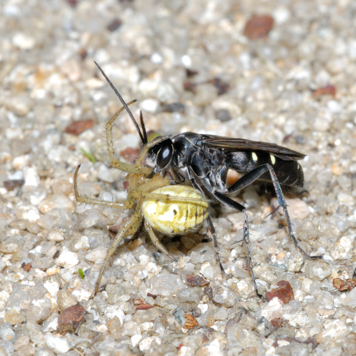 軟らかい土をすり鉢状に浅く掘って蜘蛛を搬入し、産卵して埋める行動を観察したが、もしかしたら少しの凹みを拡張して利用する様な習性の柔軟性を持つのかも知れない。