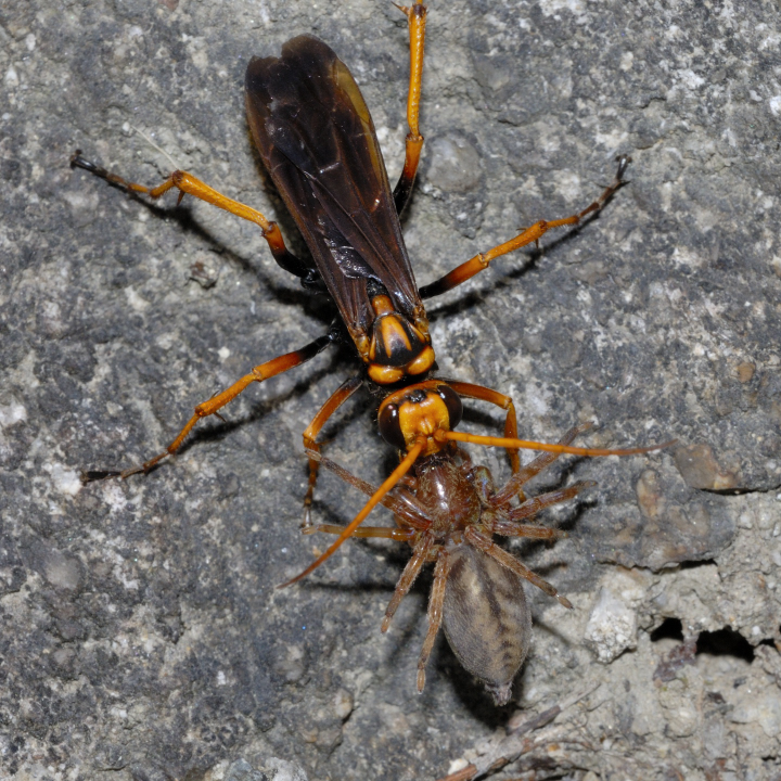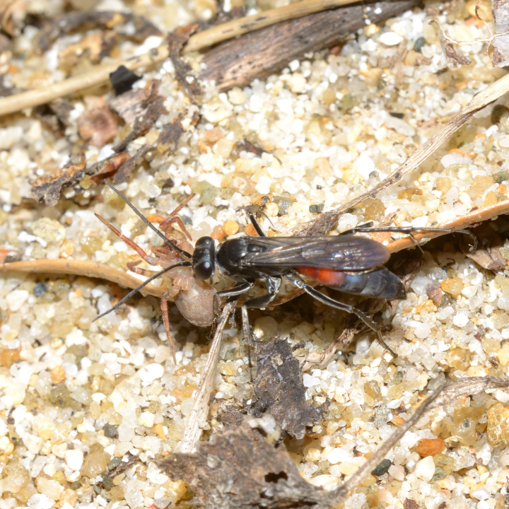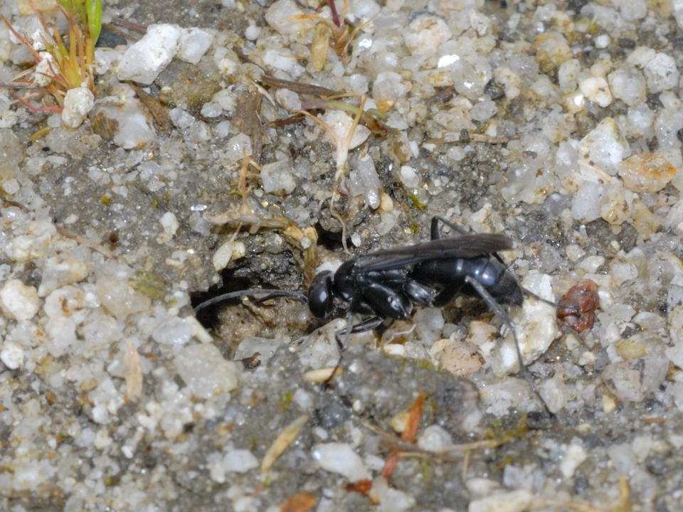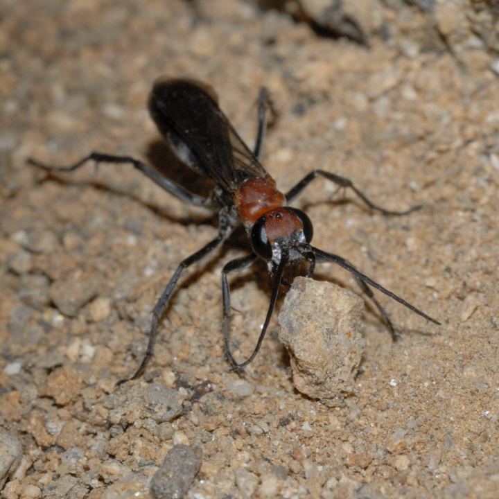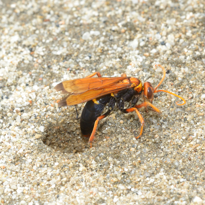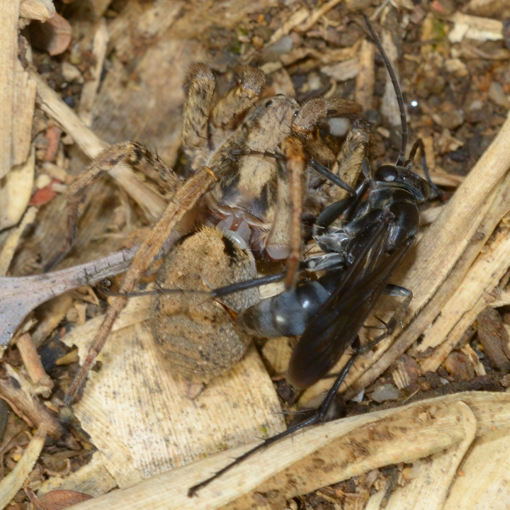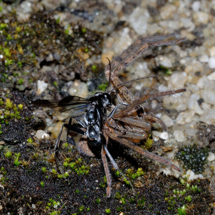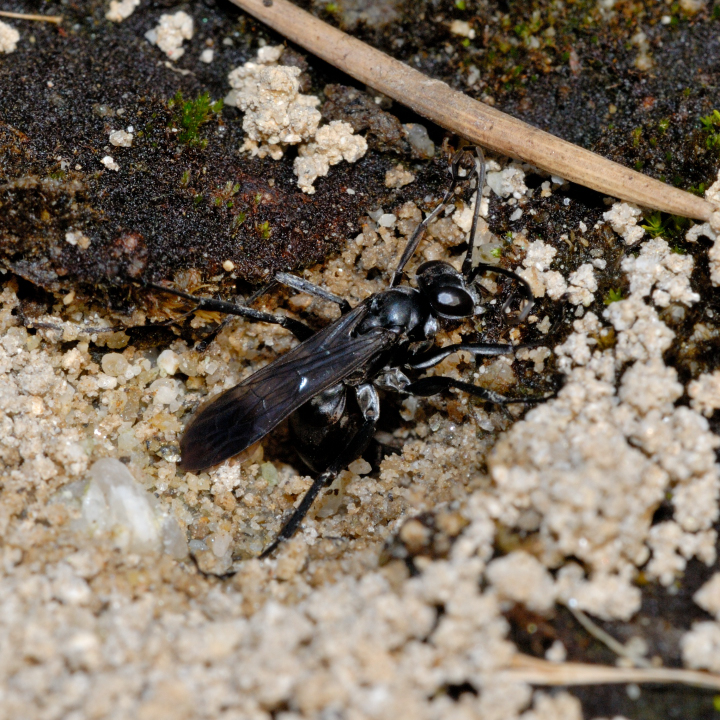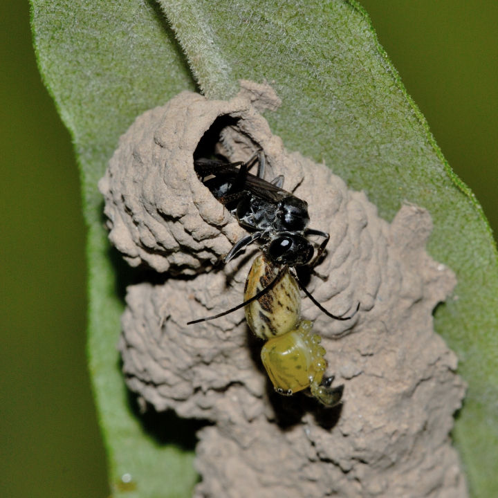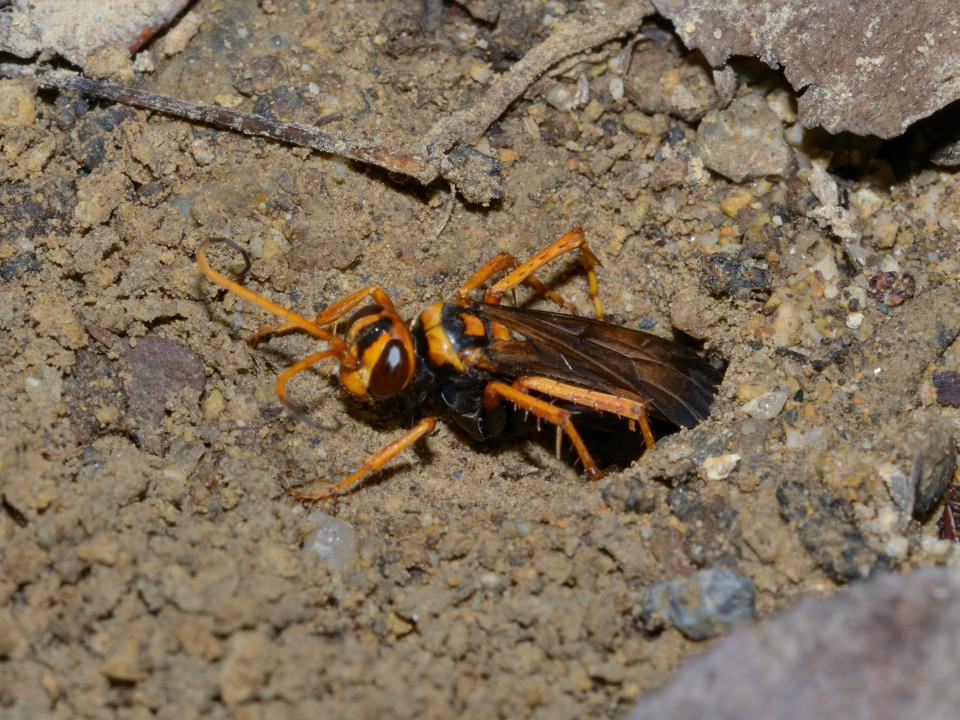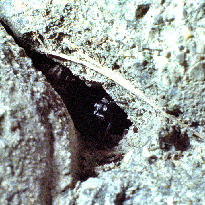 軟らかい土をすり鉢状に浅く掘って蜘蛛を搬入し、産卵して埋める行動を観察したが、もしかしたら少しの凹みを拡張して利用する様な習性の柔軟性を持つのかも知れない。