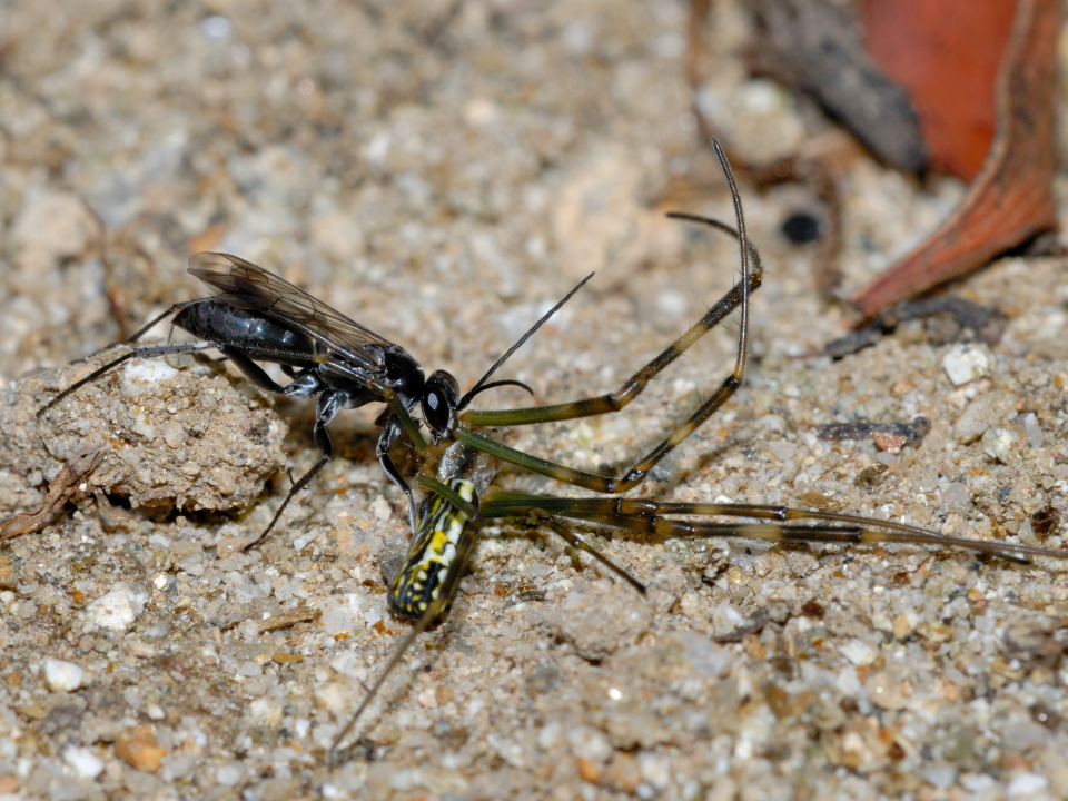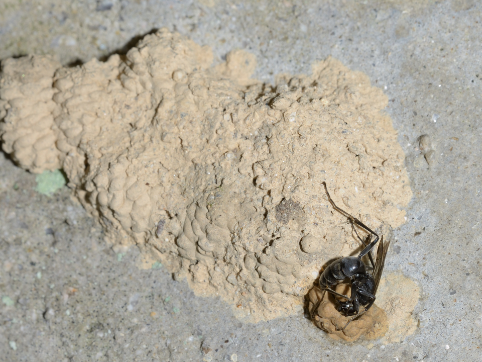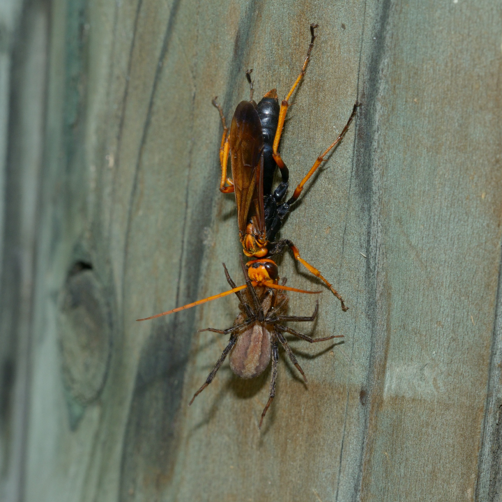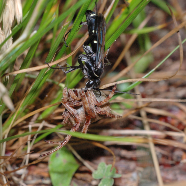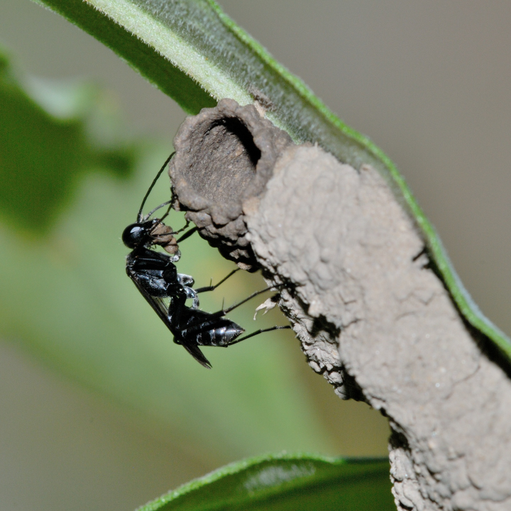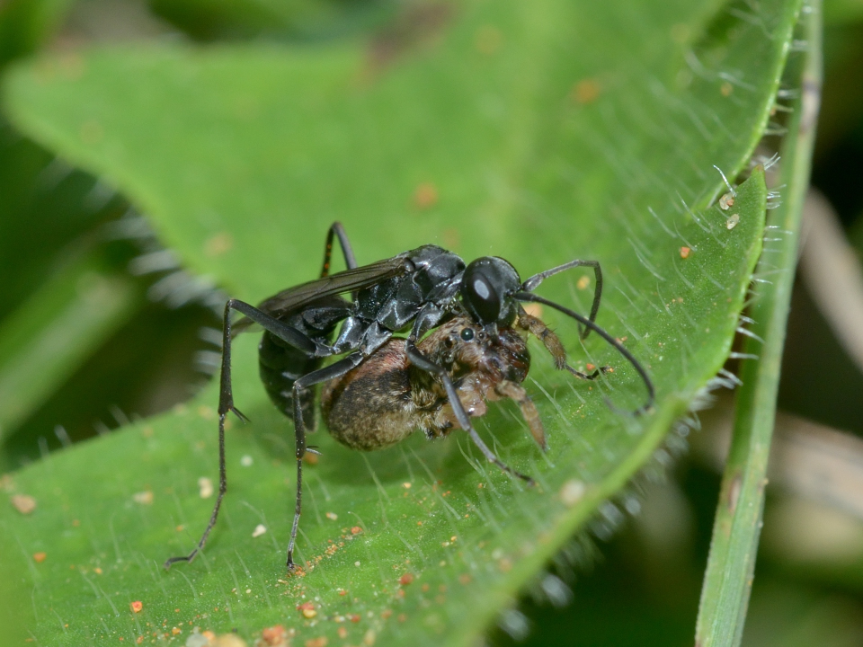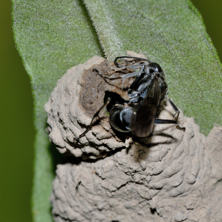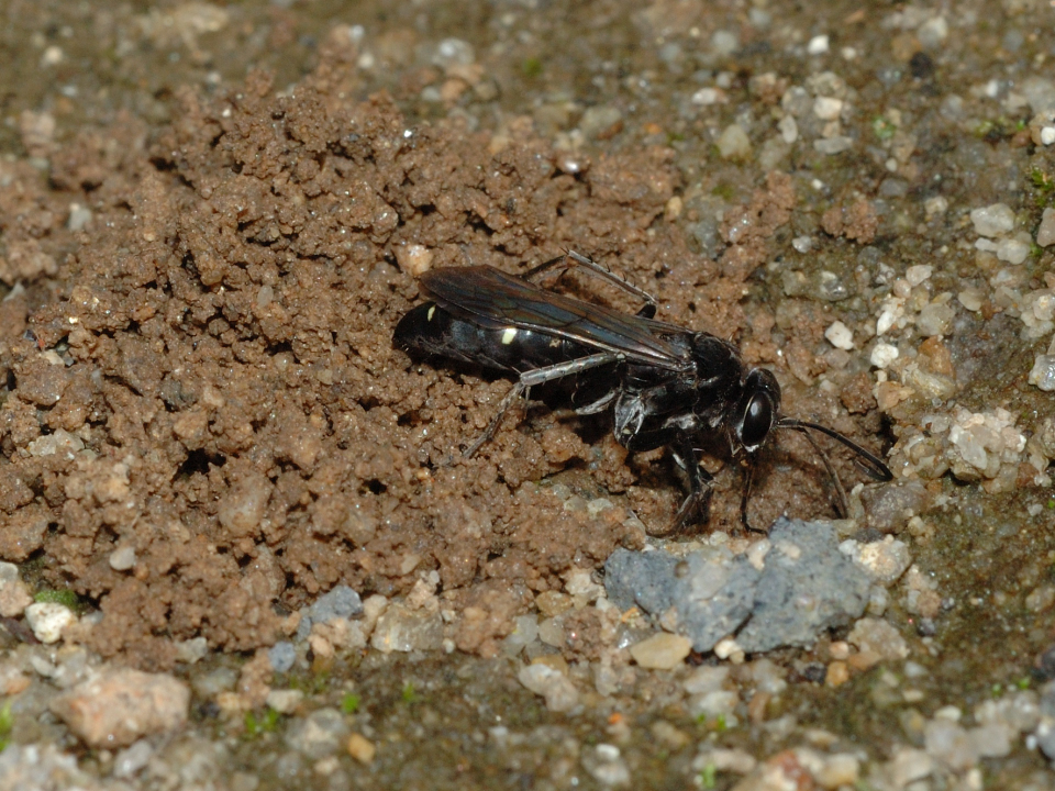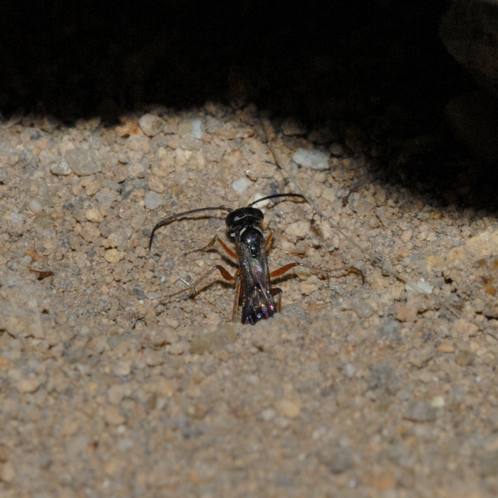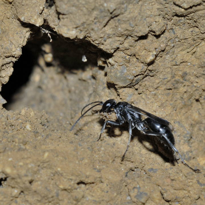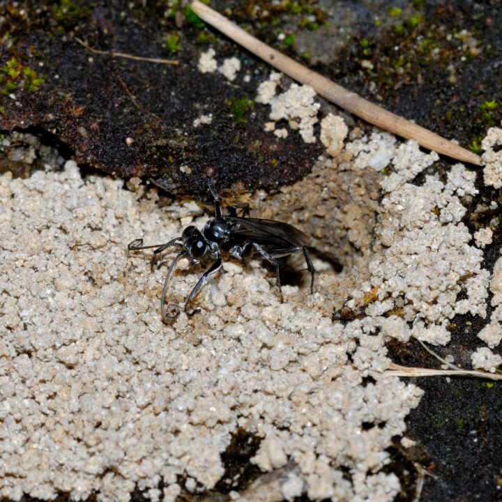 軟らかい土をすり鉢状に浅く掘って蜘蛛を搬入し、産卵して埋める行動を観察したが、もしかしたら少しの凹みを拡張して利用する様な習性の柔軟性を持つのかも知れない。
