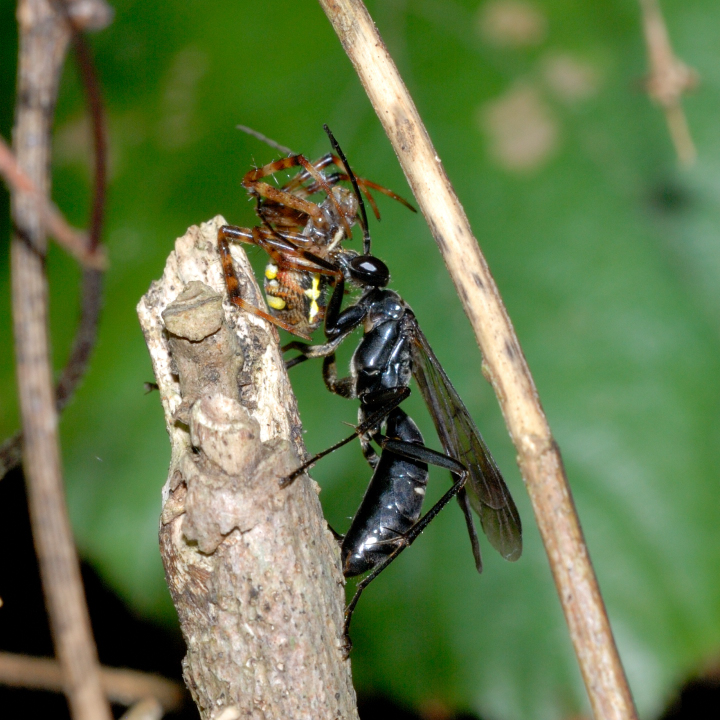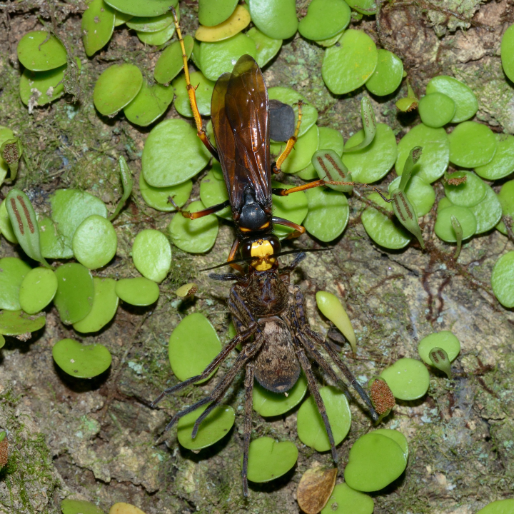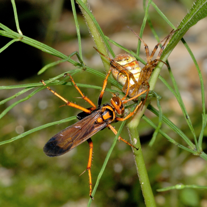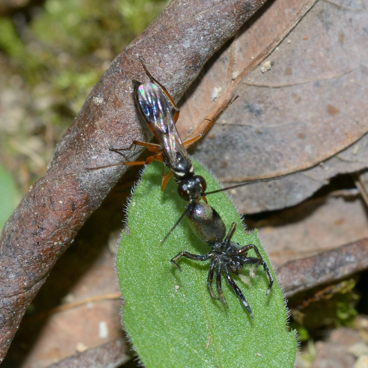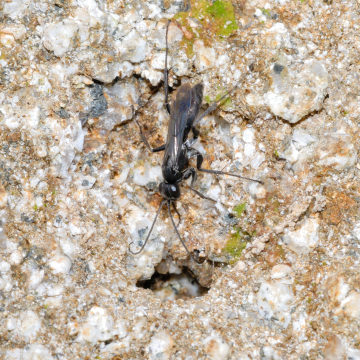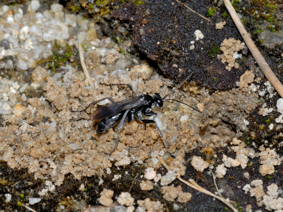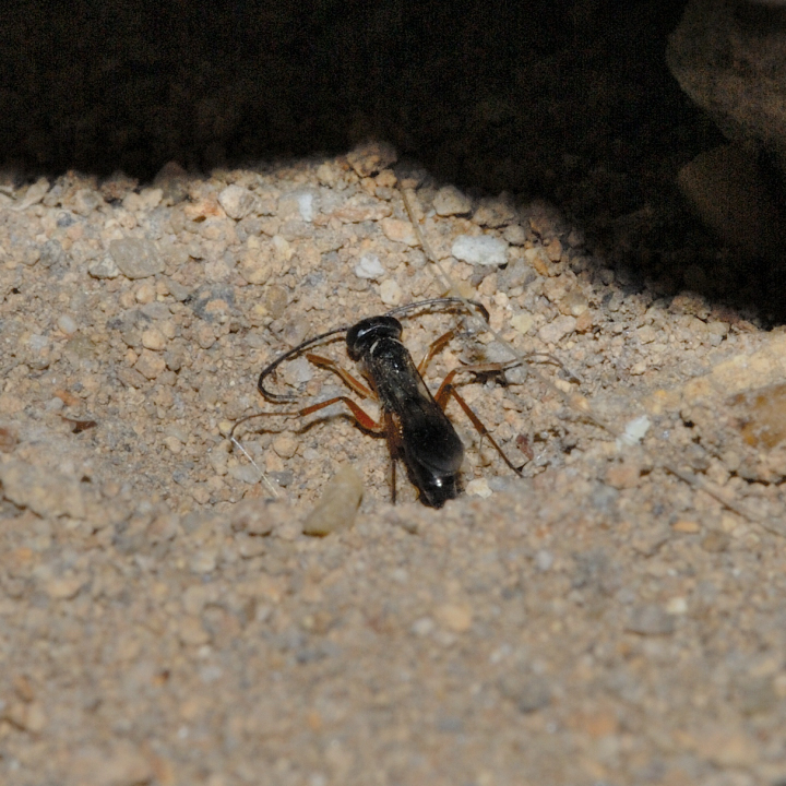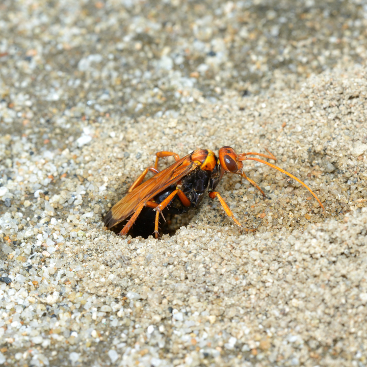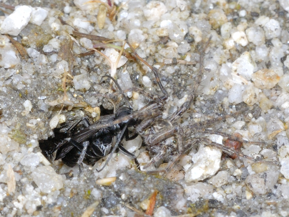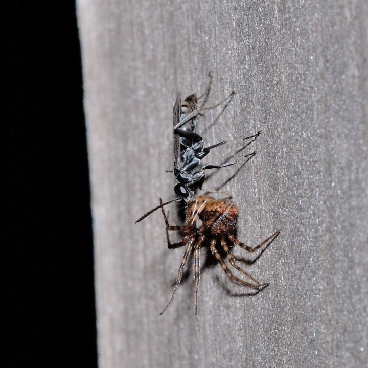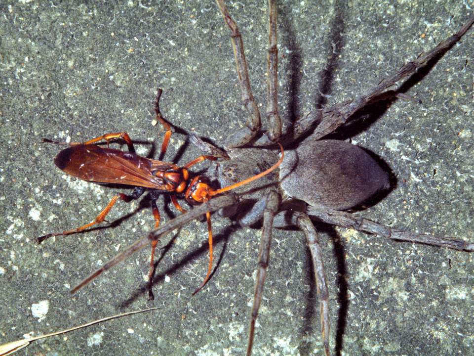 軟らかい土をすり鉢状に浅く掘って蜘蛛を搬入し、産卵して埋める行動を観察したが、もしかしたら少しの凹みを拡張して利用する様な習性の柔軟性を持つのかも知れない。