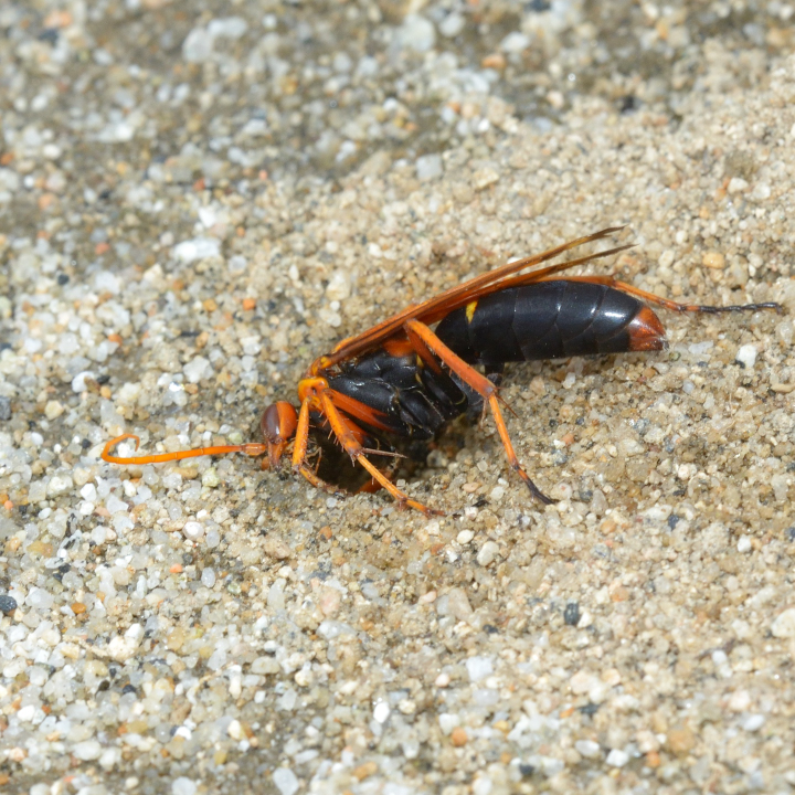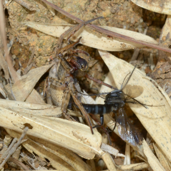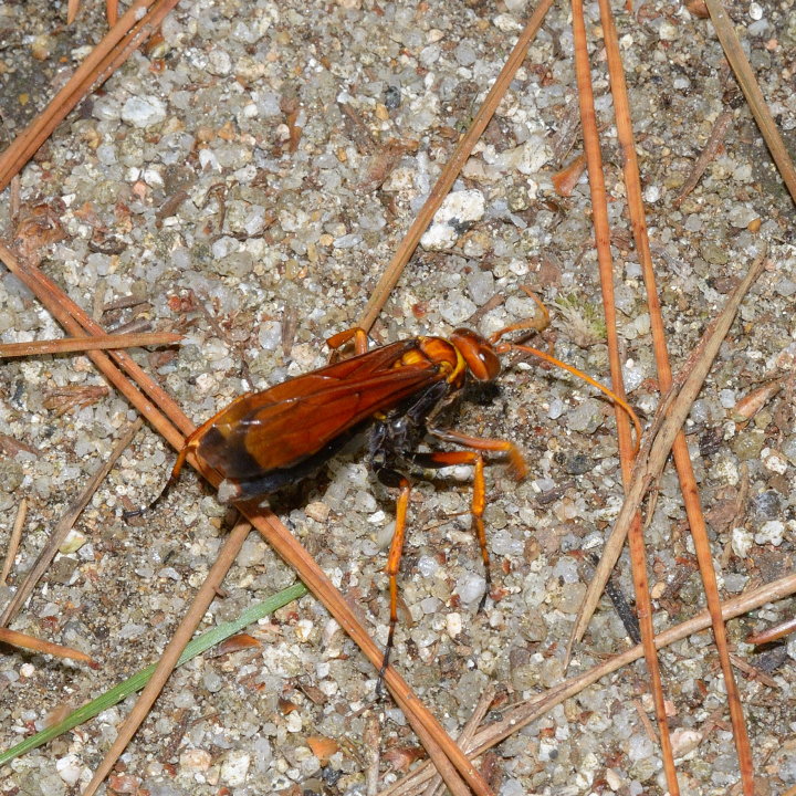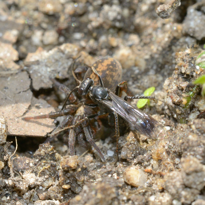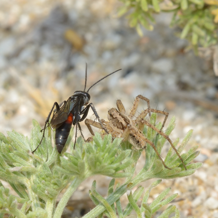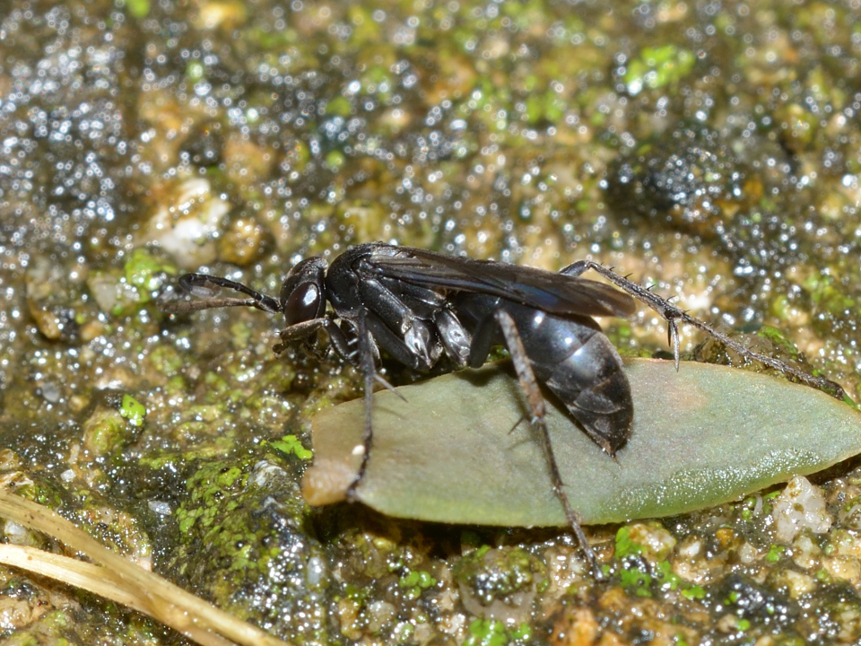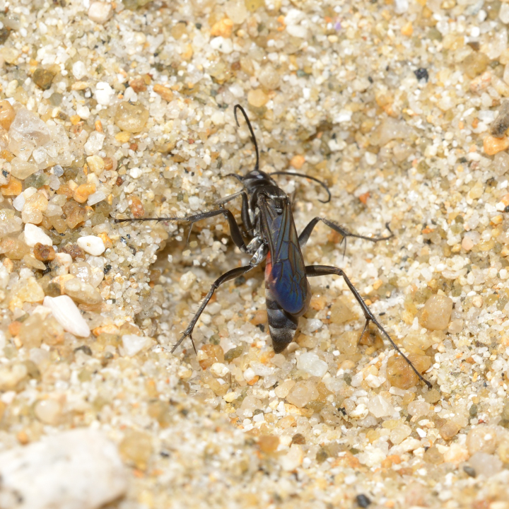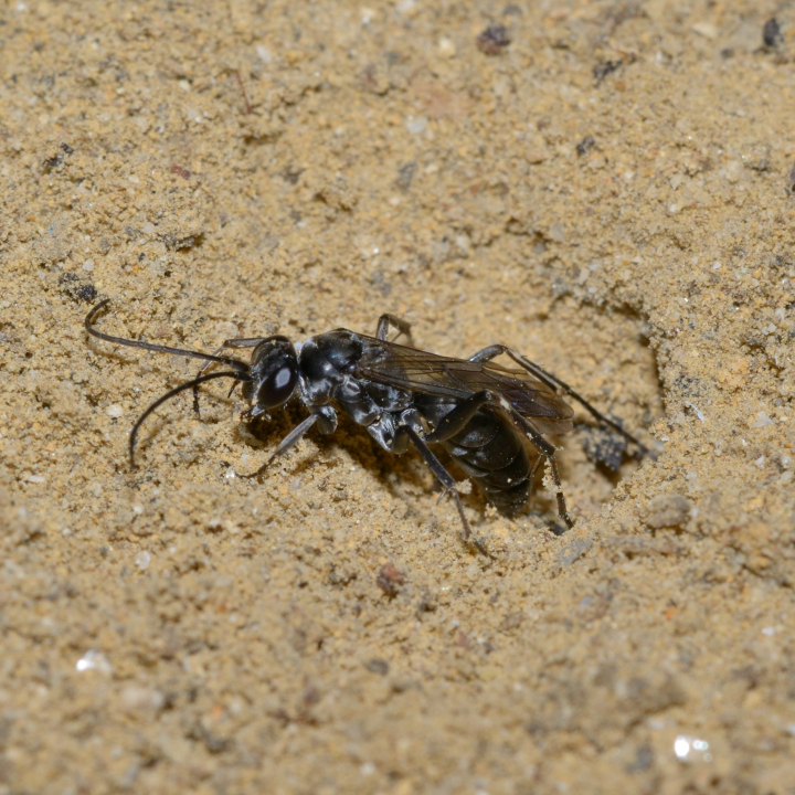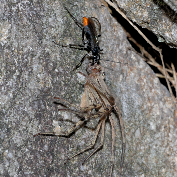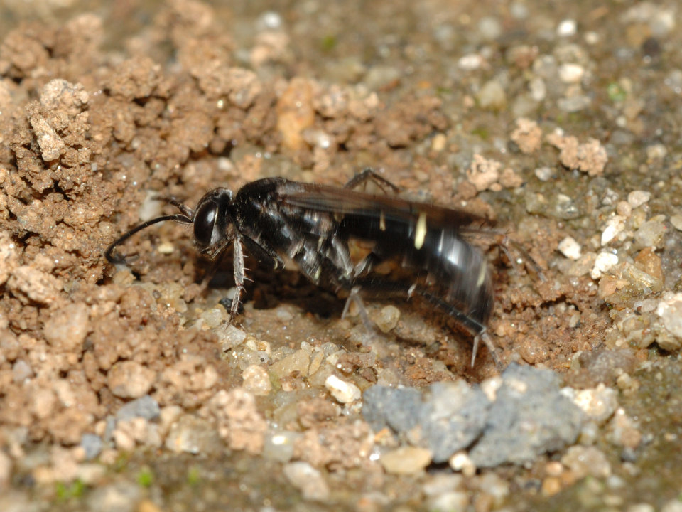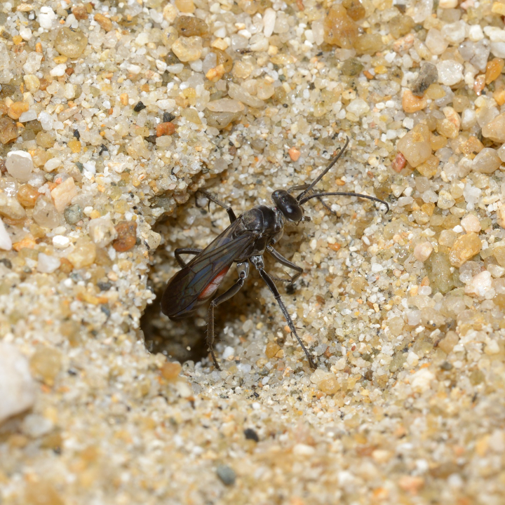 軟らかい土をすり鉢状に浅く掘って蜘蛛を搬入し、産卵して埋める行動を観察したが、もしかしたら少しの凹みを拡張して利用する様な習性の柔軟性を持つのかも知れない。