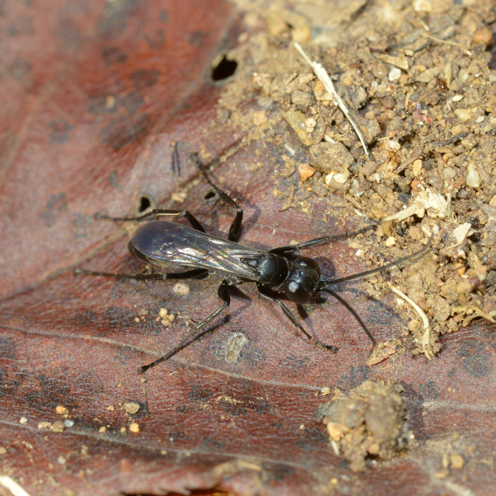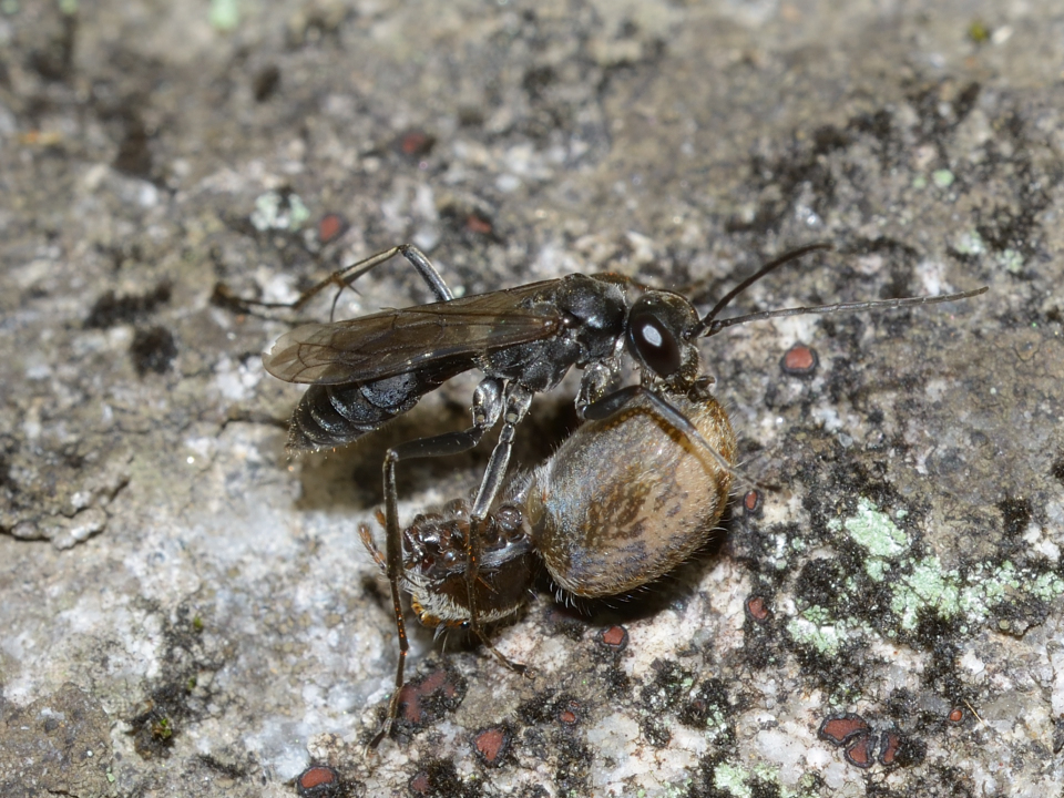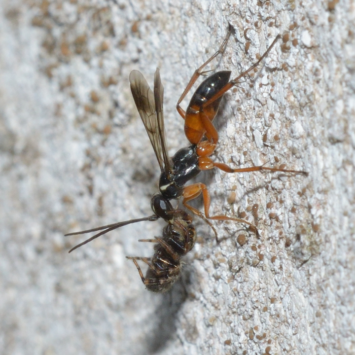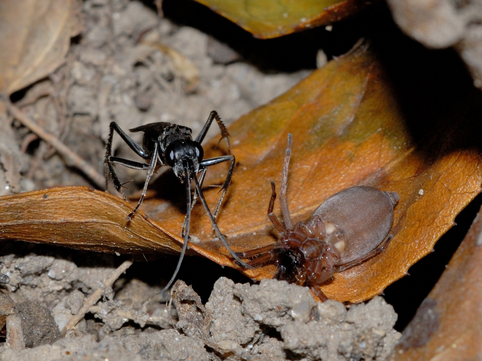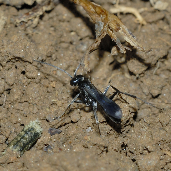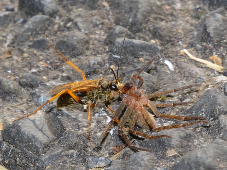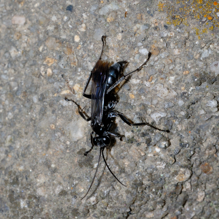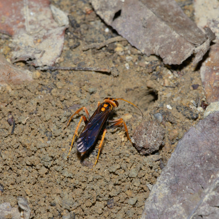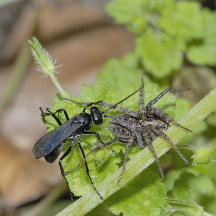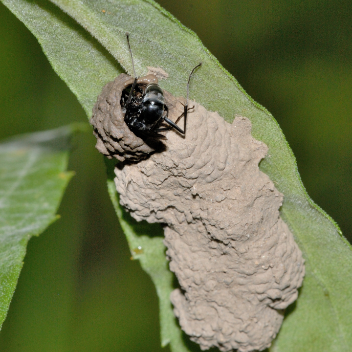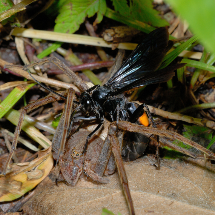軟らかい土をすり鉢状に浅く掘って蜘蛛を搬入し、産卵して埋める行動を観察したが、もしかしたら少しの凹みを拡張して利用する様な習性の柔軟性を持つのかも知れない。
