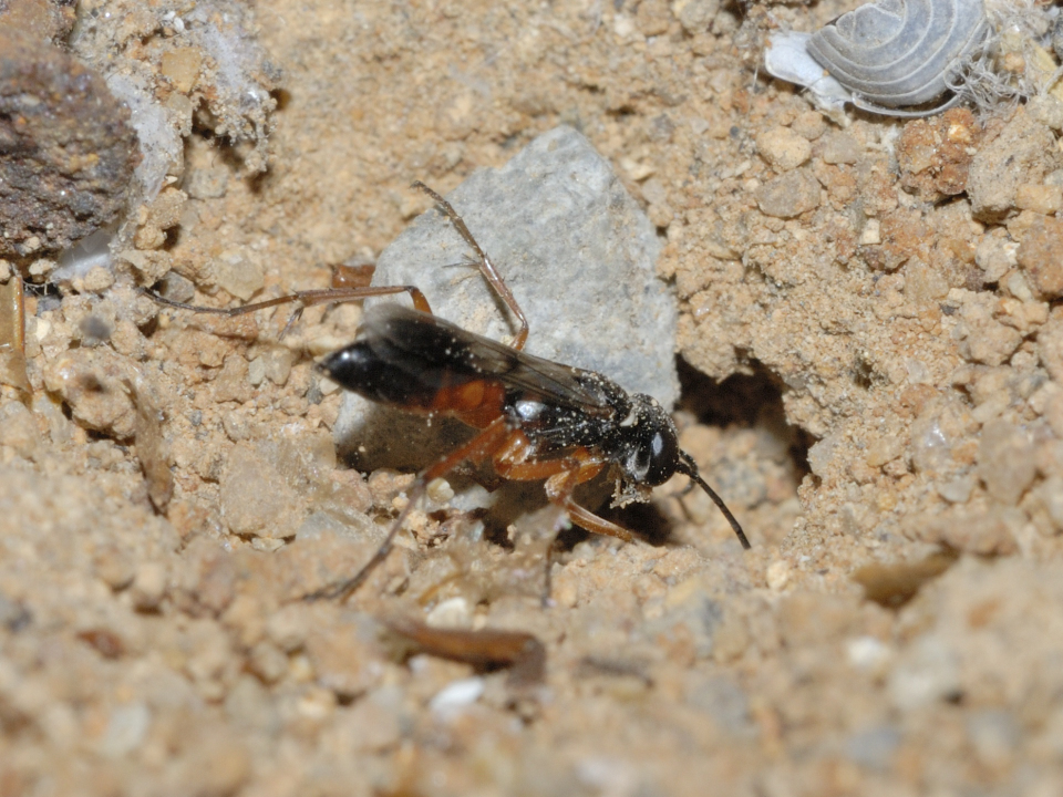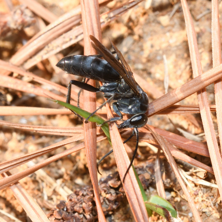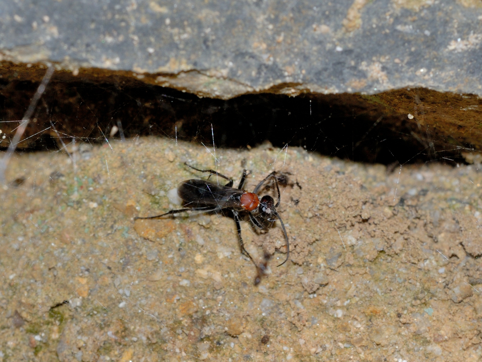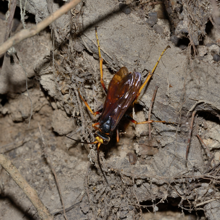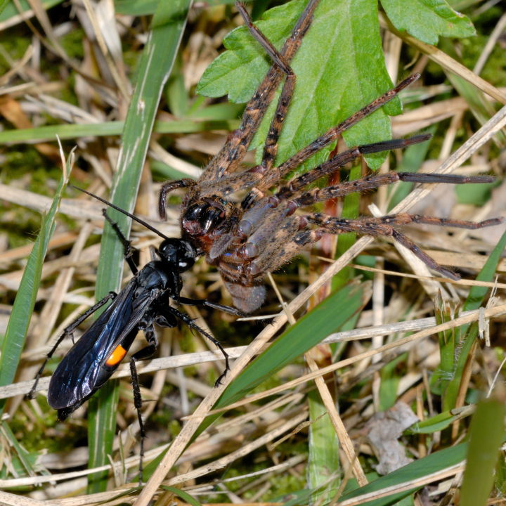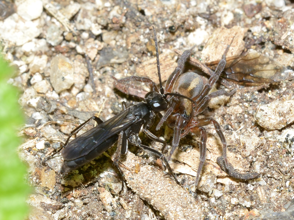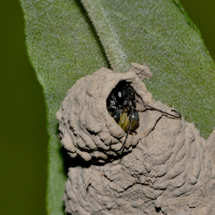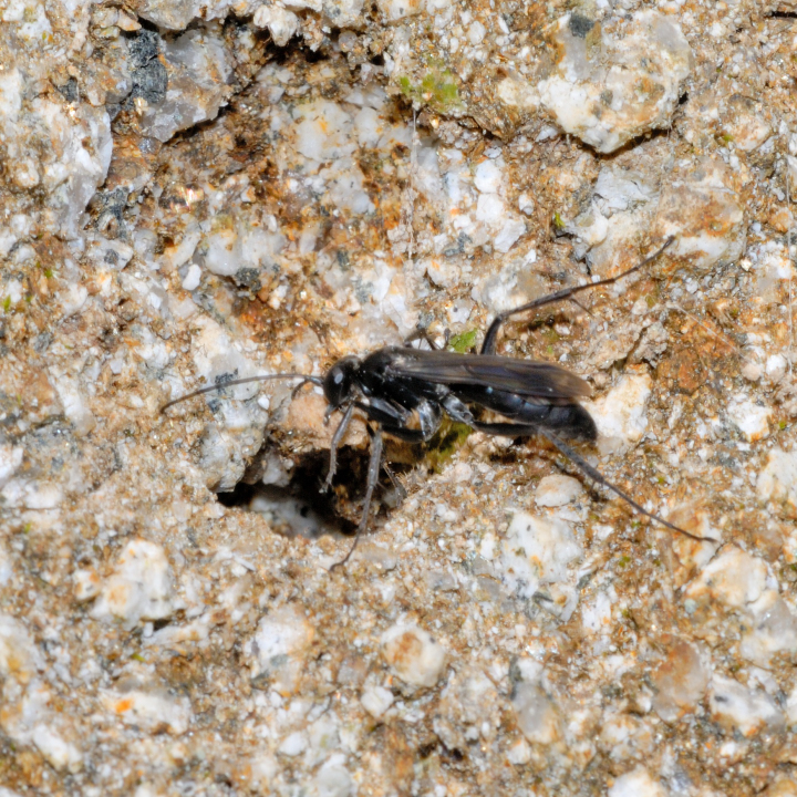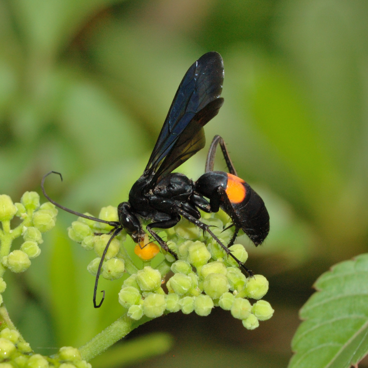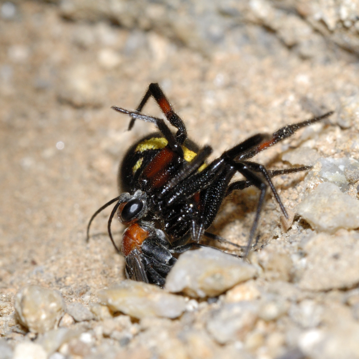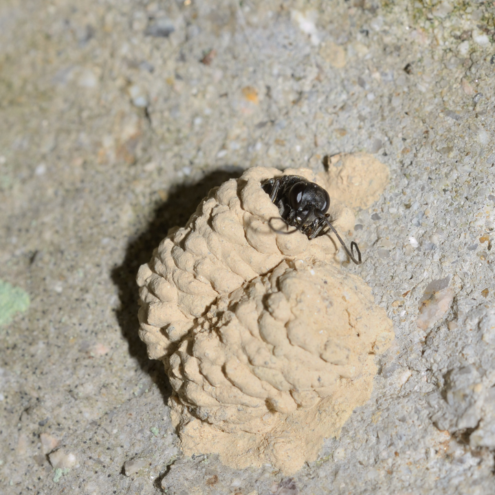 軟らかい土をすり鉢状に浅く掘って蜘蛛を搬入し、産卵して埋める行動を観察したが、もしかしたら少しの凹みを拡張して利用する様な習性の柔軟性を持つのかも知れない。