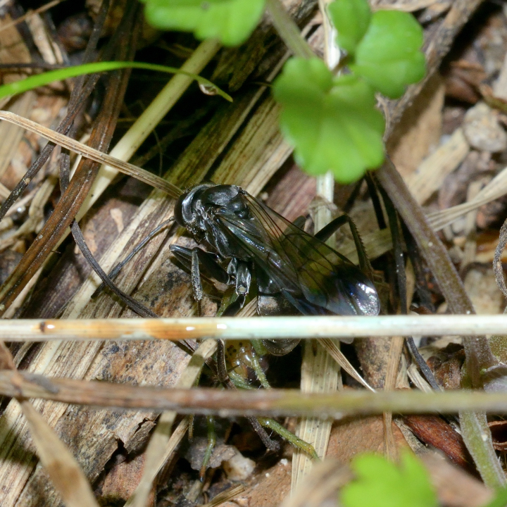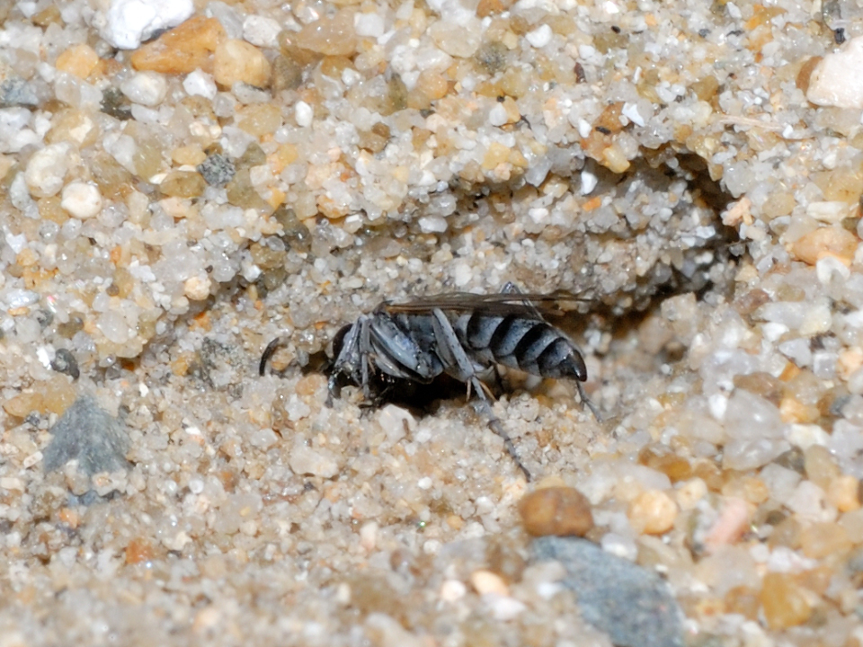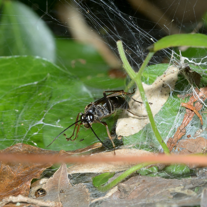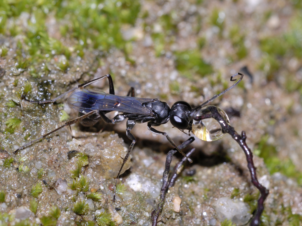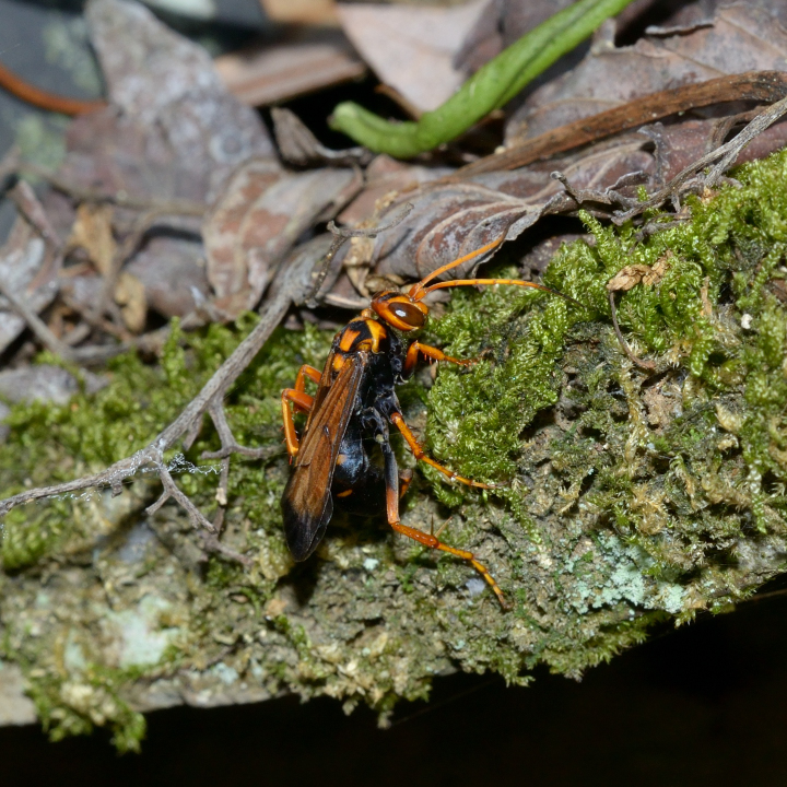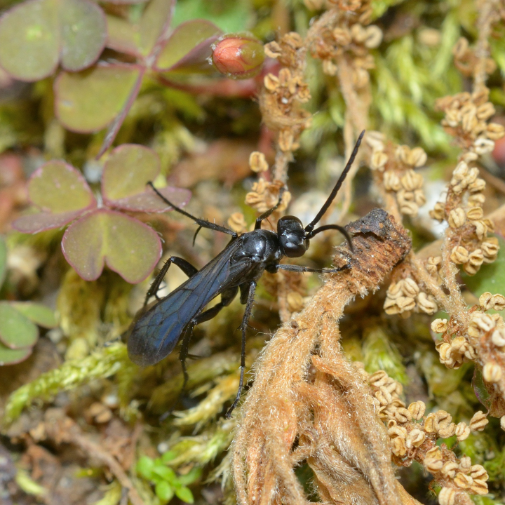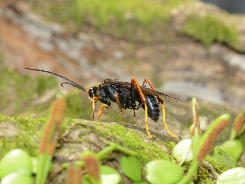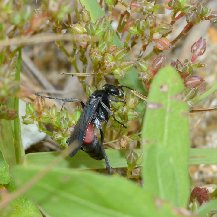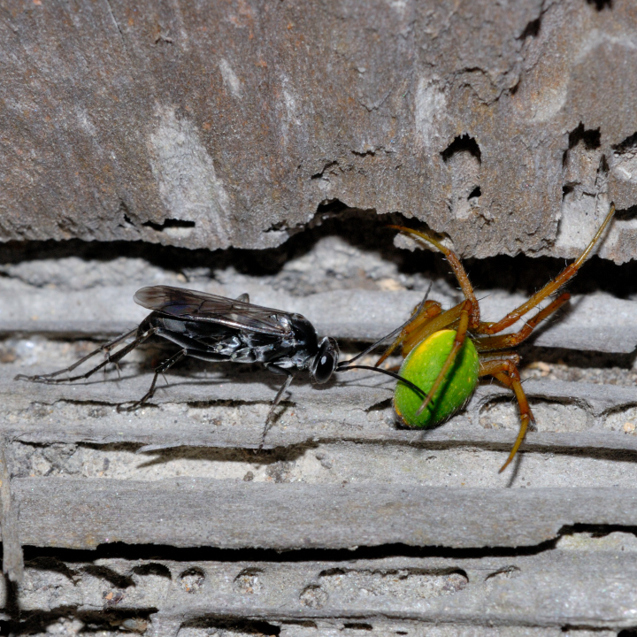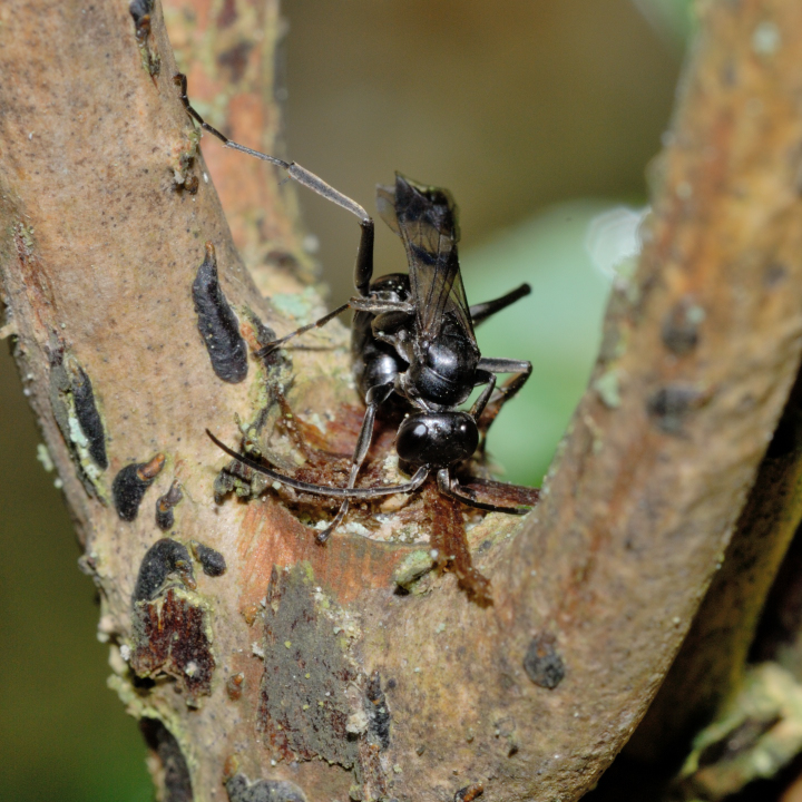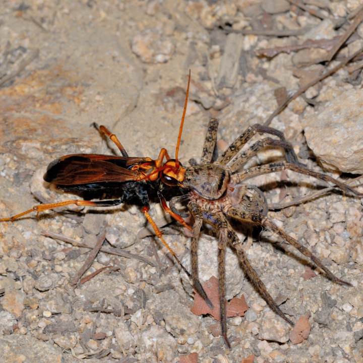 軟らかい土をすり鉢状に浅く掘って蜘蛛を搬入し、産卵して埋める行動を観察したが、もしかしたら少しの凹みを拡張して利用する様な習性の柔軟性を持つのかも知れない。