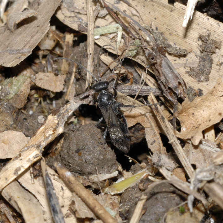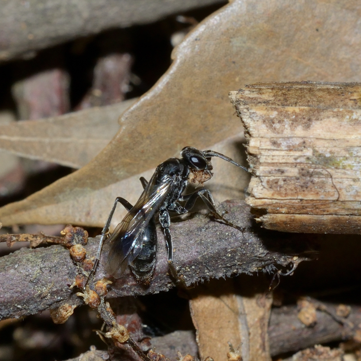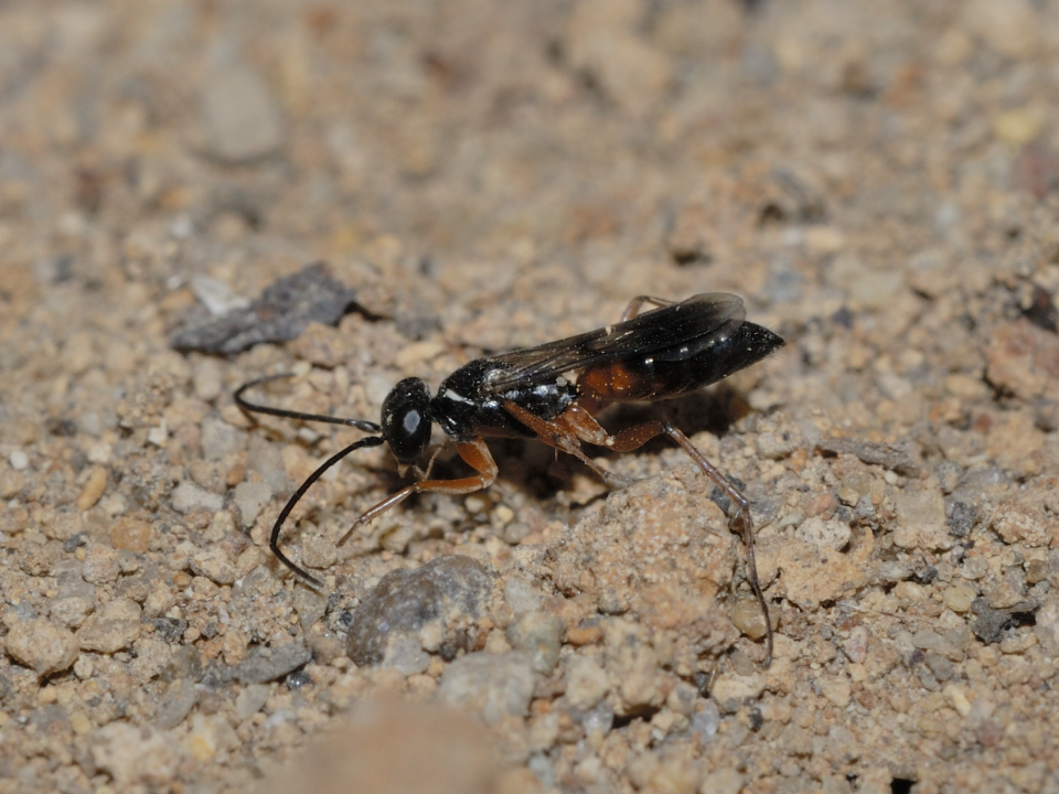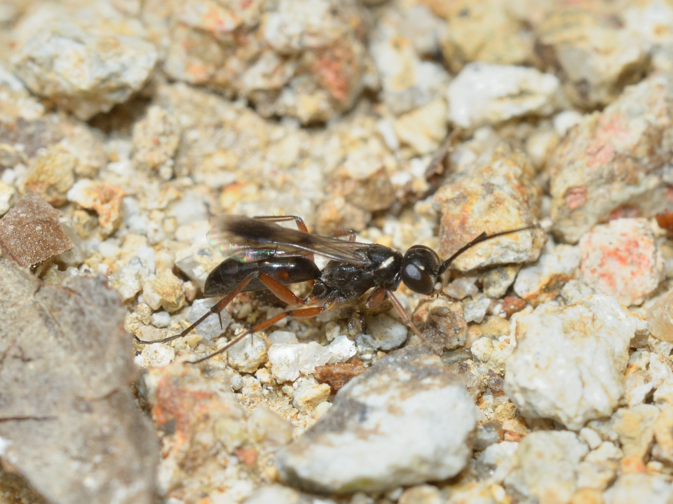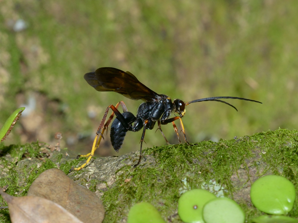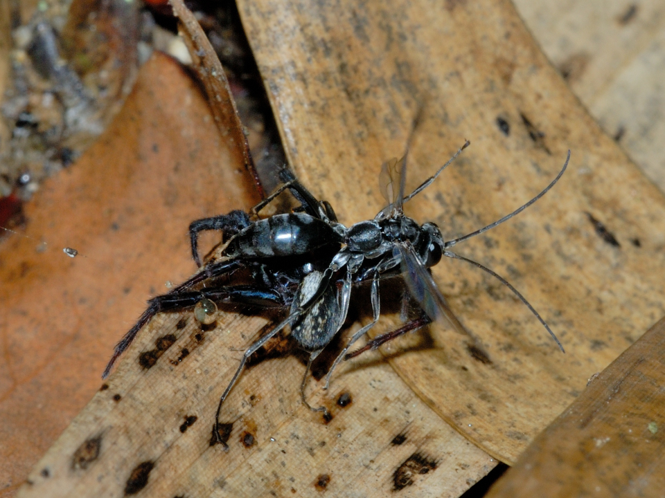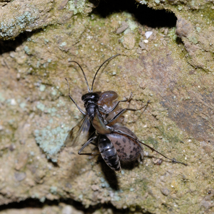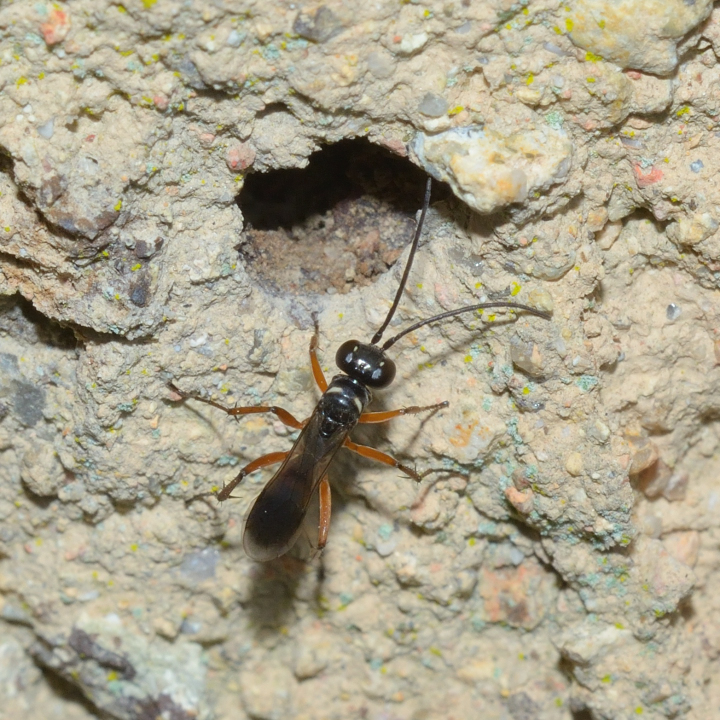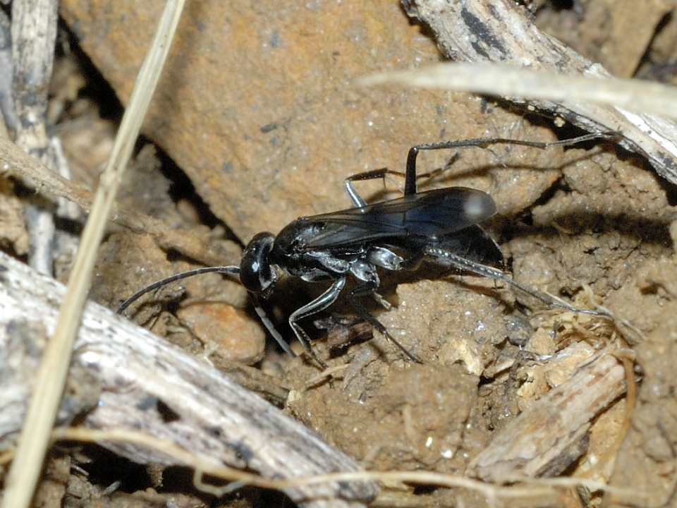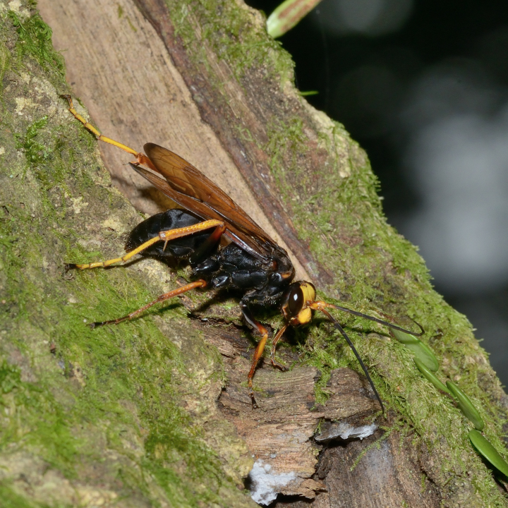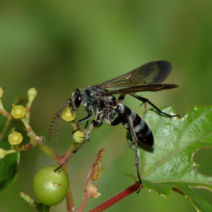 軟らかい土をすり鉢状に浅く掘って蜘蛛を搬入し、産卵して埋める行動を観察したが、もしかしたら少しの凹みを拡張して利用する様な習性の柔軟性を持つのかも知れない。