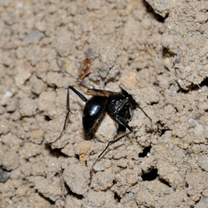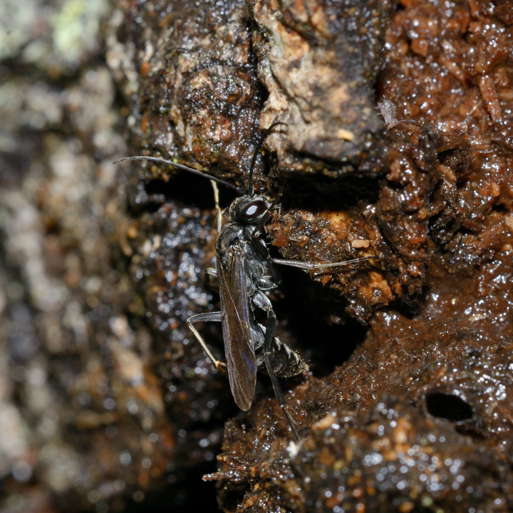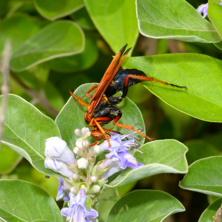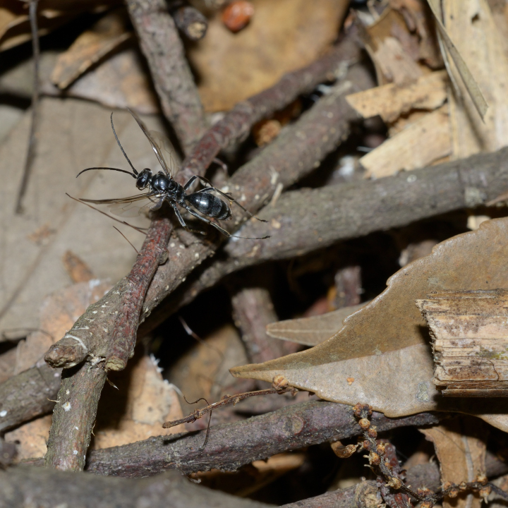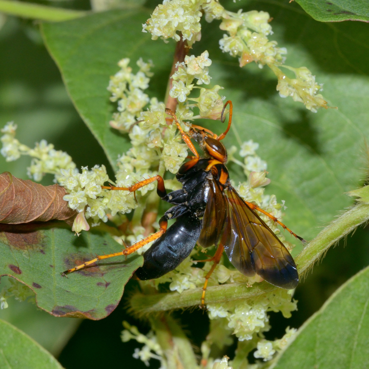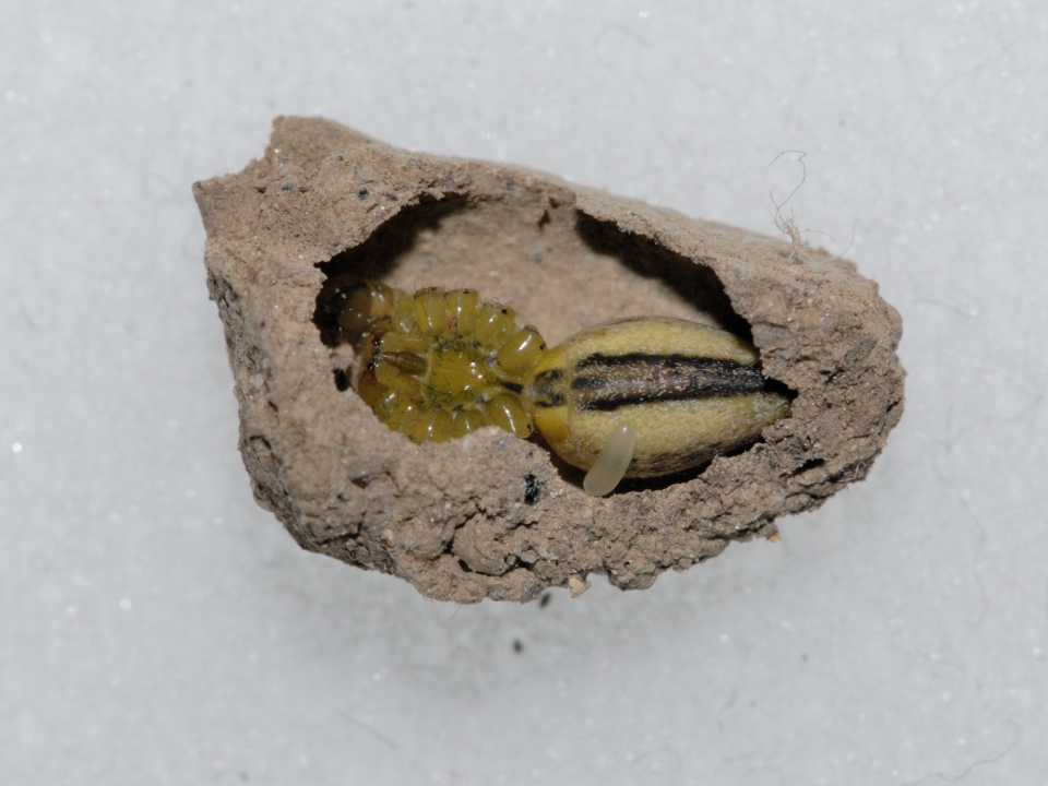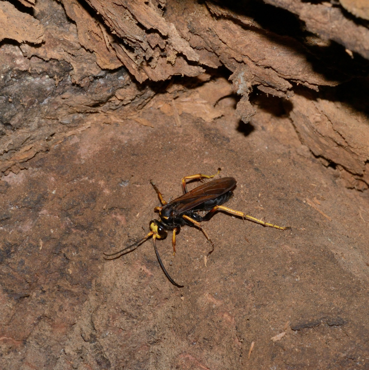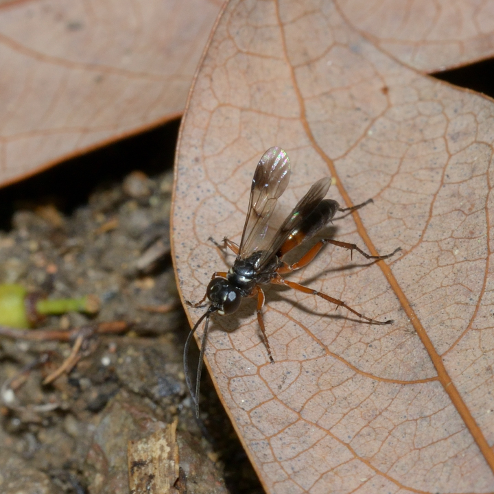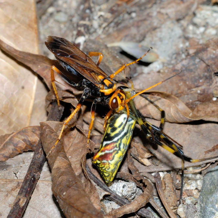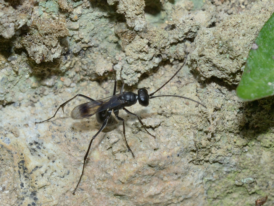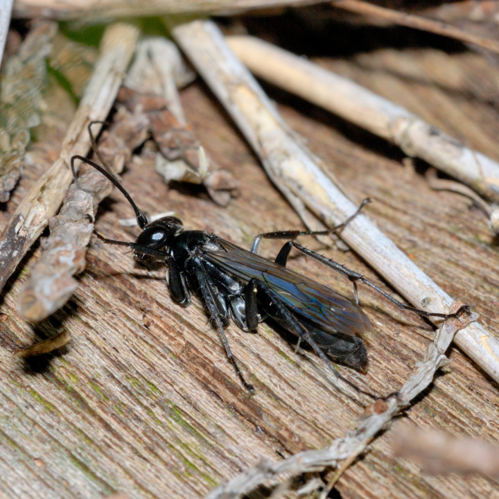 軟らかい土をすり鉢状に浅く掘って蜘蛛を搬入し、産卵して埋める行動を観察したが、もしかしたら少しの凹みを拡張して利用する様な習性の柔軟性を持つのかも知れない。