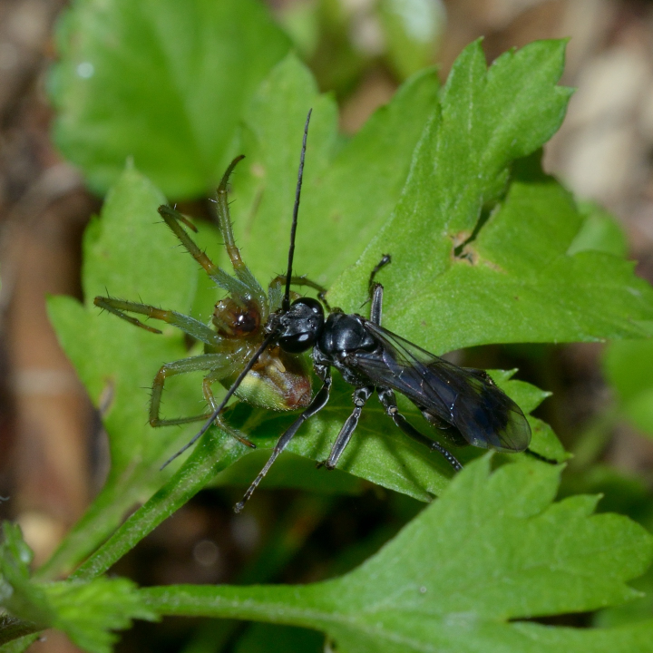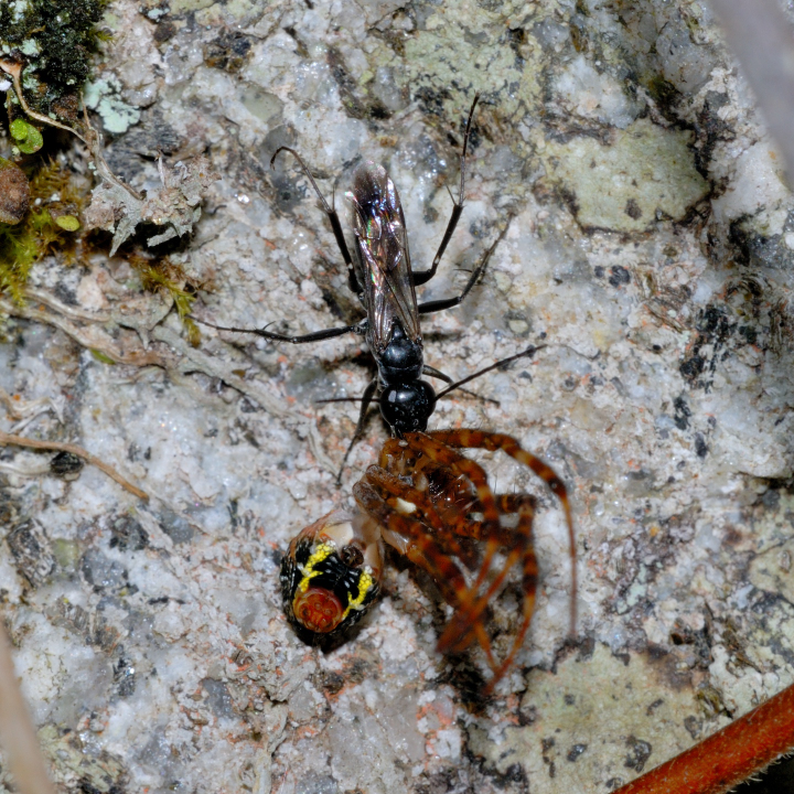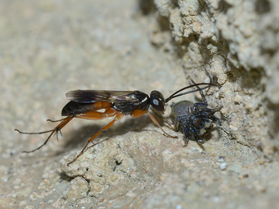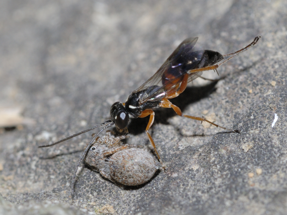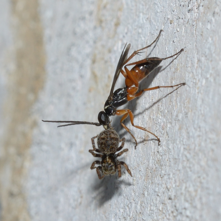 小型のクモバチで、ハエトリグモ科の蜘蛛を狩るが、ヨーロッパの記録として時々カニグモ科の蜘蛛を狩るという。