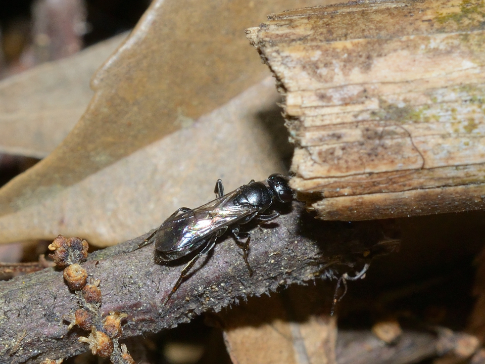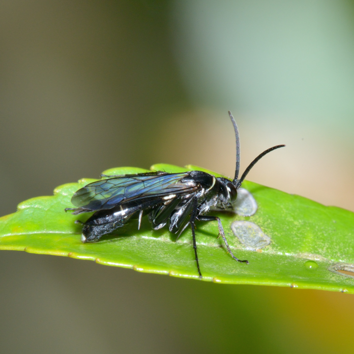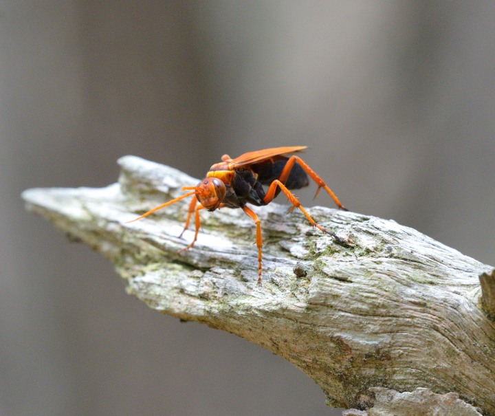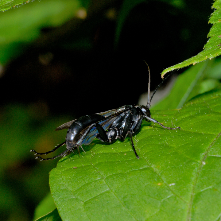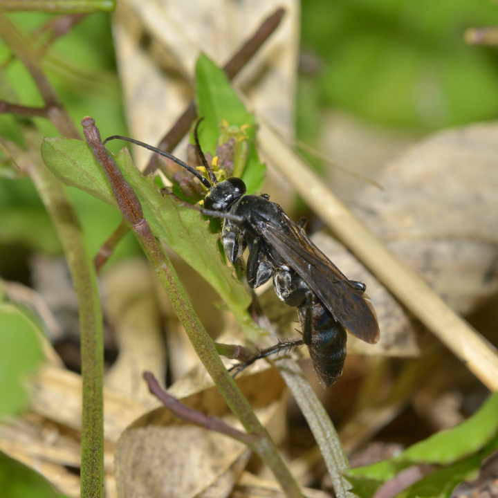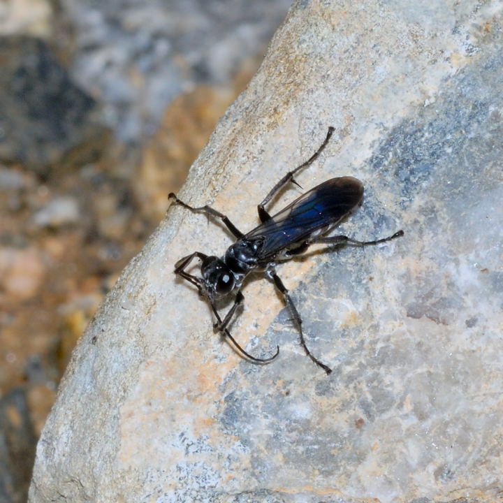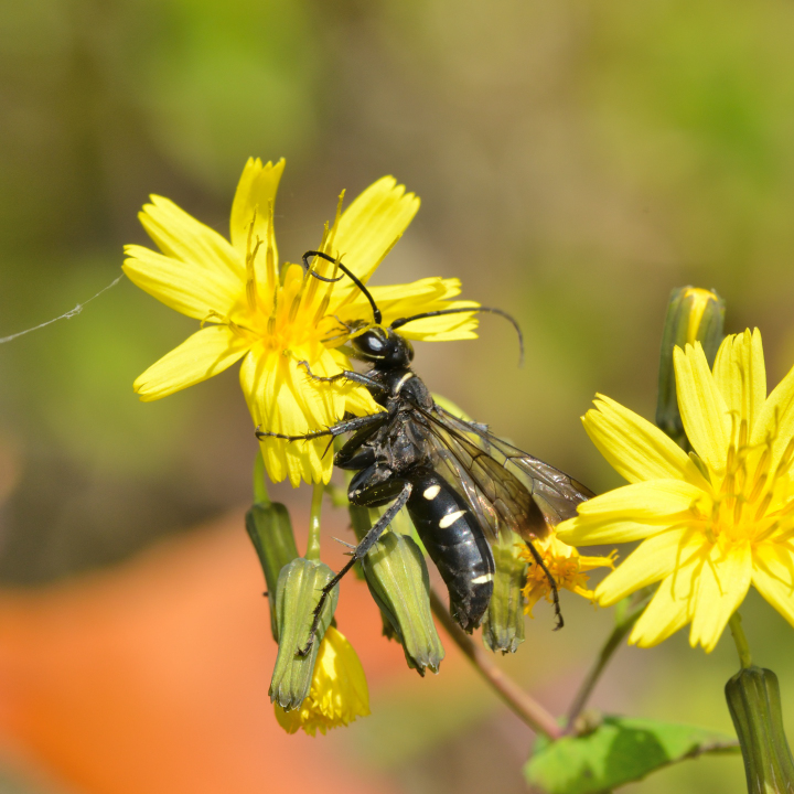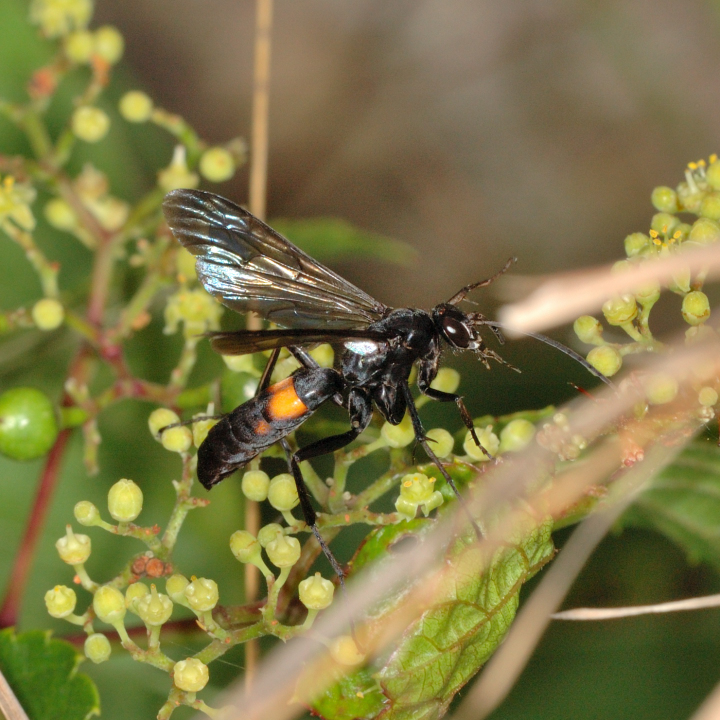 多くのクモバチがそうである様に営巣地にとどまりメスを待って飛び交う。