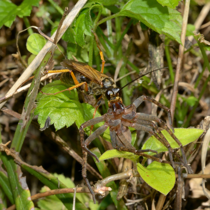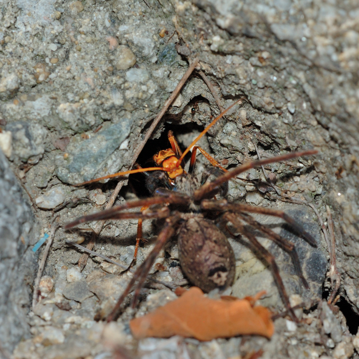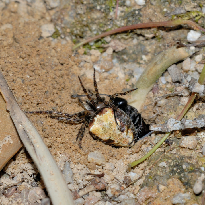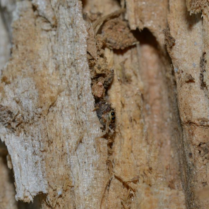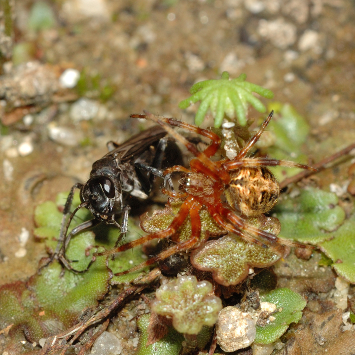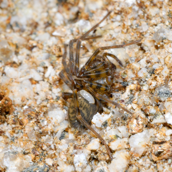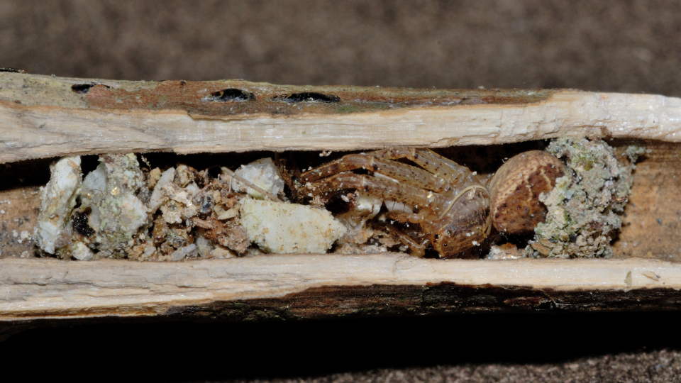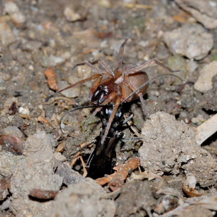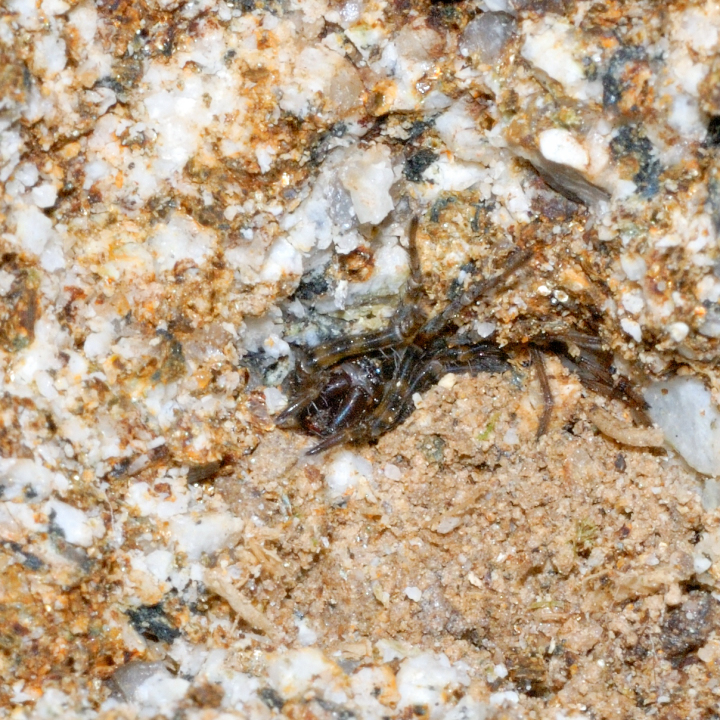 落ち葉の下や隙間に潜り込み、獲物のハエトリグモを探す。