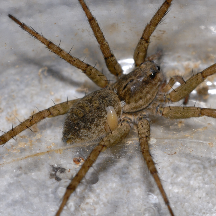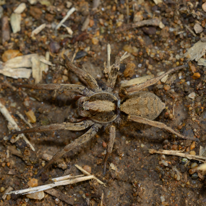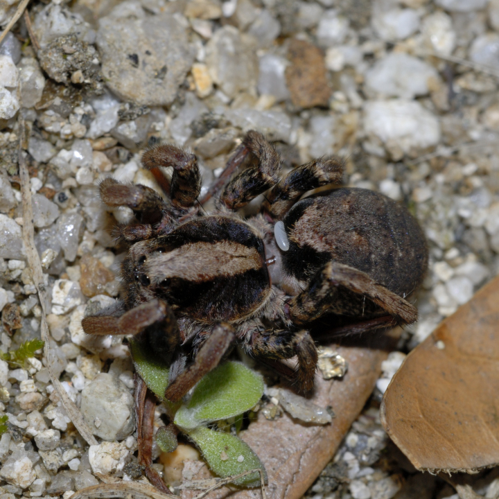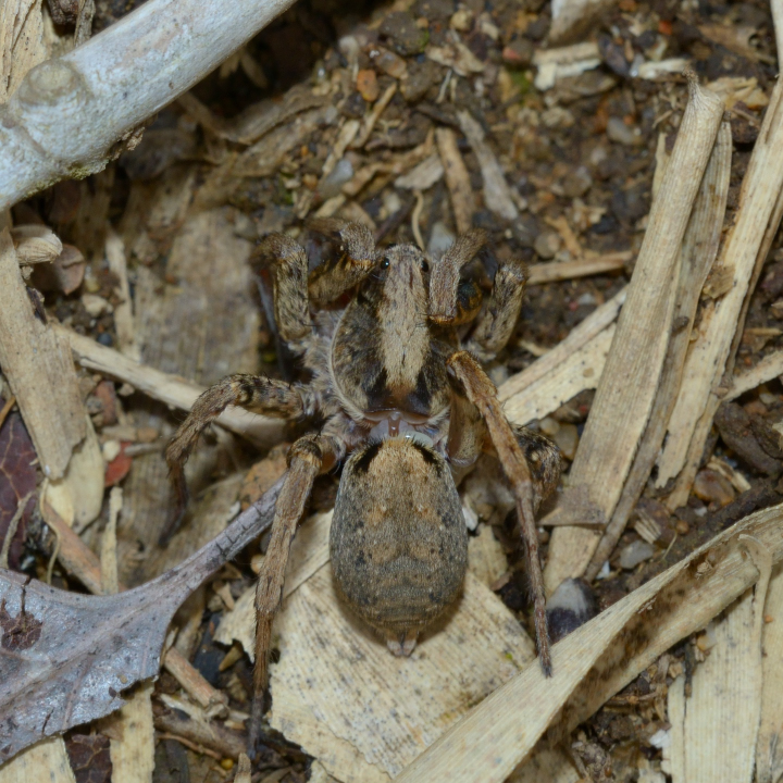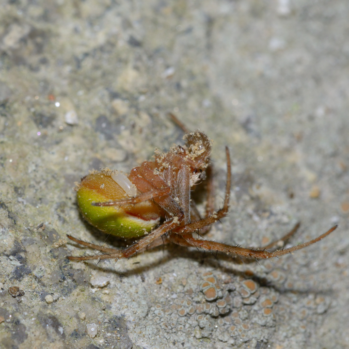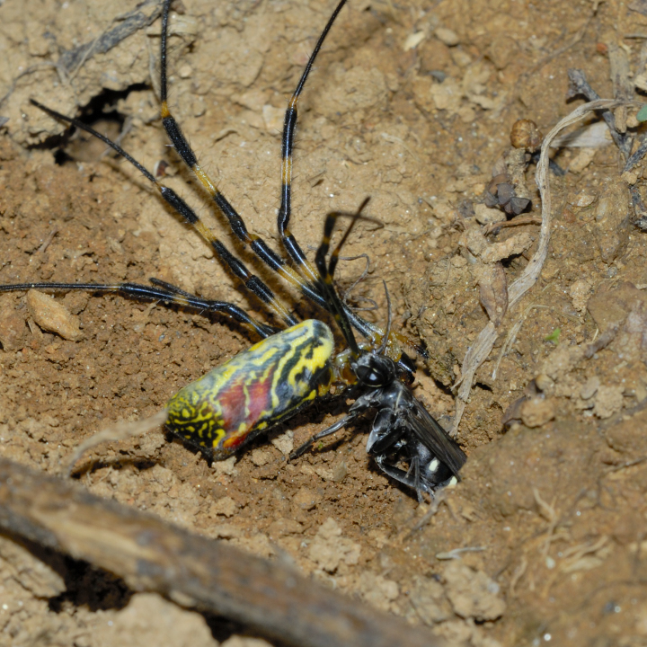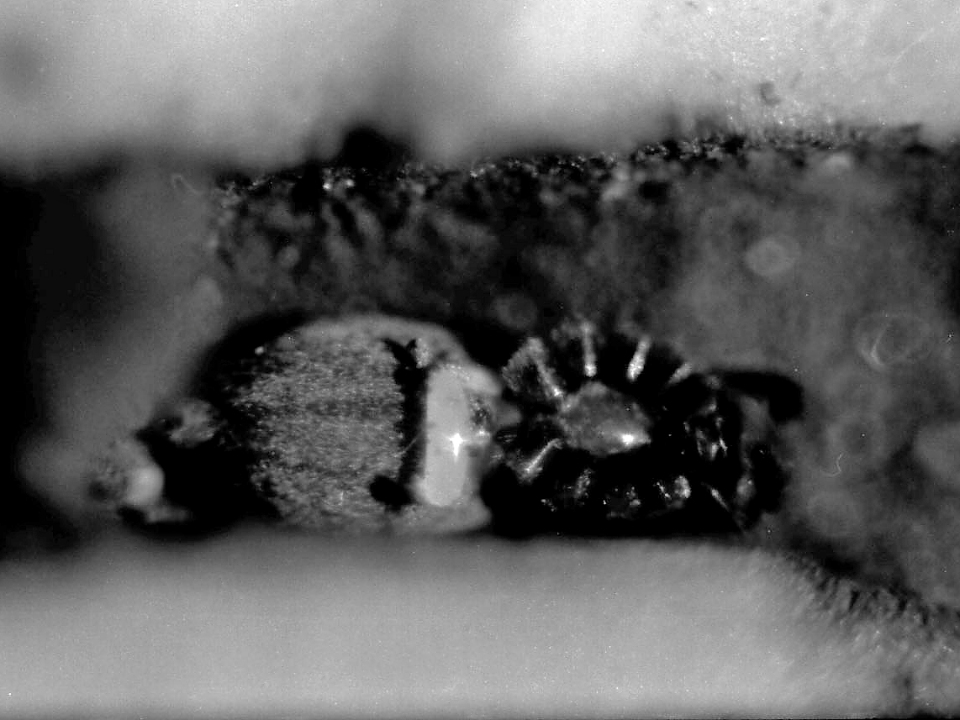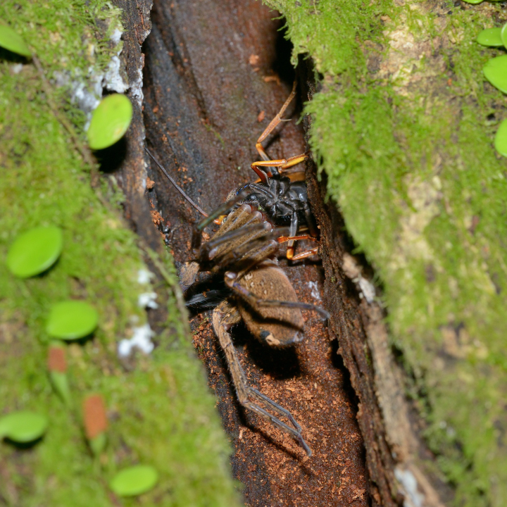 落ち葉の下や隙間に潜り込み、獲物のハエトリグモを探す。