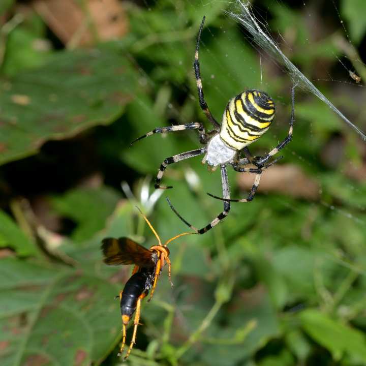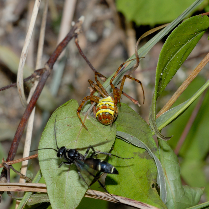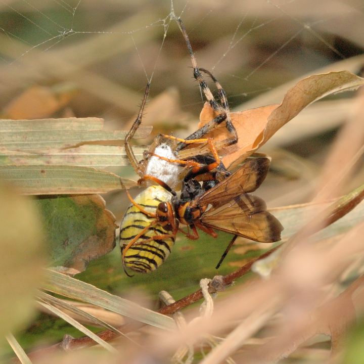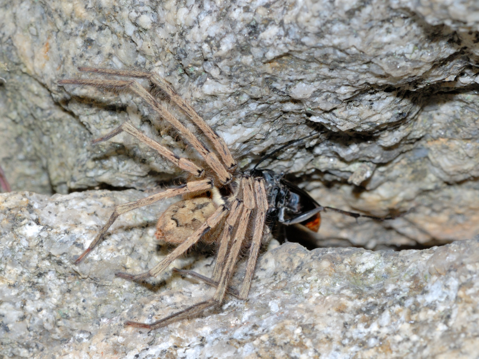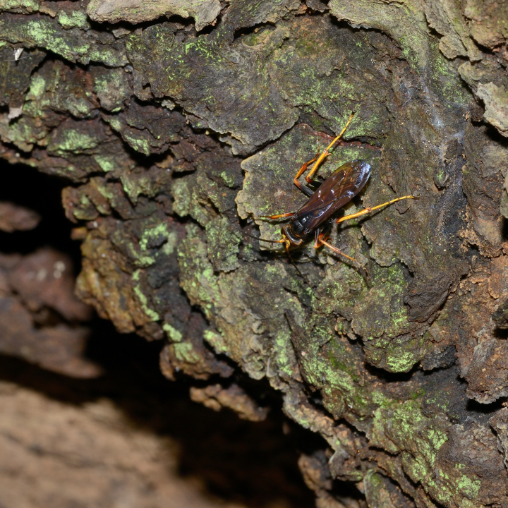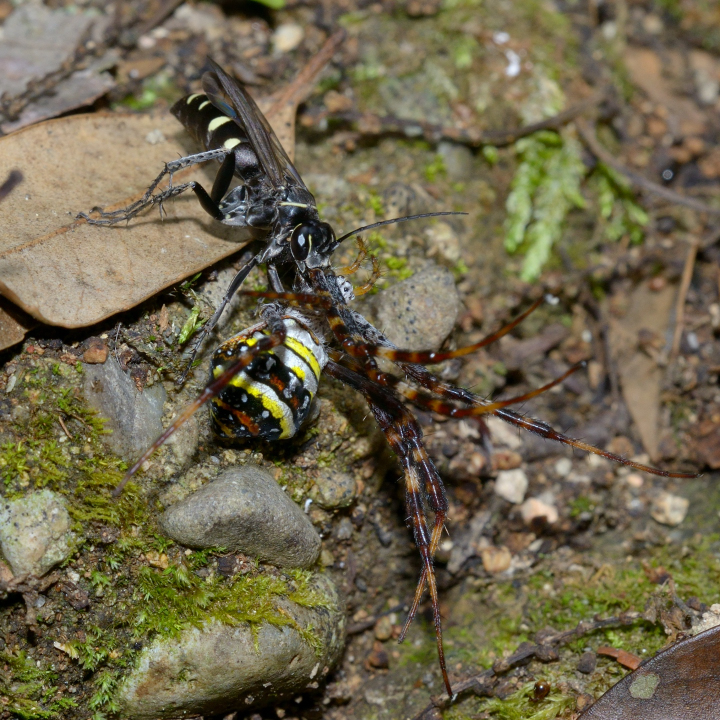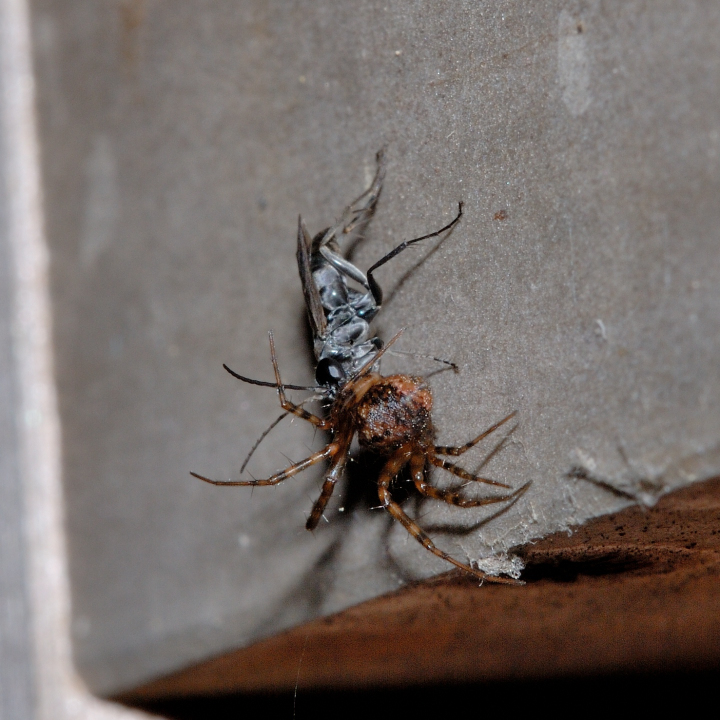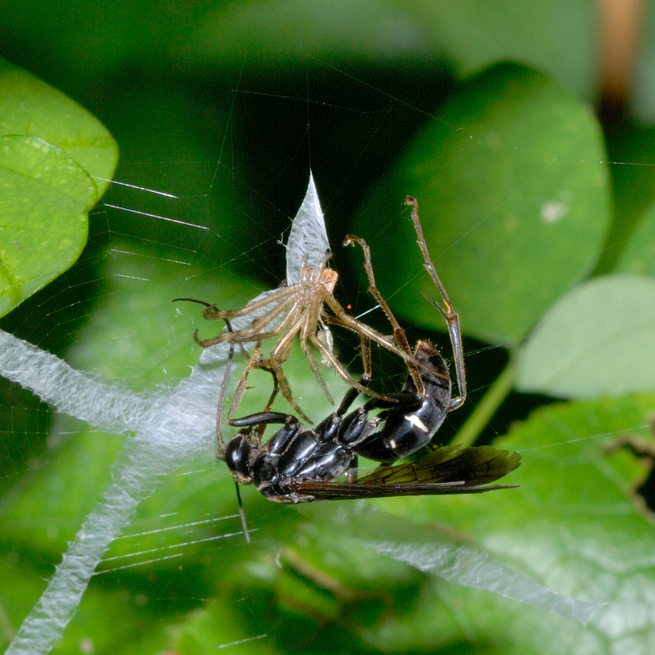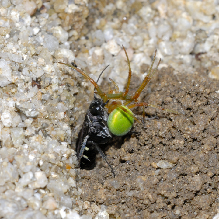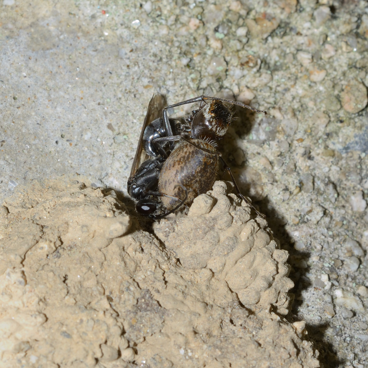 珍しくヒゲクモバチの様に出糸突起をくわえているが、運び出す一時的なものだった。