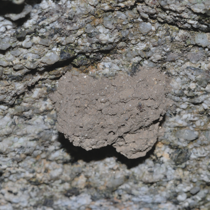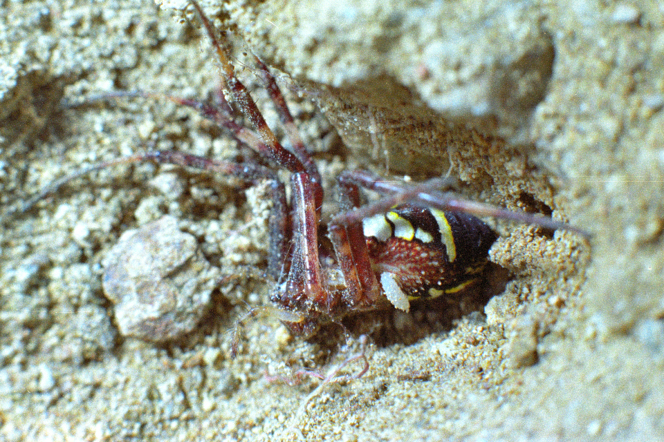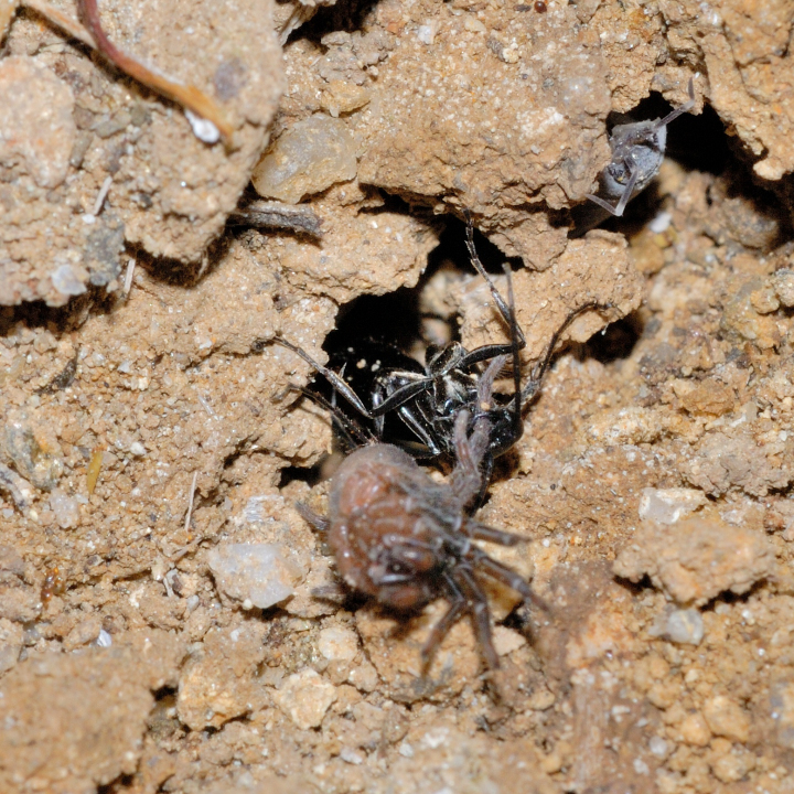 営巣基は坑道の体を成していなくても利用し、少しの窪みに蜘蛛を搬入してその上に砂粒を積み上げる事もあるという。