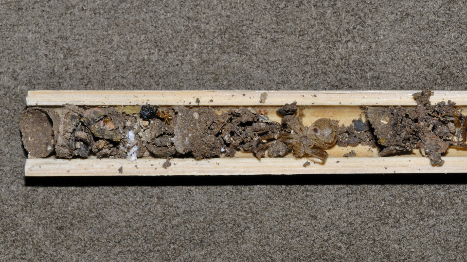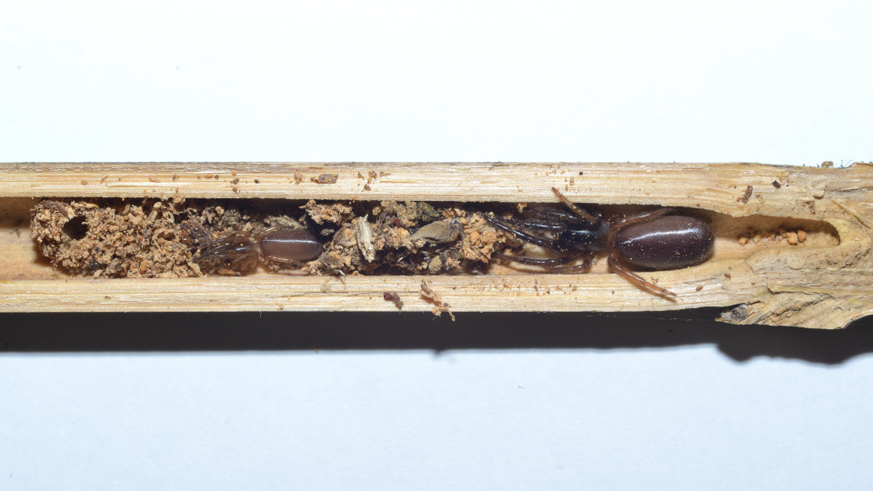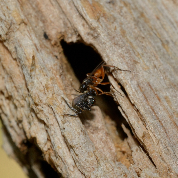 迷わず登ってきて、最初に搬入した孔から手ぶらで出てきて周りを探索したので、巣材を採るのかとおもったが、暫くしてから再び蜘蛛を咥えて出てきた。