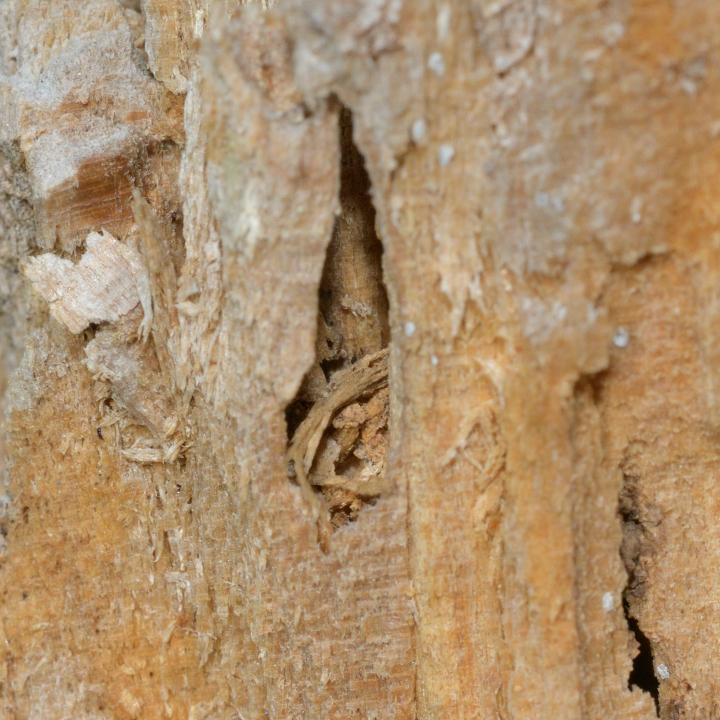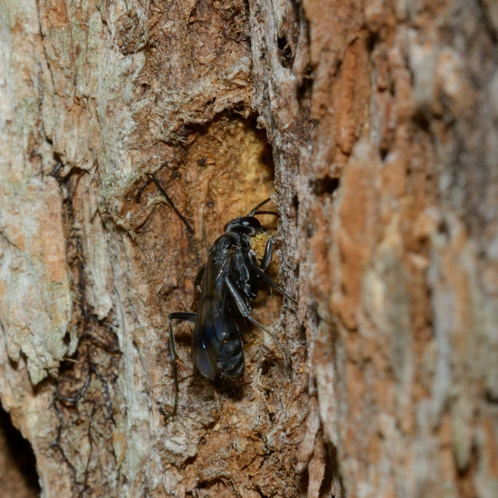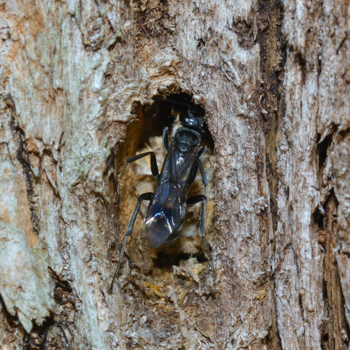 朽木に開いた孔にアオオビハエトリを搬入する。