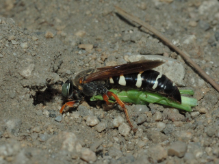 獲物も特大の鱗翅目の幼虫になるが、この時は3cm半はありそうな、フトスジエダシャクの幼虫を狩って、まさにこれから育房に押し込むところだった。