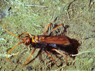 チュウヒメクモバチという、クモバチ科・ムカシクモバチ亜科・ヒメクモバチ属に属する、1cm内外の真っ黒なヒメクモバチで、属中ではやや大型の種になる。