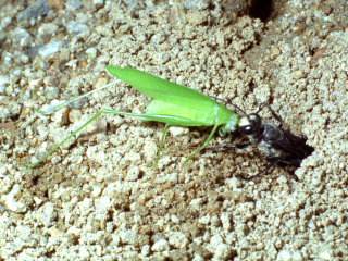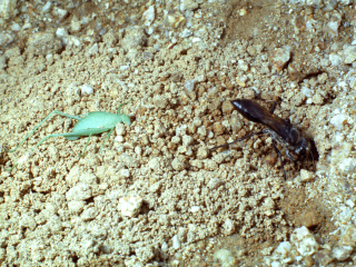 【育房から這い出てくるヒメコオロギバチの獲物】