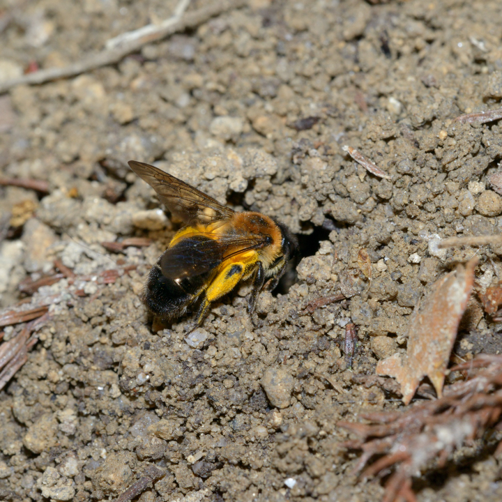 後肢に花粉を集め、巣穴に入るメス。