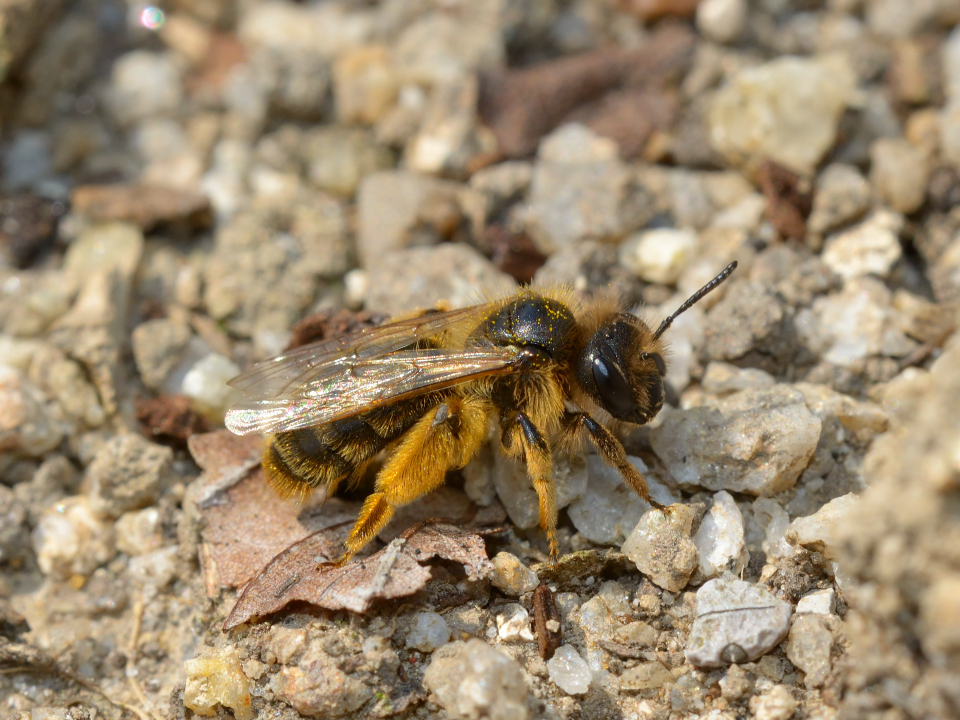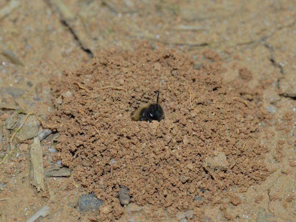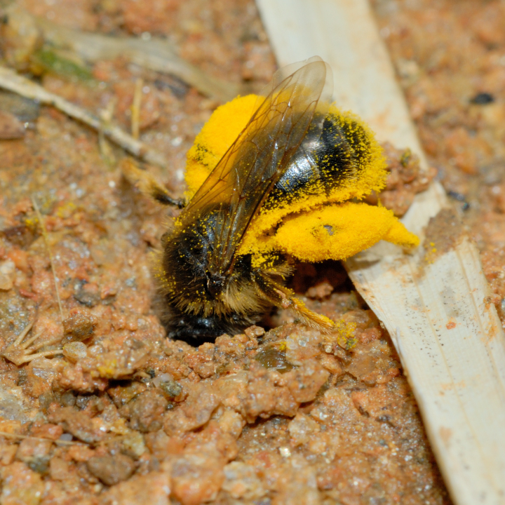 営巣地の地面に、花粉を集めて戻るメス。