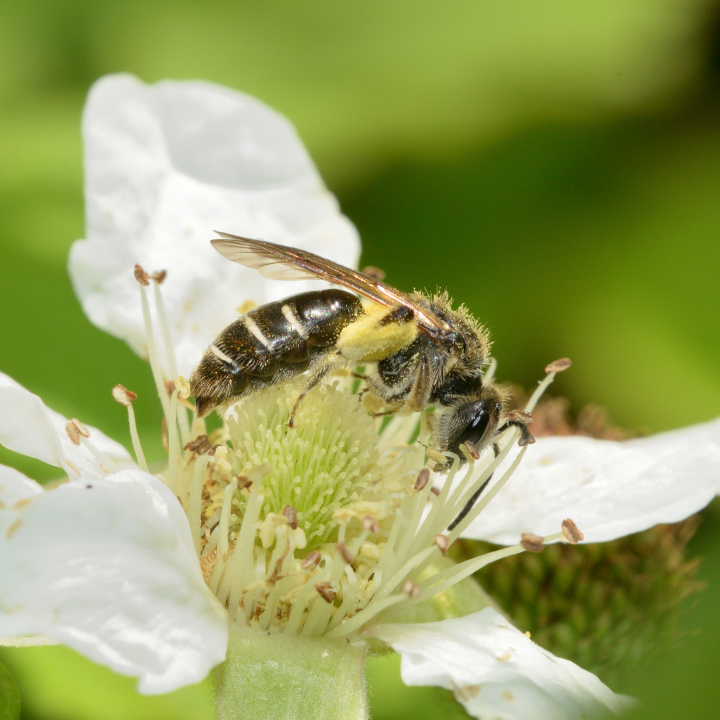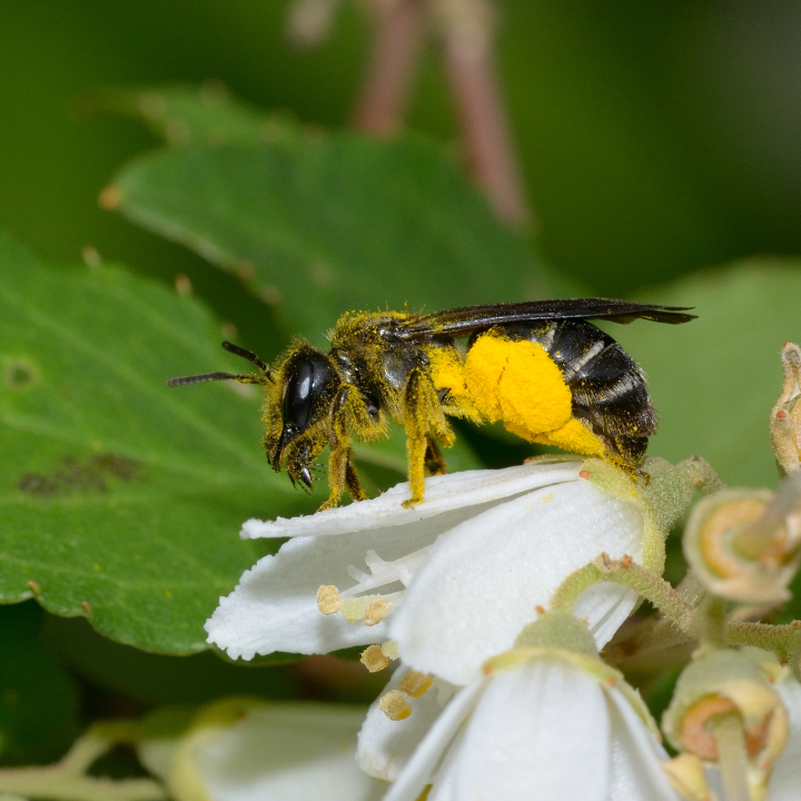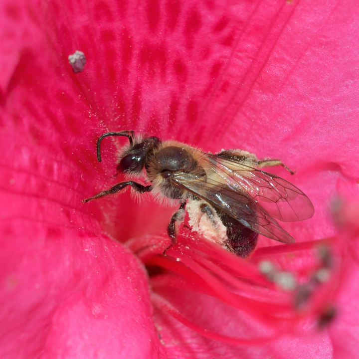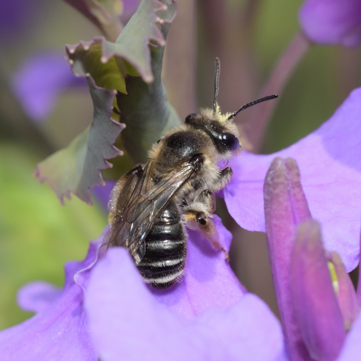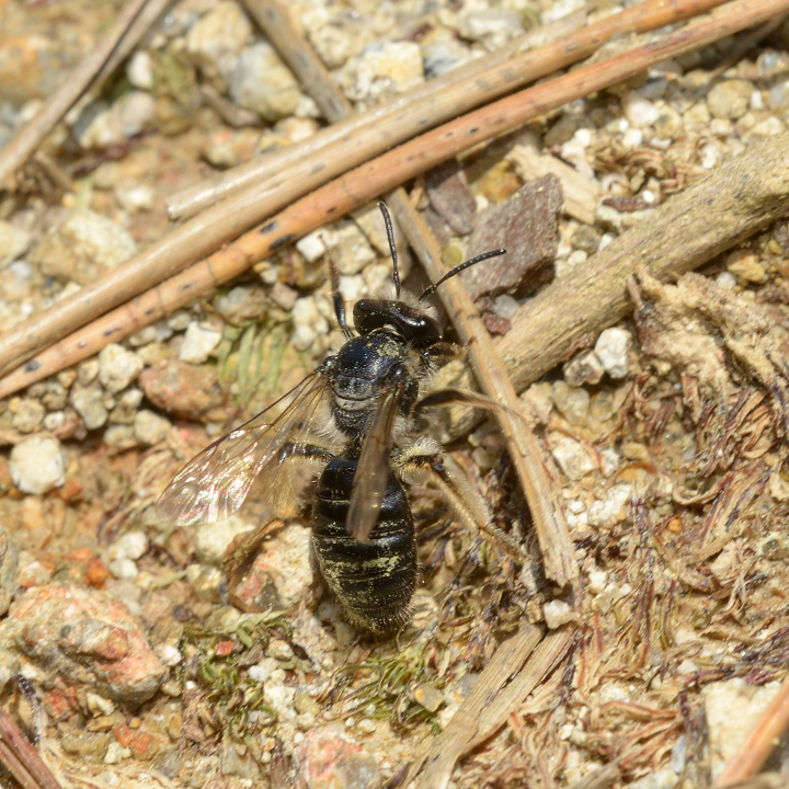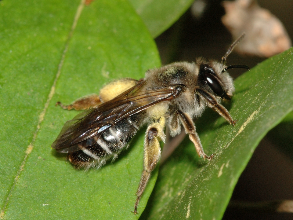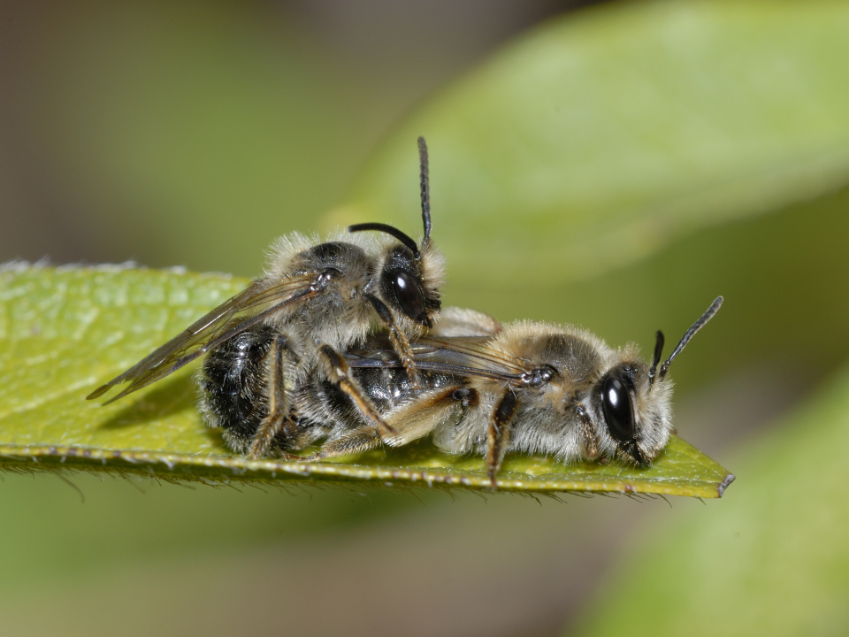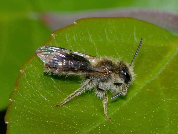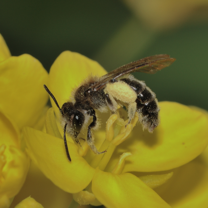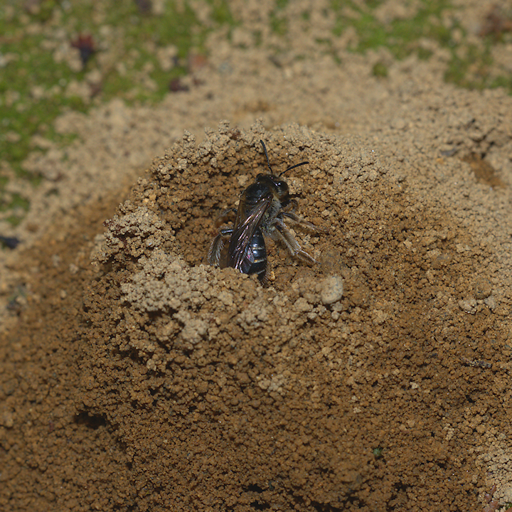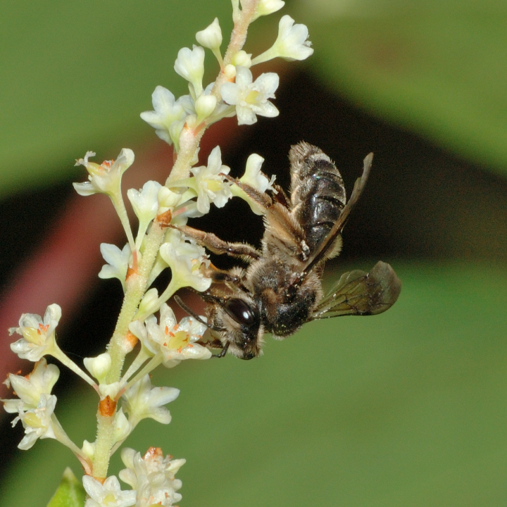 越冬世代は気温のせいもあり、動きに活発さを欠くが、第一世代は翅を半開きにして、遠目にはハキリバチの様に活発に花を渡る。
