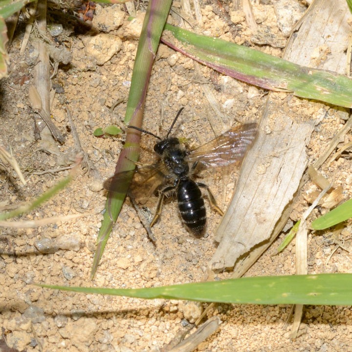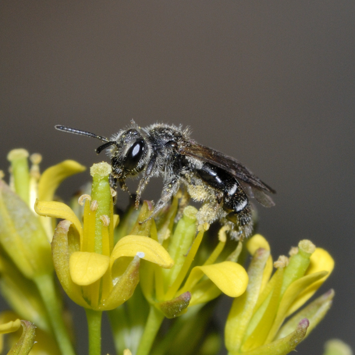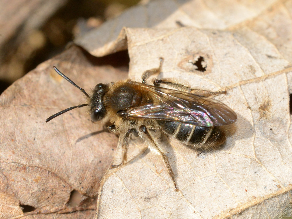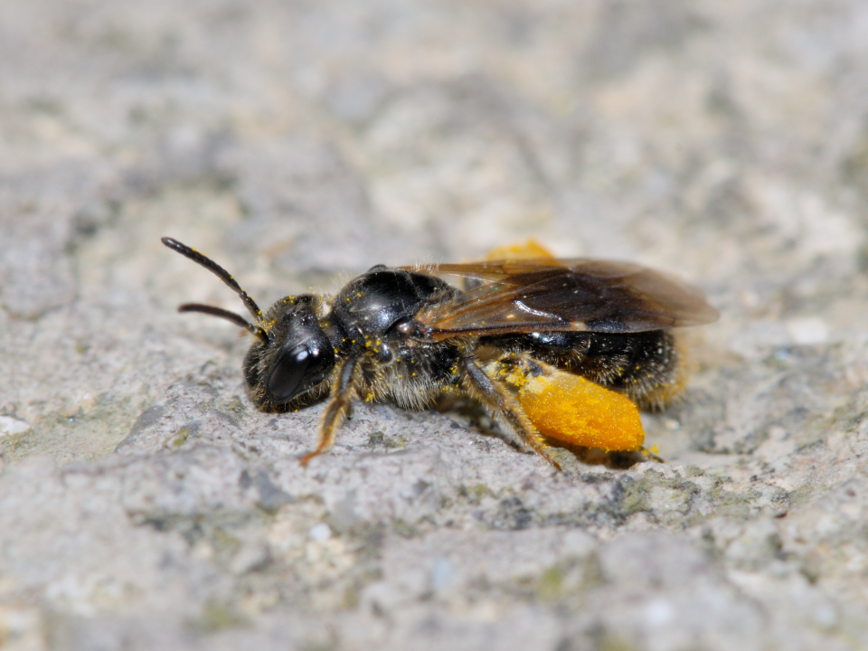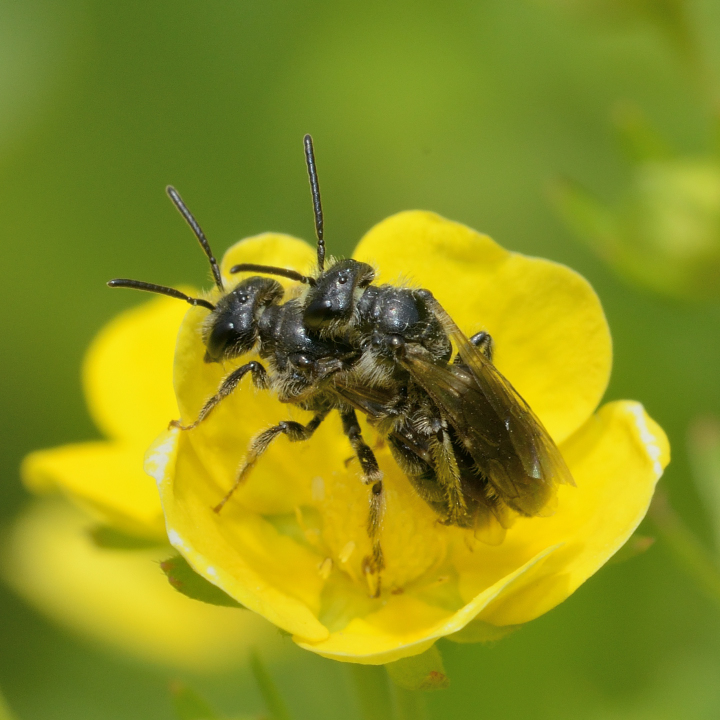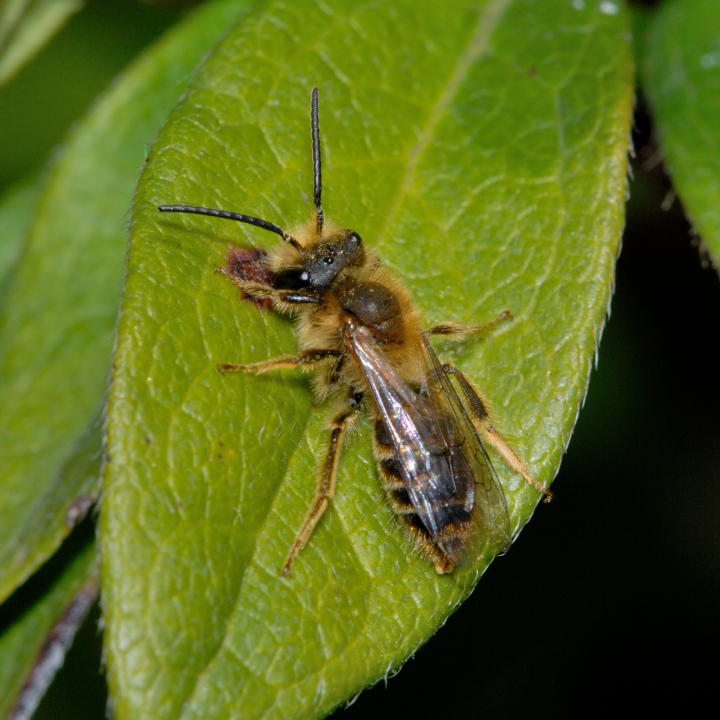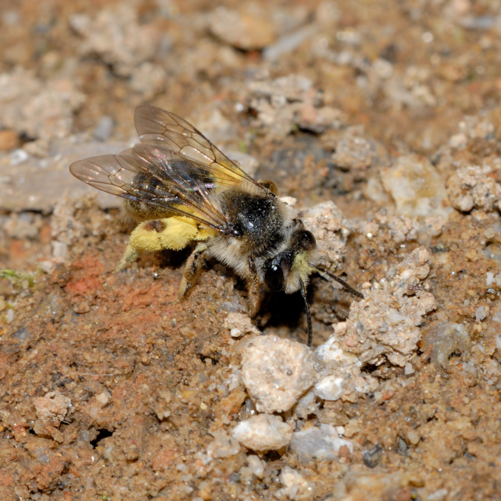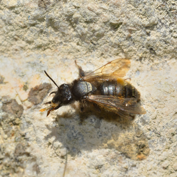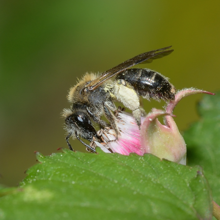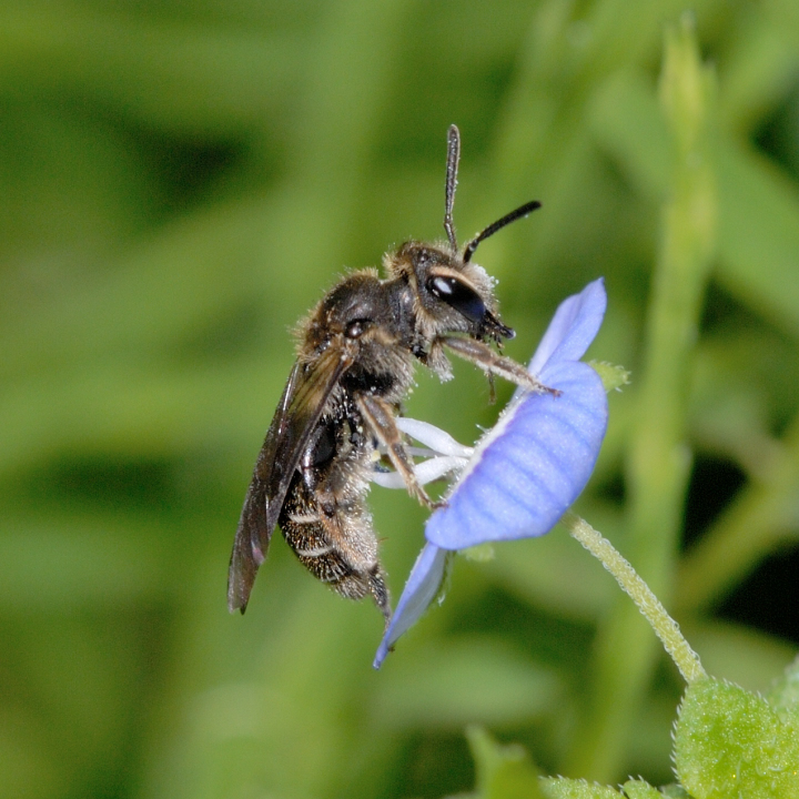 越冬世代は気温のせいもあり、動きに活発さを欠くが、第一世代は翅を半開きにして、遠目にはハキリバチの様に活発に花を渡る。