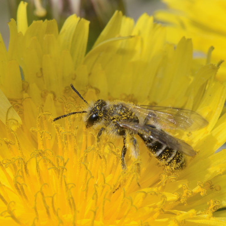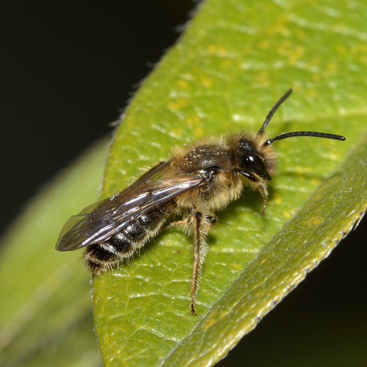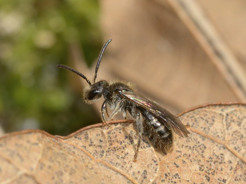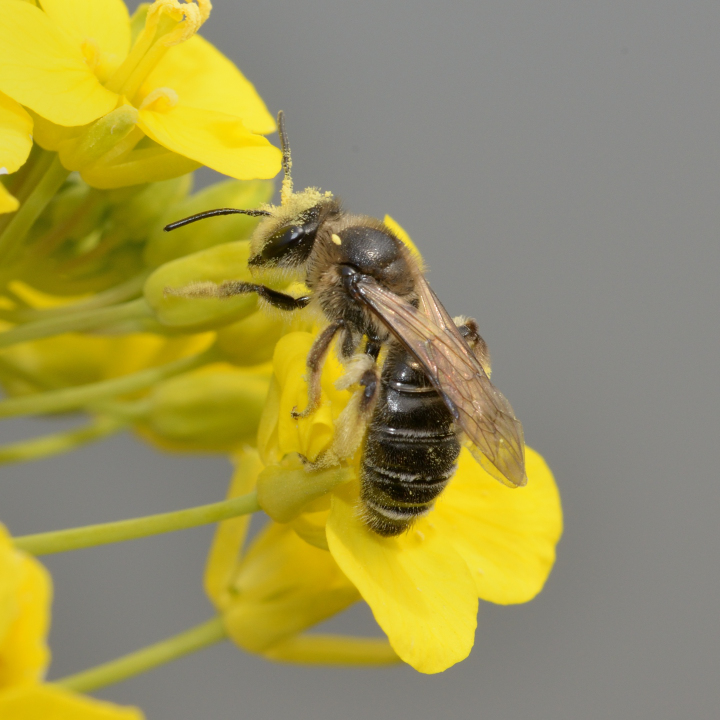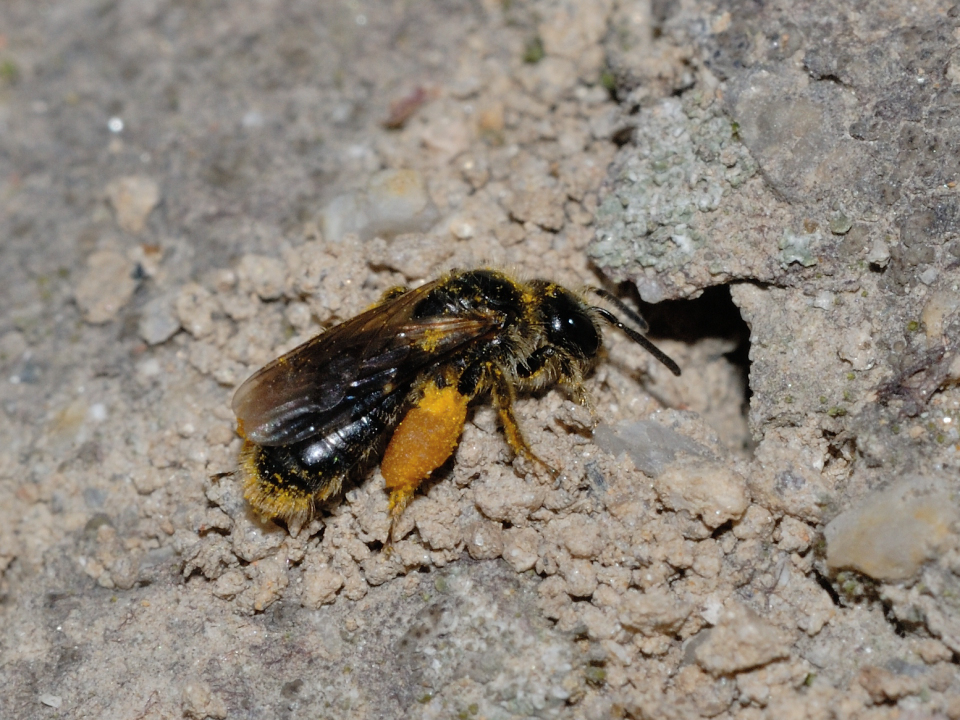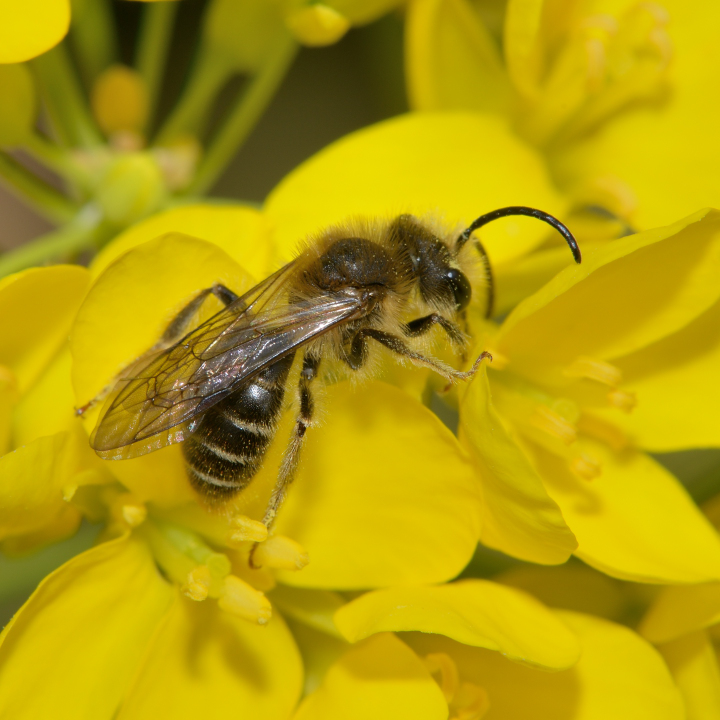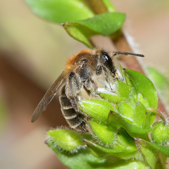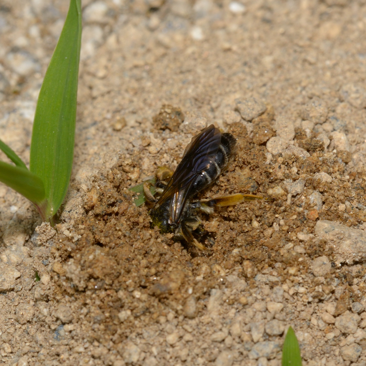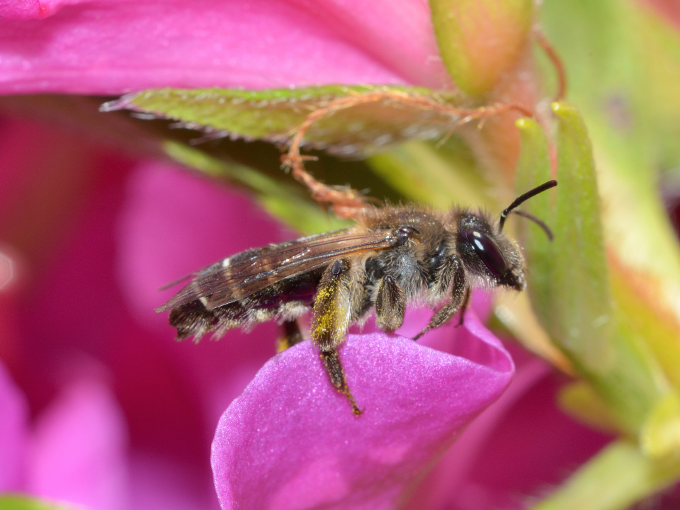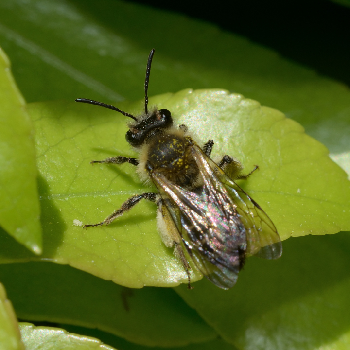 越冬世代は気温のせいもあり、動きに活発さを欠くが、第一世代は翅を半開きにして、遠目にはハキリバチの様に活発に花を渡る。