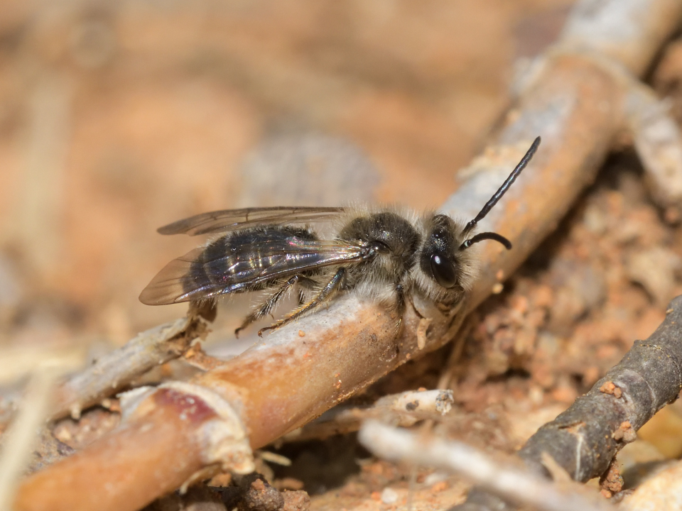 この種やコガタウツギヒメハナバチのオスは、この様に営巣地で活発に飛び交い、メスの訪れや羽化を待つ。
