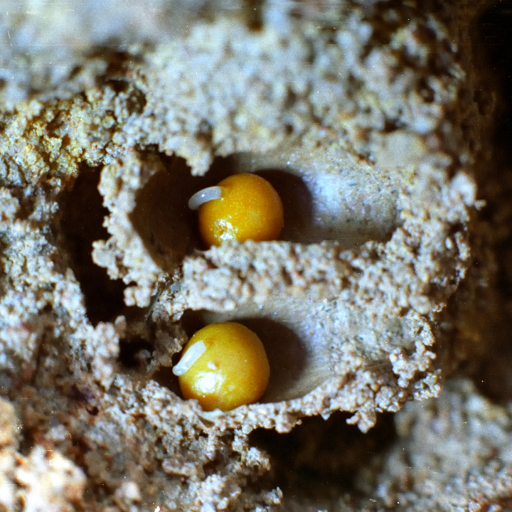 大きな空間の中に、削りだされた様な形の育房が複数有る。