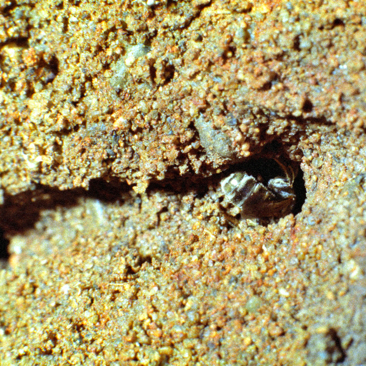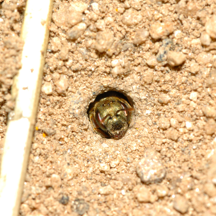 後肢に花粉を付け、巣穴に入るメス。