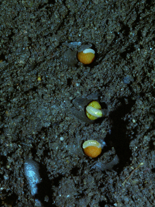 3つの育房それぞれに花粉団子と幼虫が入っている。
