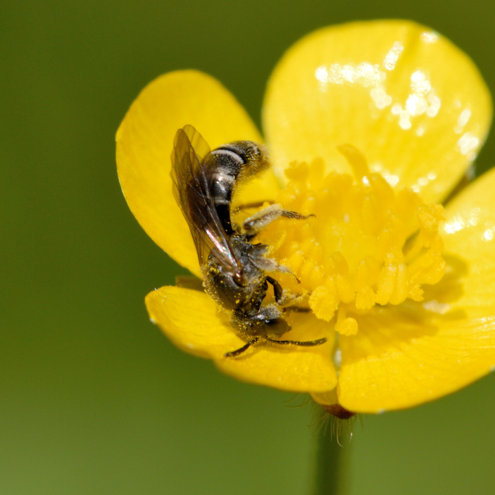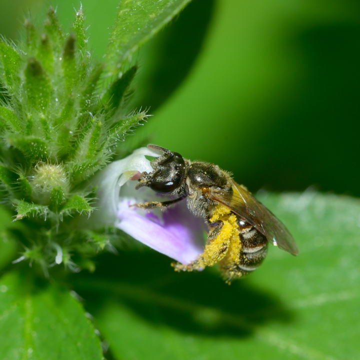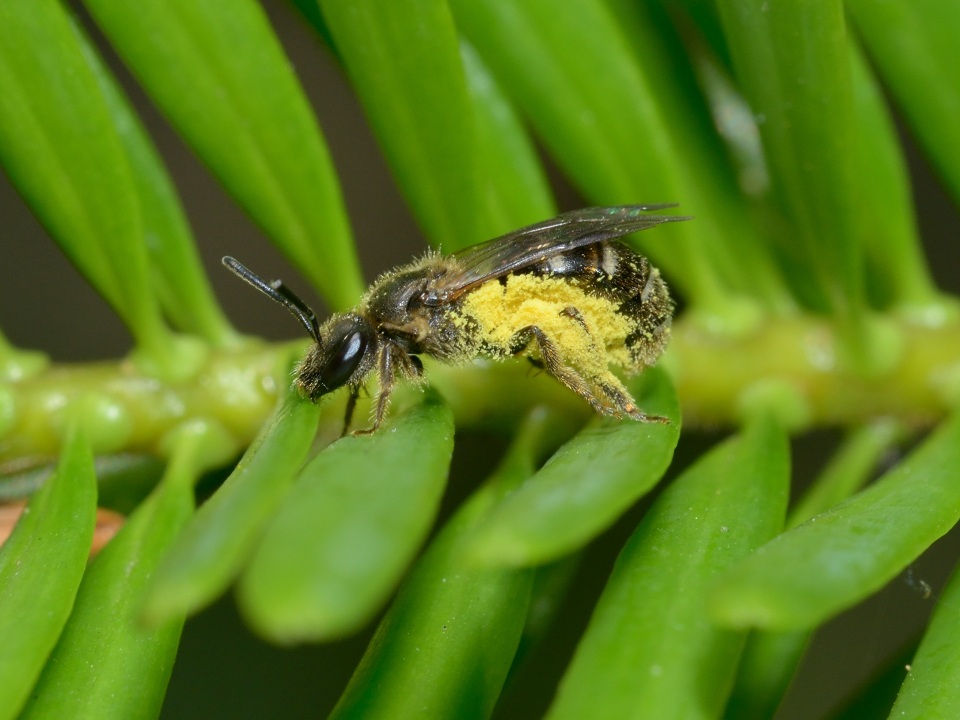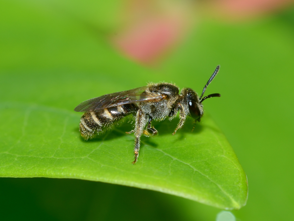チビコハナバチの一種 Lasioglossum(Evylaeus) sp. 【体長】約5-6mm。 【発生期】春季。詳細は不明。 【分布】不明。 小型のコハナバチ。 地中に営巣し、花粉蜜を団子にして産卵すると思われる。 葉上で休むメス。 2024年6月1日、兵庫県加古川市。 ウマノアシガタを訪花するメス。 2011年5月15日、佐賀市。 花粉を運ぶメス。 2024年6月8日、兵庫県姫路市。 キツネノマゴを訪花するメス。 2025年9月21日、兵庫県加古川市。