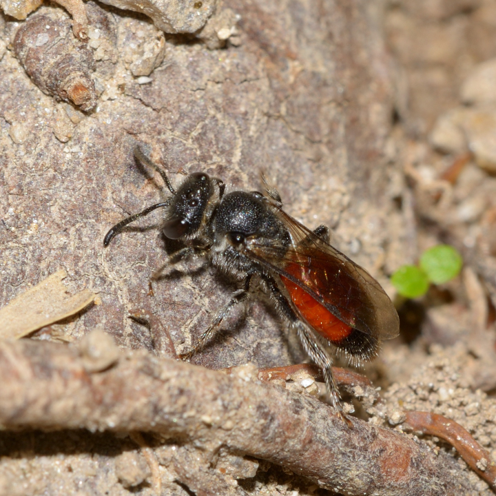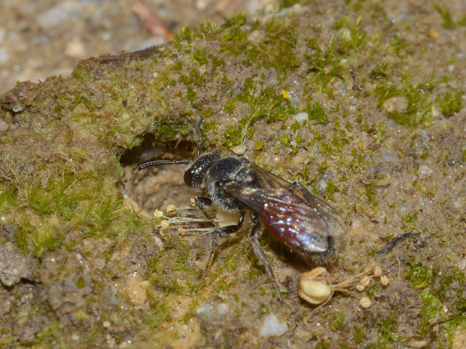 ヤドリコハナバチの一種 Sphecodes sp. 【体長】約7mm。 【発生期】春季に活動すると思われるが、詳細は不明。 【分布】不明。 小型のハナバチに労働寄生すると思われる。 地上で休むメス。 2013年4月28日、佐賀市。 小型のハナバチの巣穴を窺うメス。 2016年5月4日、佐賀市。