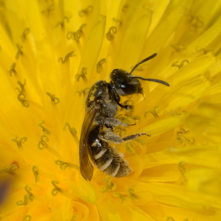 チビコハナバチの一種 Lasioglossum(Evylaeus) sp. 【体長】約5mm。 【発生期】春季。詳細は不明。 【分布】不明。 小型のコハナバチ。 地中に営巣し、花粉蜜を団子にして産卵すると思われる。 タンポポを訪花するメス。 2025年4月6日、兵庫県加古郡。