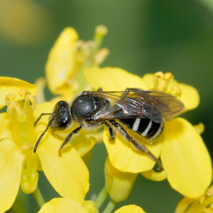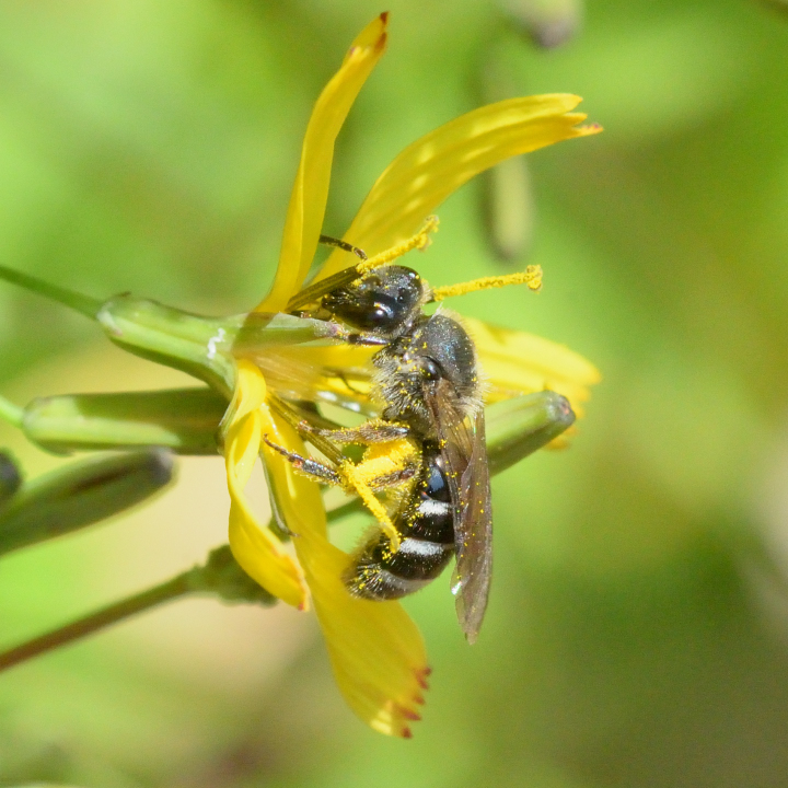 ズマルツヤコハナバチ Lasioglossum proximatum (Smith,1879) 【体長】メス8-9mm。オス7-8mm。 【発生期】メス3-10月。オス8-9月。 【分布】北海道、本州、四国、九州、対馬、屋久島、奄美諸島;極東ロシア、中国、朝鮮半島。 地中に営巣し、花粉蜜を団子にして産卵する。 写真は別の種かもしれない。 菜の花を訪花するメス。 2009年4月19日、佐賀市。 ニガナを訪花するメス。 2022年5月5日、佐賀市。