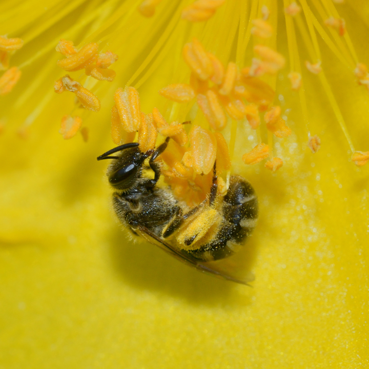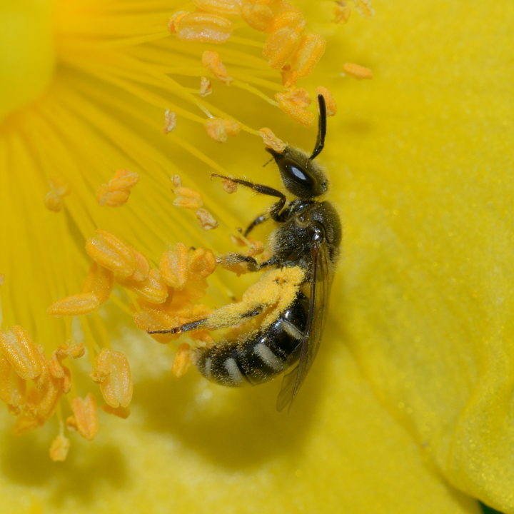 コハナバチの一種 Lasioglossum sp. 【体長】約7mm。 【発生期】春季-秋季と思われるが、不明。 【分布】不明。 地中に営巣し、花粉蜜を団子状に成形してに産卵すると思われるが、生態は不明。 キンシバイを訪花し、花粉と蜜を集めるメス。 2024年6月1日、兵庫県加古川市。 同じ日時と場所で。
