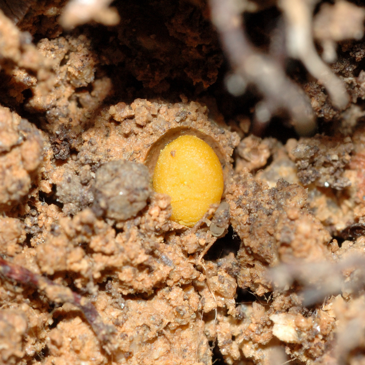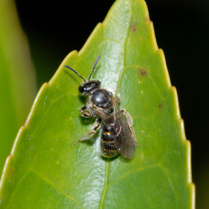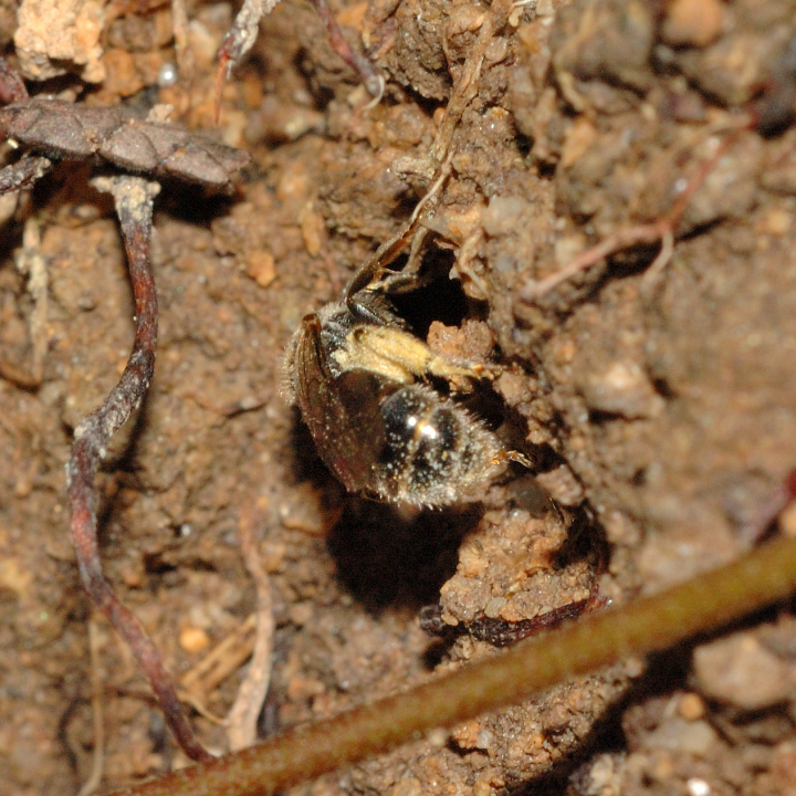 チビコハナバチの一種 Lasioglossum(Evylaeus) sp. 【体長】約5mm。 【発生期】春季。詳細は不明。 【分布】不明。 小型のコハナバチ。 地中に営巣し、花粉蜜を団子状に成形して産卵する。 ヒサカキの葉上で休むメス。 2010年4月25日、佐賀市。 崖の半日陰の地中に営巣する。 後肢に花粉を付けて巣穴に入るメス。 2006年5月14日、佐賀市。 地中の育房内の花粉団子。 団子の右下に、発掘の時に離れてしまった卵がある。